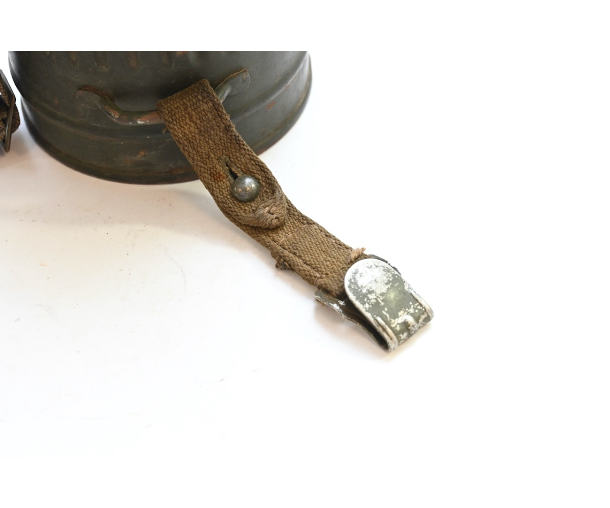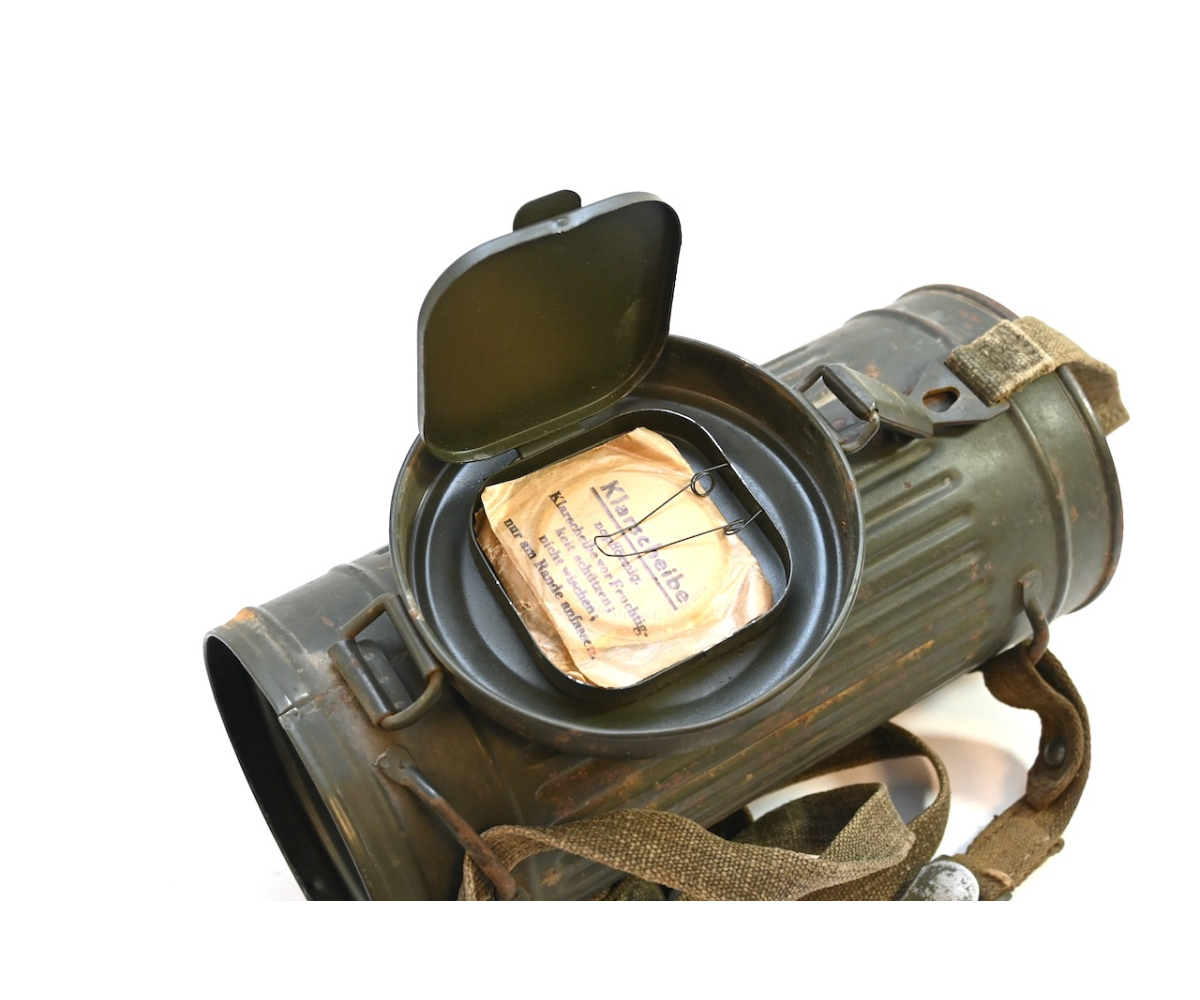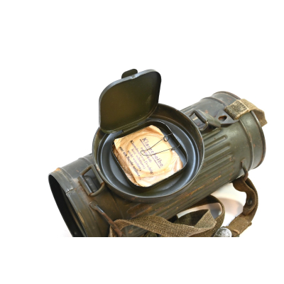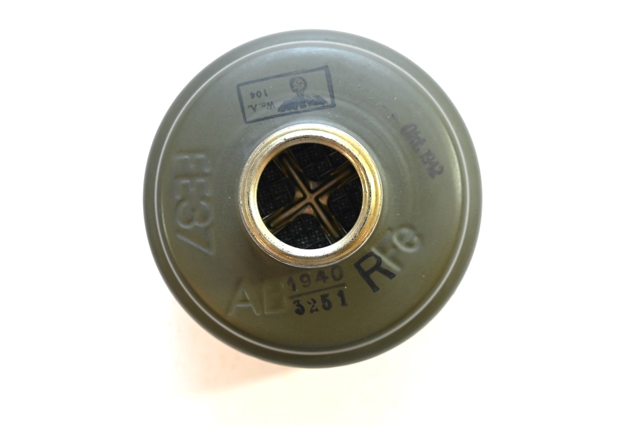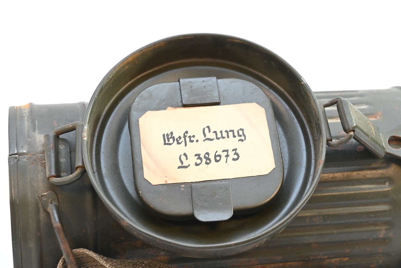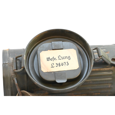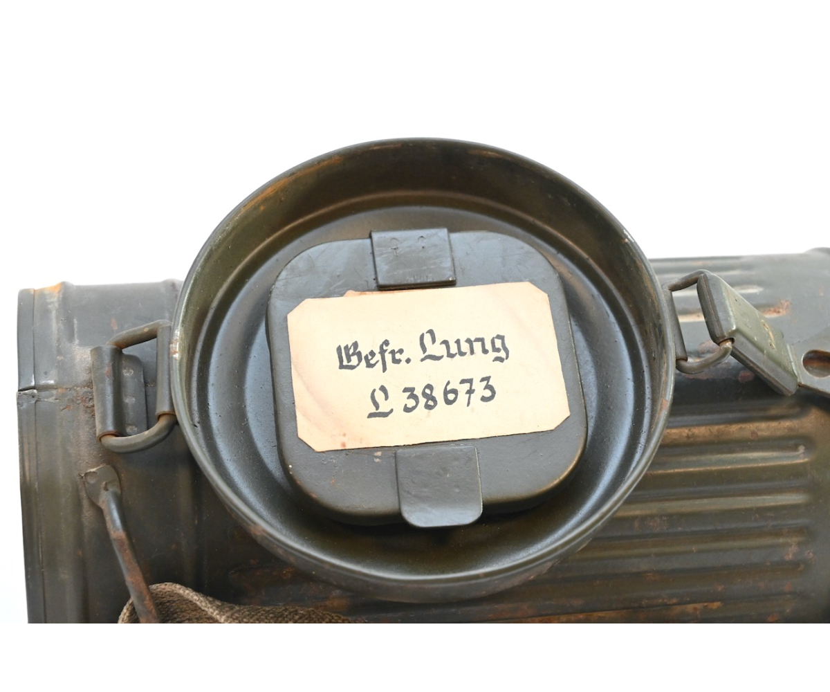 The gasmask is also in great condition. The Canvas is supple and it's complete with straps and filter. There is also a nametag of Lung attached to one of the straps. Both the gasmask (1942) and the filter (1942) are multiple marked. The set comes with it's retaining spring and cleaning cloth. Overall a very nice set!