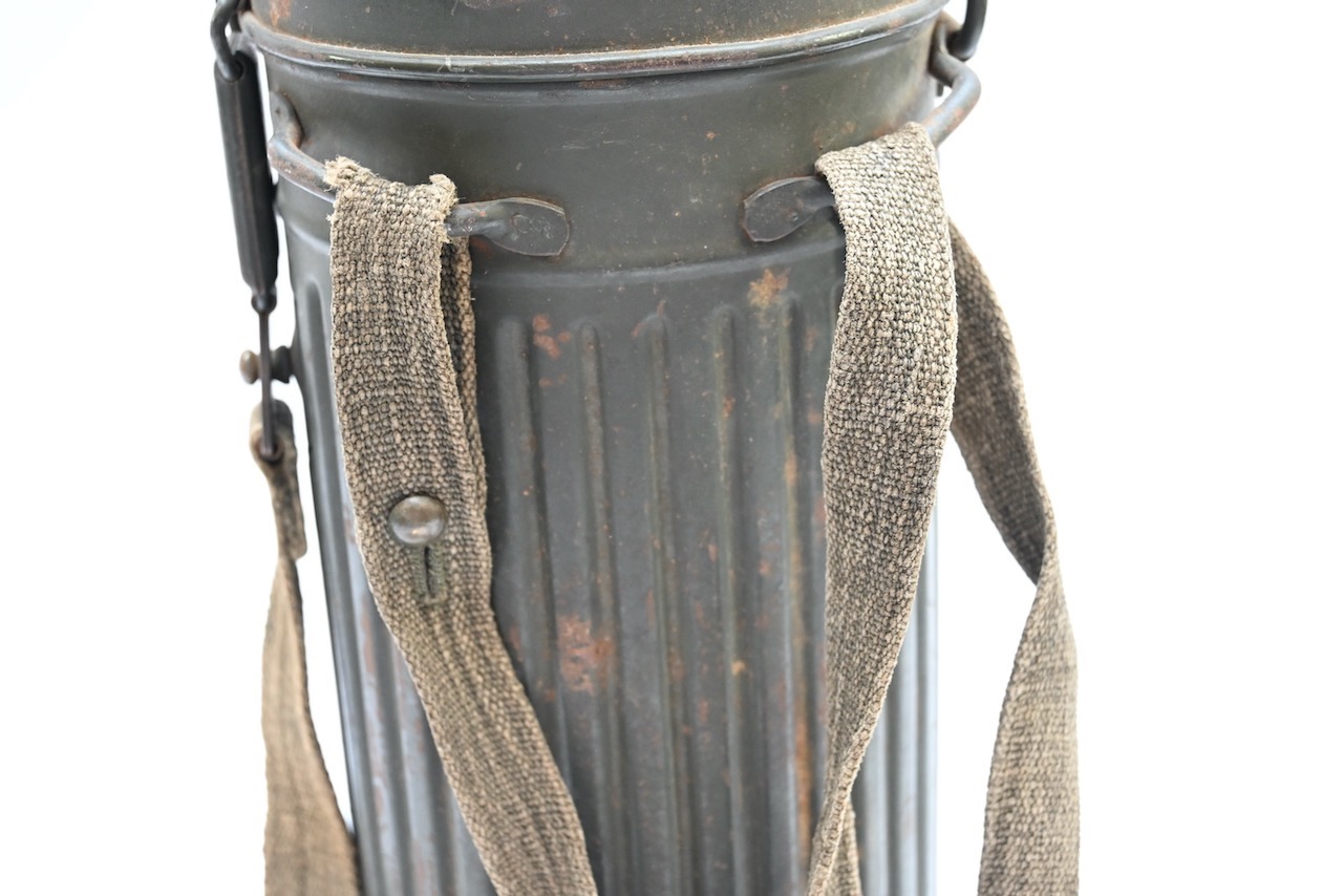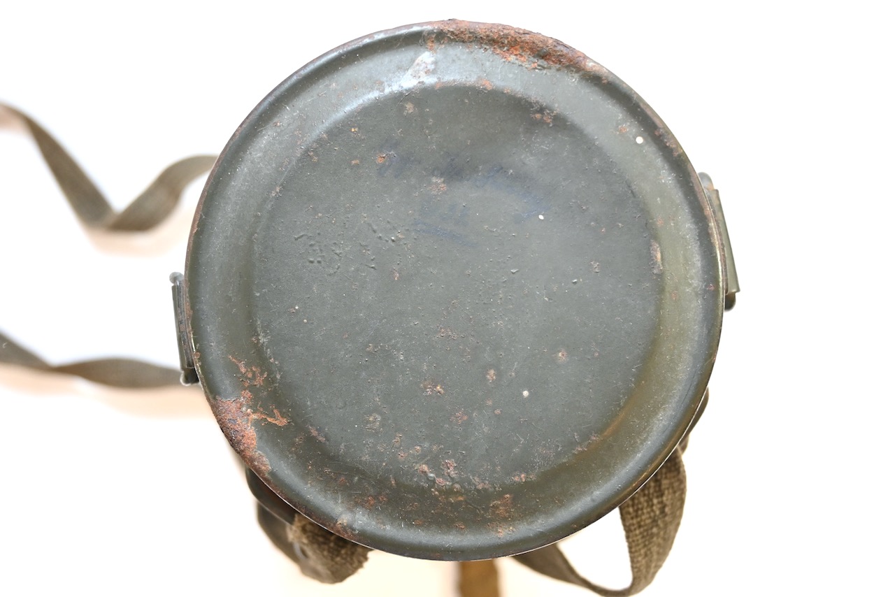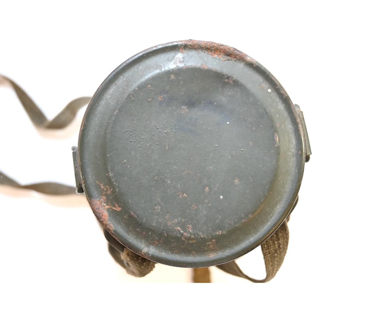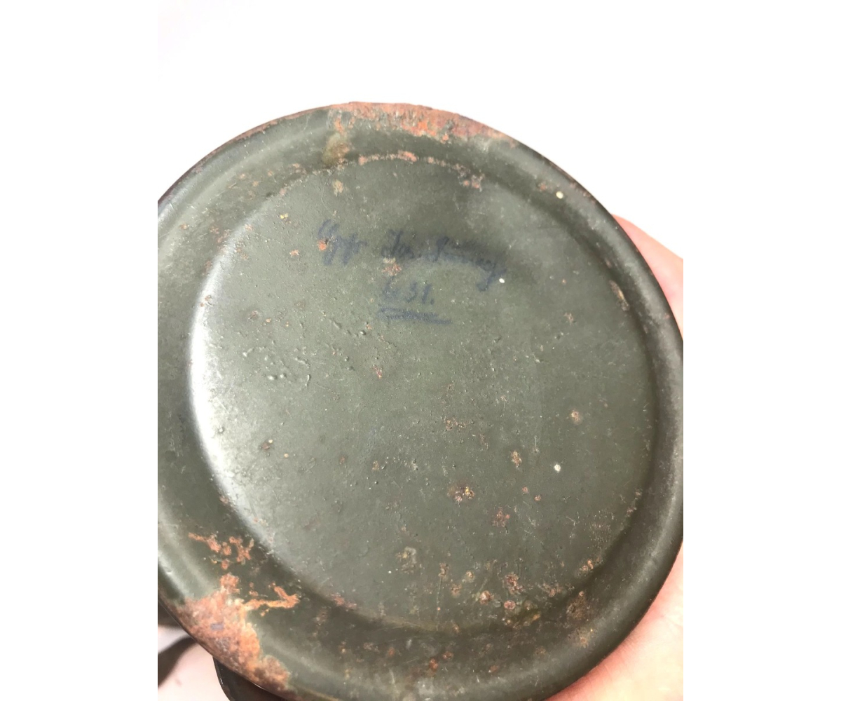 The overall condition of the set is excellent. It shows normal signs of use. The canister contains 95+% all of it it's original color. Complete with the long and short strap. The canister is maker marked frn42 which means it was produced in 1942. On the lid of the spare glasses there is a label that says Gefr.Lung (Gefreiter) and L38673 which is a Feldpostnummer and relates to the 3. Kompanie Luftgau-Nachrichten-Regiment 8. In November 1941 this regiment became Luftgau-Nachrichten-Regiment Kiew and in in September 1942 Luftgau-Nachrichten-Regiment Charkow. Lung also wrote his name on top of the canister with pencil.