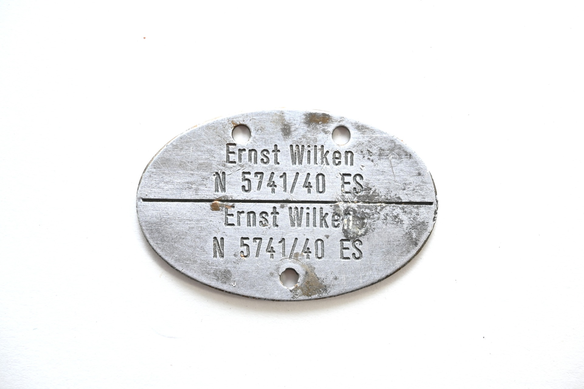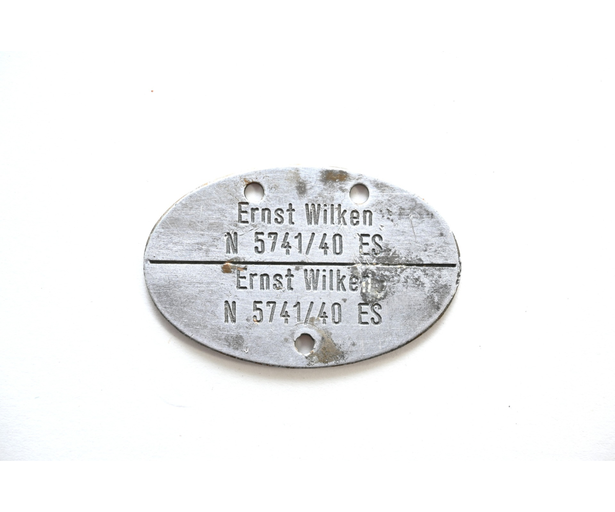 The tag shows overall normal signs of wear. It belonged to Ernst Wilken who served at the Marinestation Nordsee. The 'ES’ means 'Ergänzungssoldat seemännische Laufbahn'. The '40 ' means that Ernst was drafted in 1940.