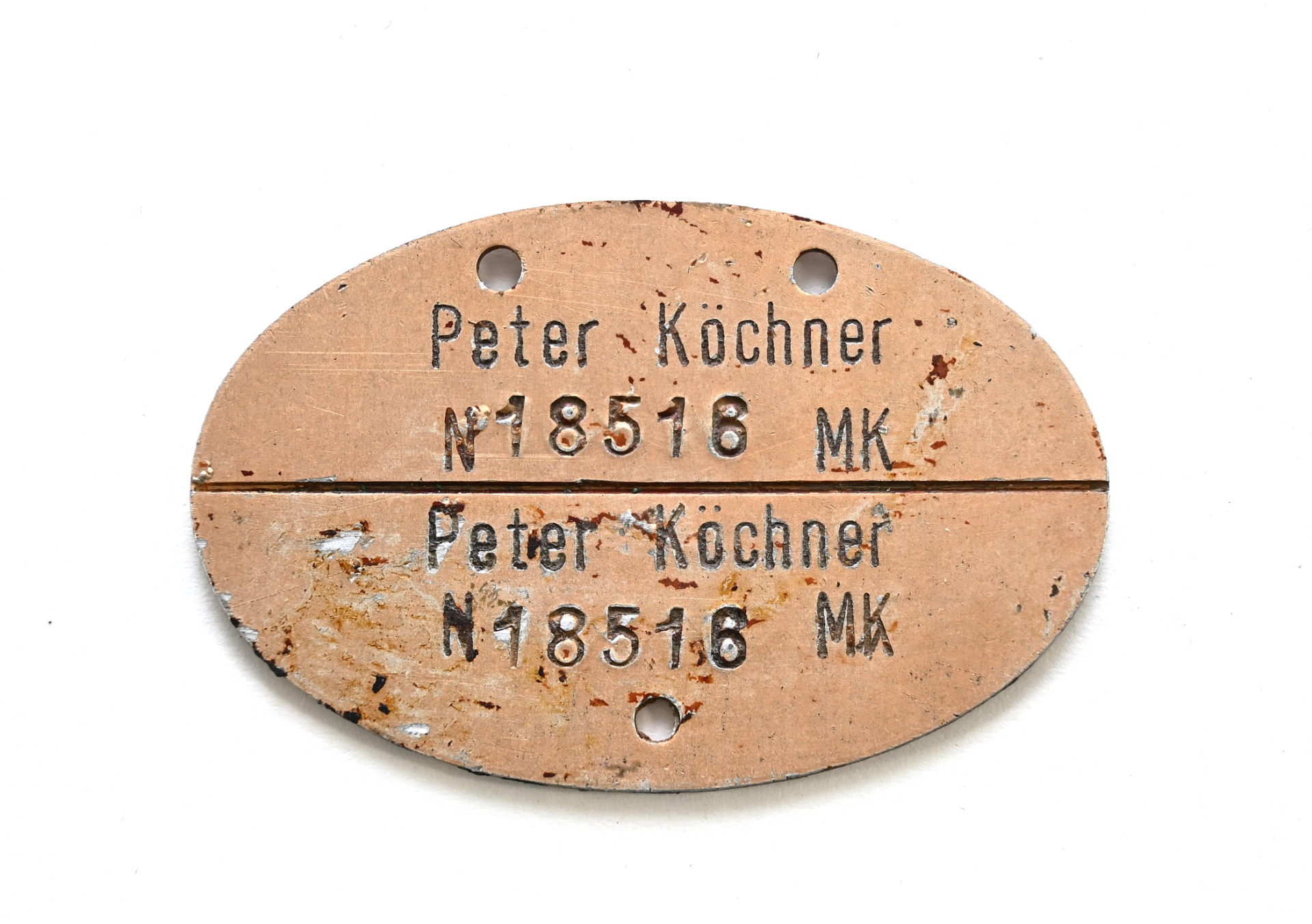 The tag shows overall signs of wear. It's broken, but both pieces are solid. It belonged to Peter Köchner who served at the Marinestation Nordsee. The 'MK’ means 'Mobilisiert für die Laufbahn XIV,XV and XVII'. This means he could have been schooled for the Marineartillerie, Kraftfahrer or Waffenwart.