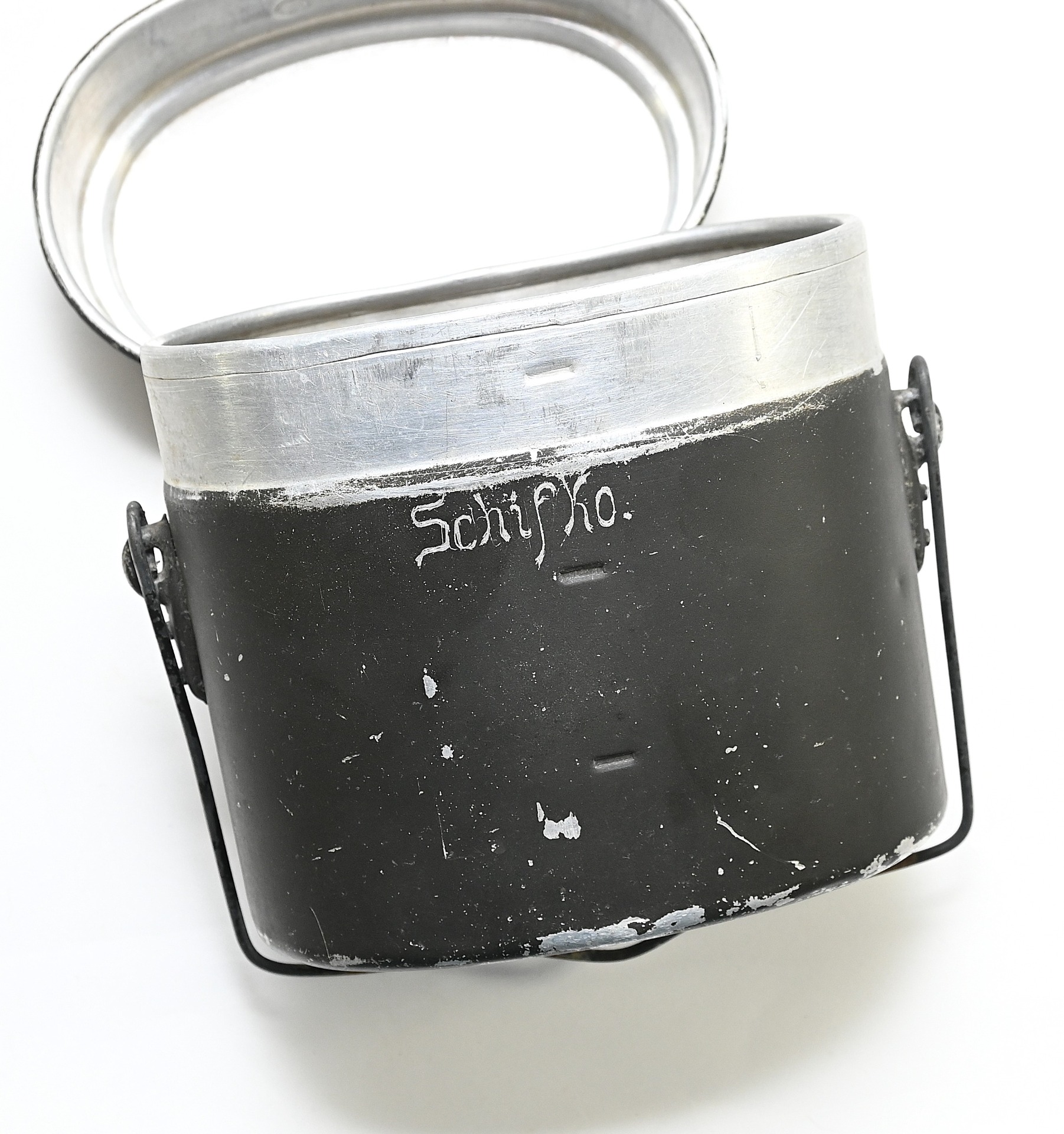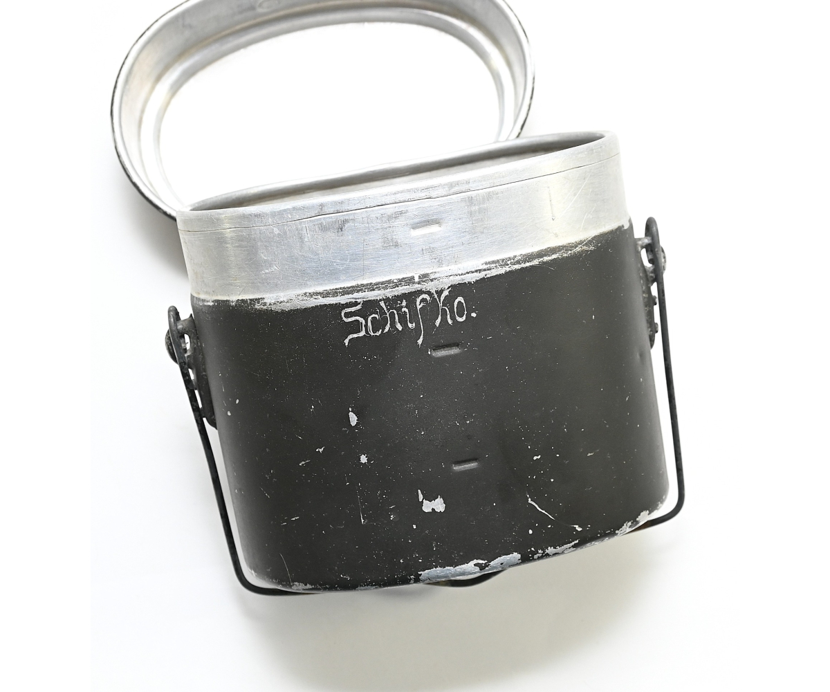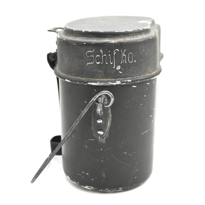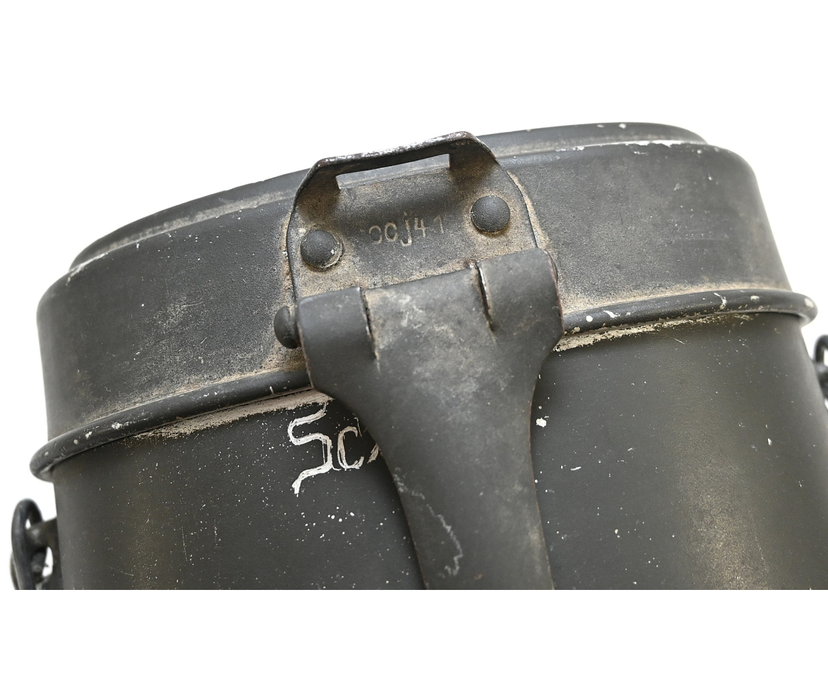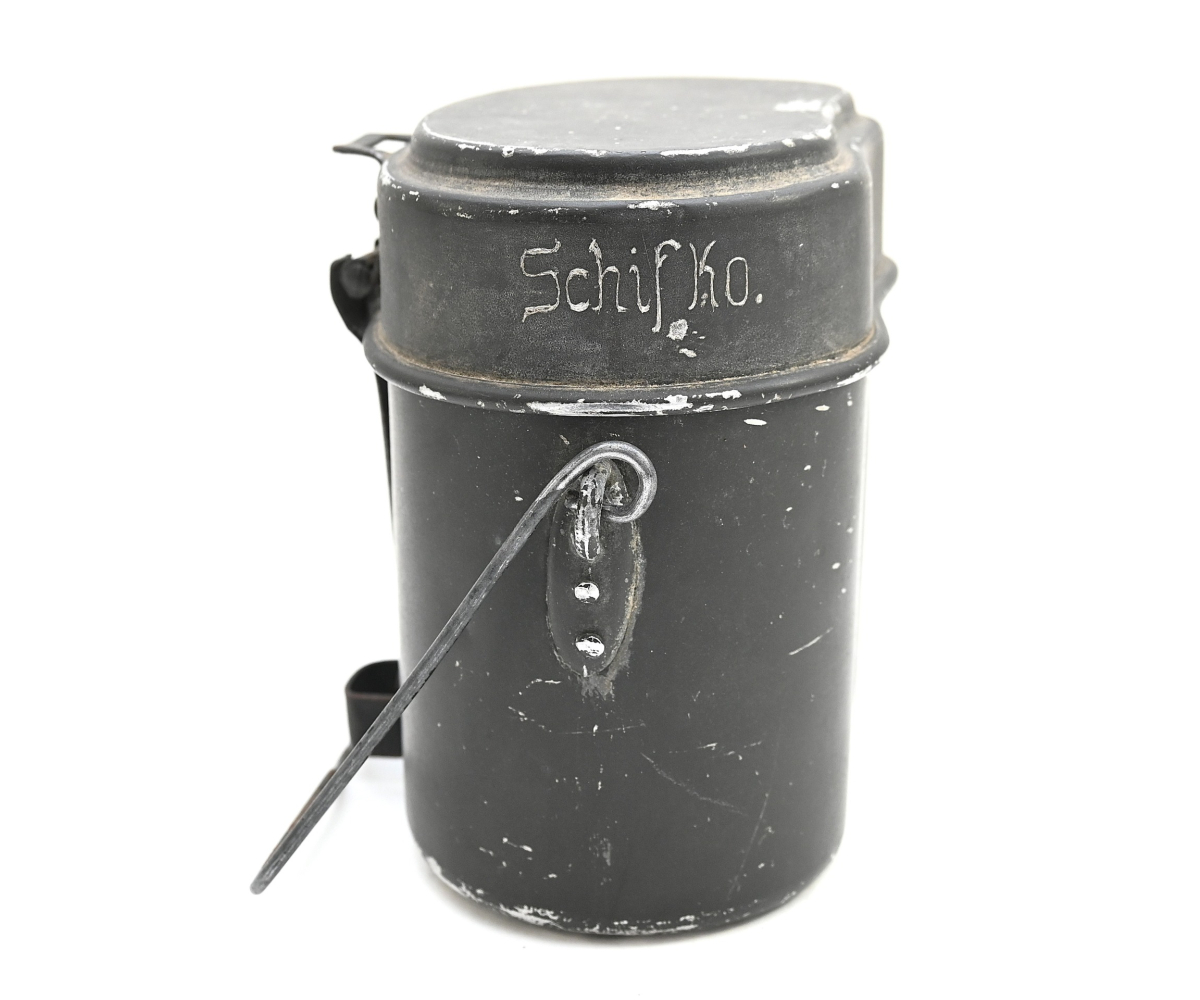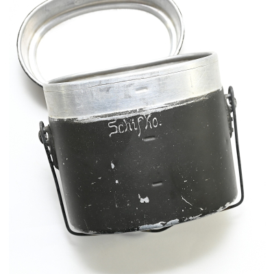 The mess kit or 'Kochgeschirr' shows overall normal signs of wear. Around 90% of its original green color is still present. Top and bottom are maker matching with 'ccj41'. Both parts are named Schiffko.