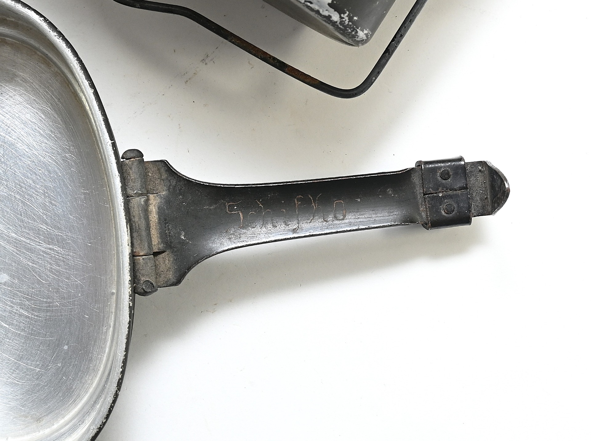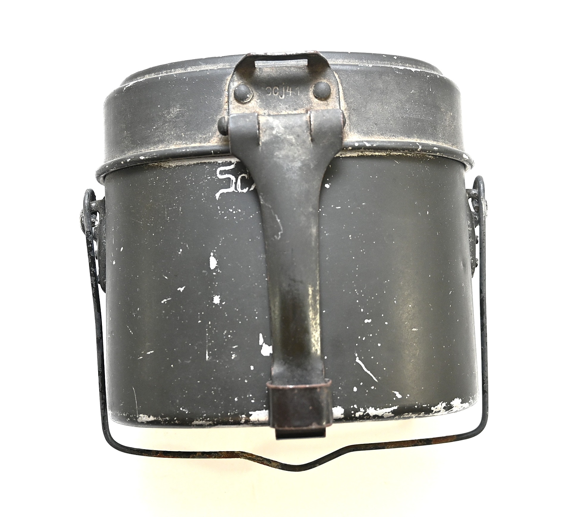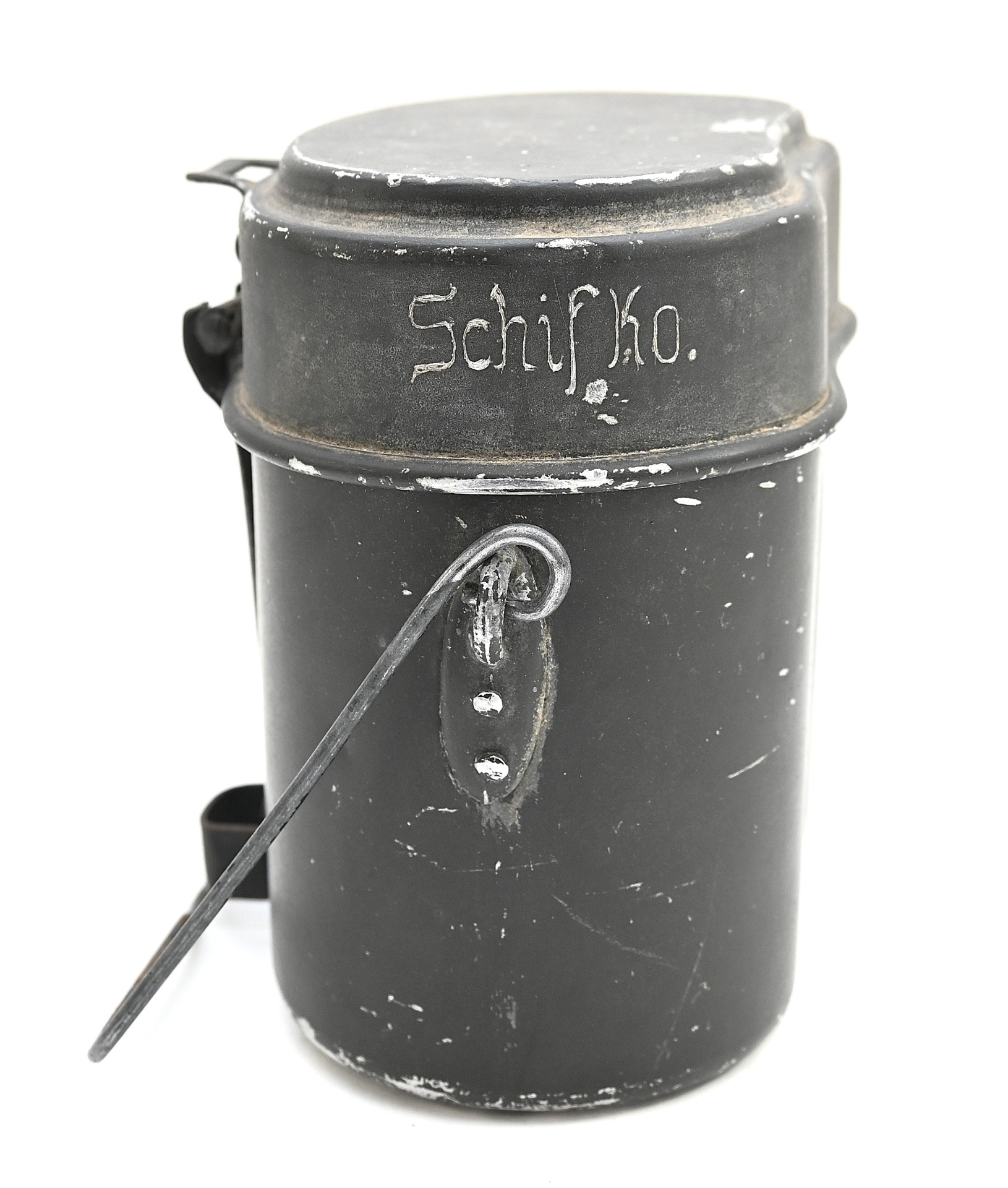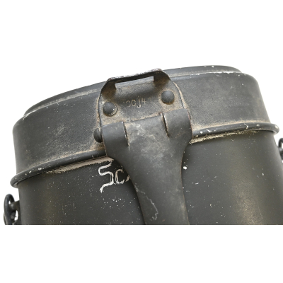 The mess kit or 'Kochgeschirr' shows overall normal signs of wear. Around 90% of its original green color is still present. Top and bottom are maker matching with 'ccj41'. Both parts are named Schiffko.