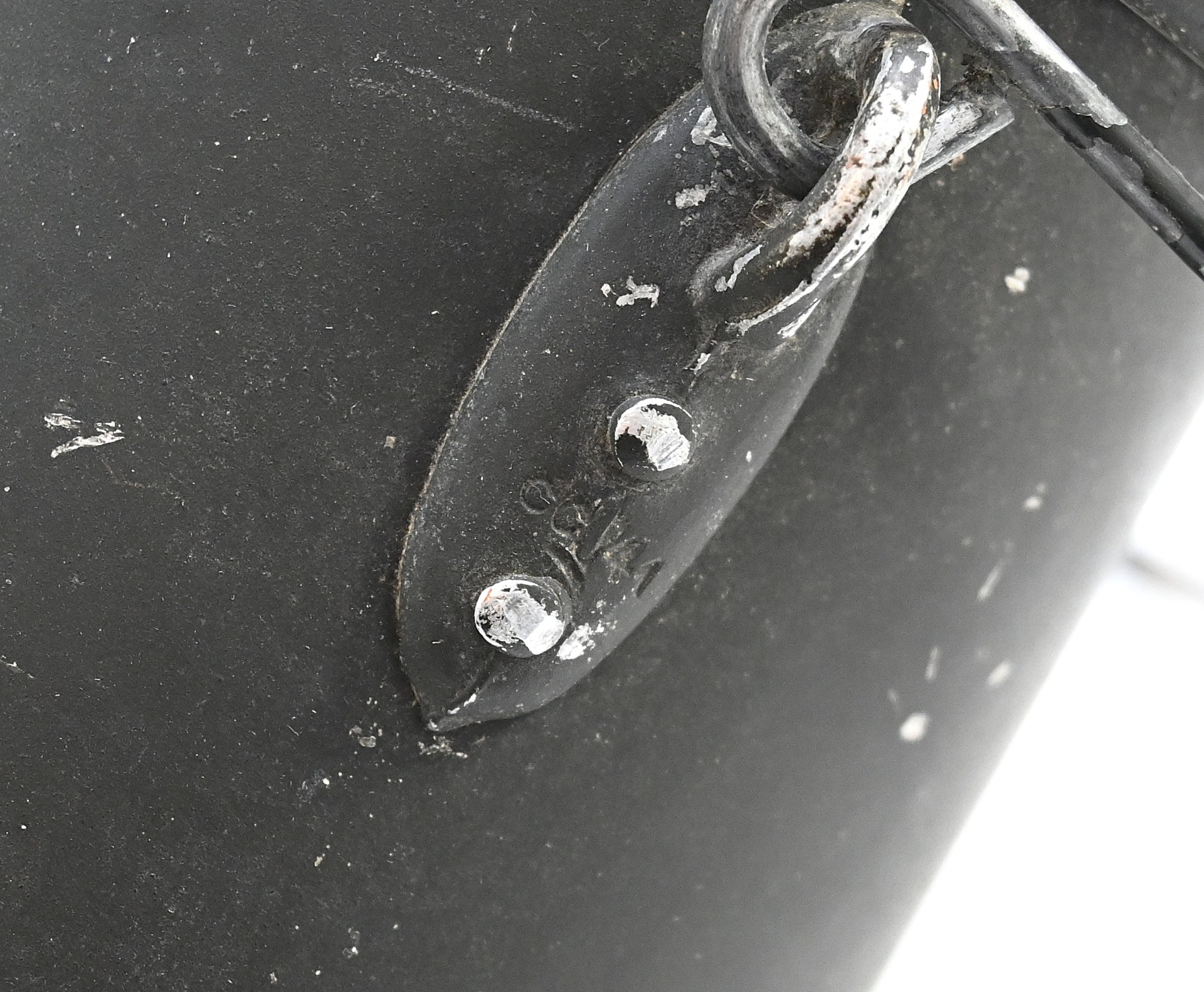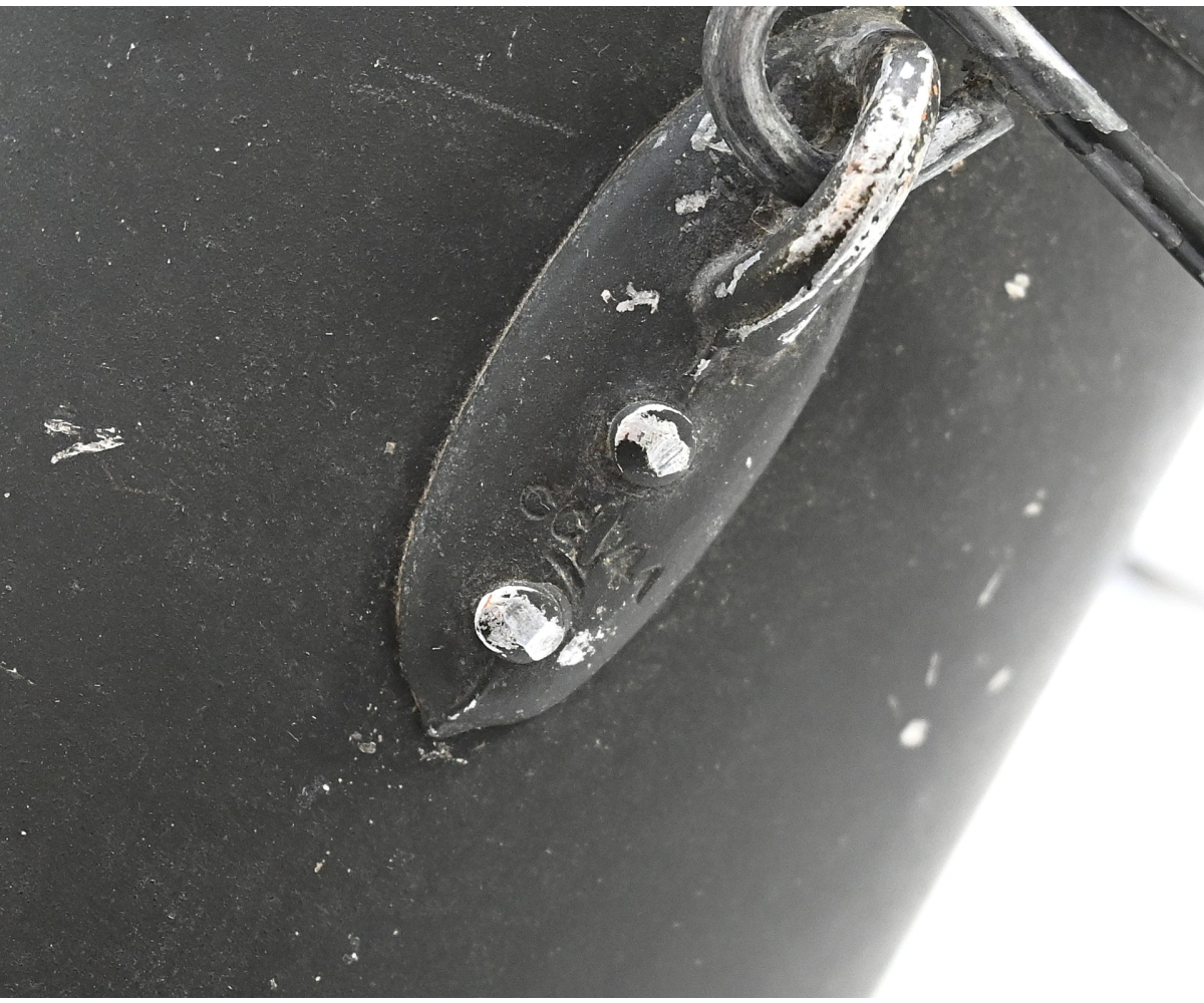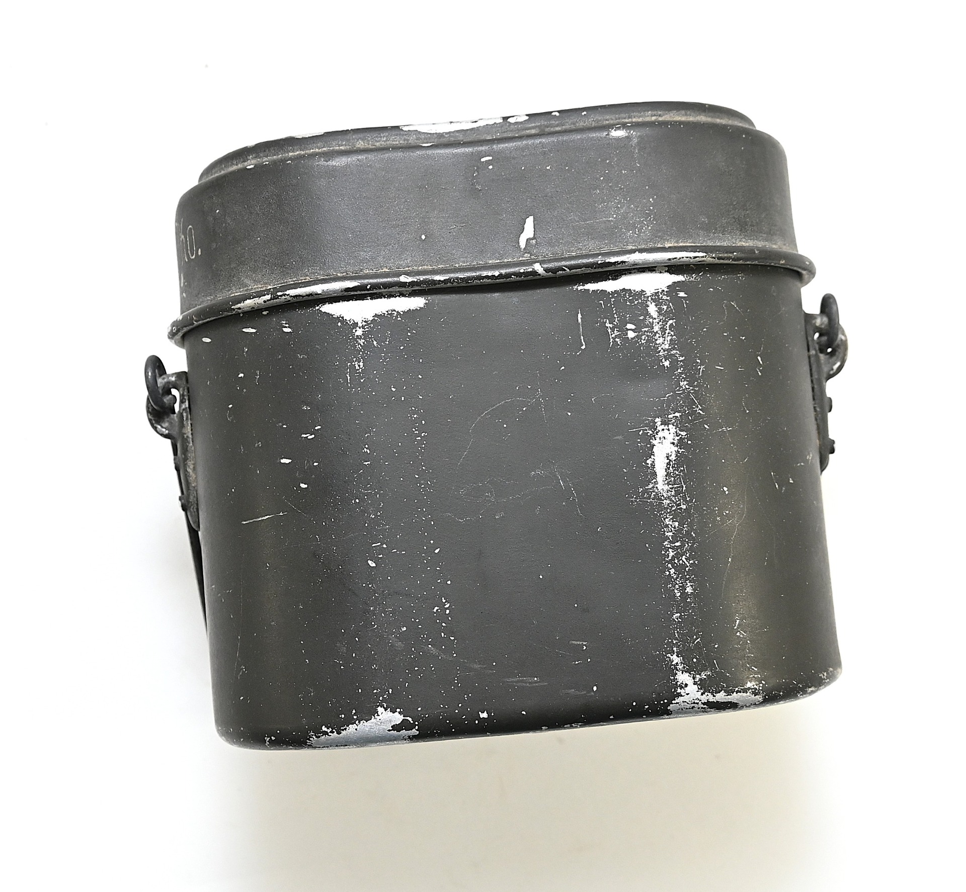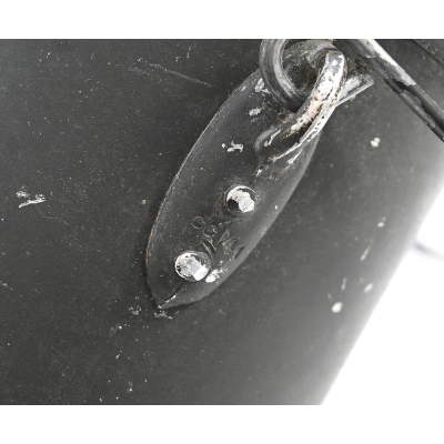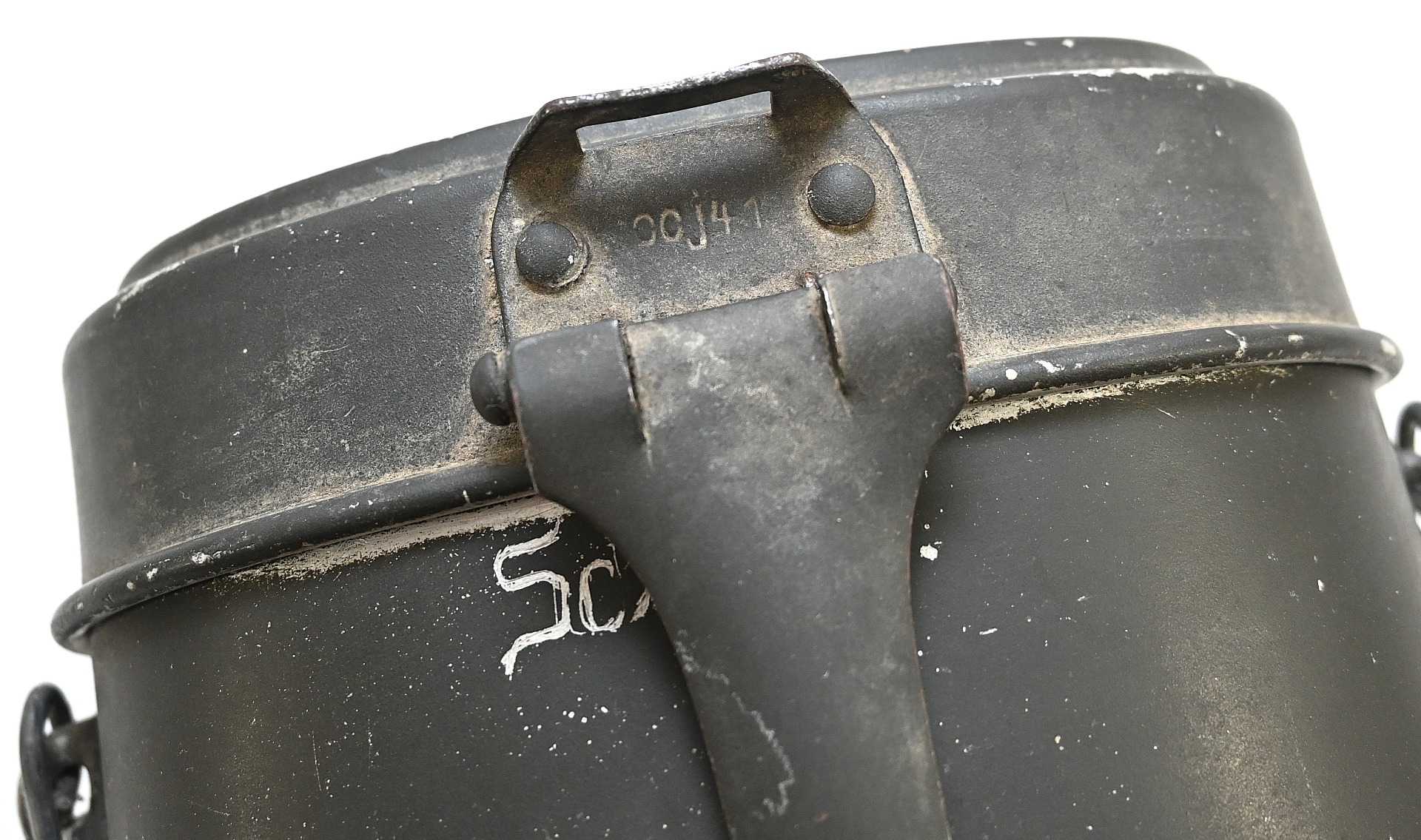 The mess kit or 'Kochgeschirr' shows overall normal signs of wear. Around 90% of its original green color is still present. Top and bottom are maker matching with 'ccj41'. Both parts are named Schiffko.