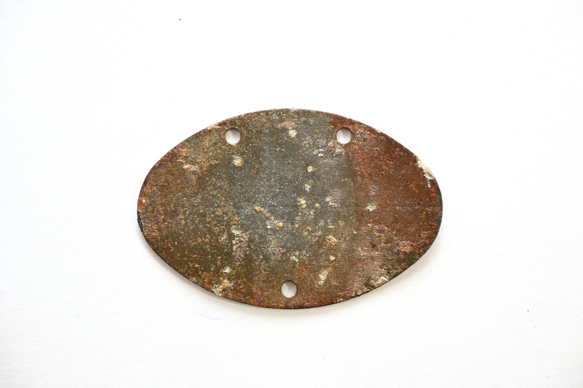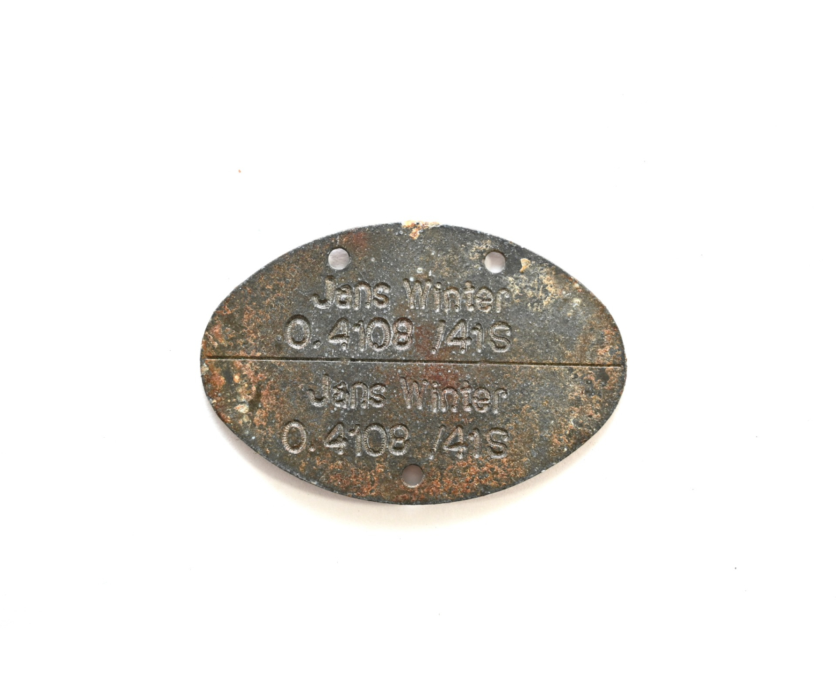 The tag or 'Erkennungsmarke' shows overall signs of wear, but is solid. It belonged to Jans Winter who served at the Marinestation Ostsee. The 'S’ means 'Seemannischen dienst'. The number 41 stands for the year Karl enlisted, 1941.