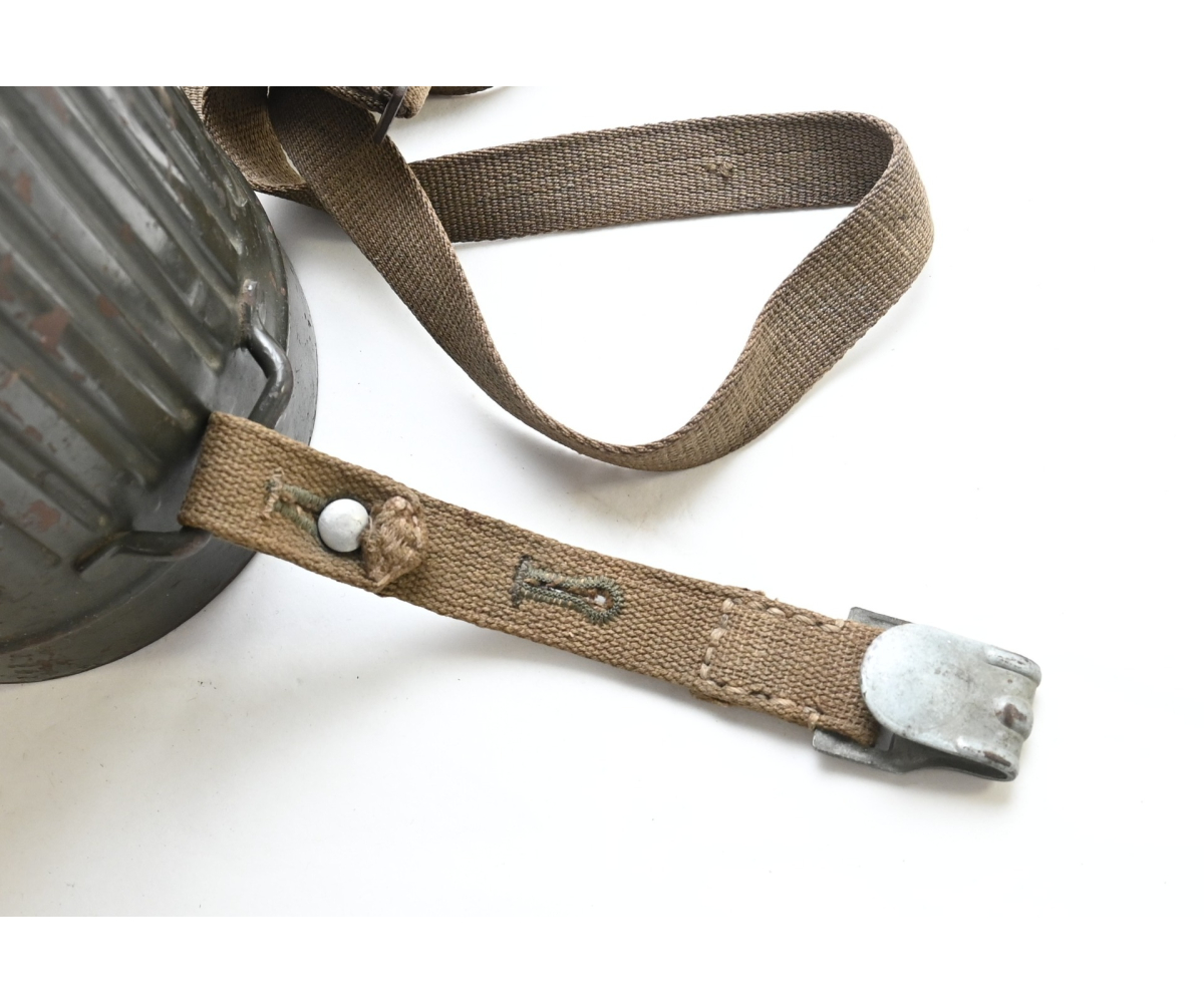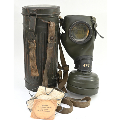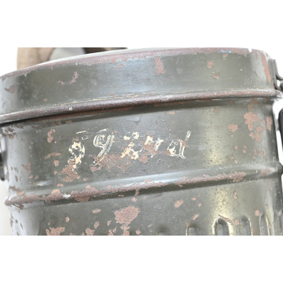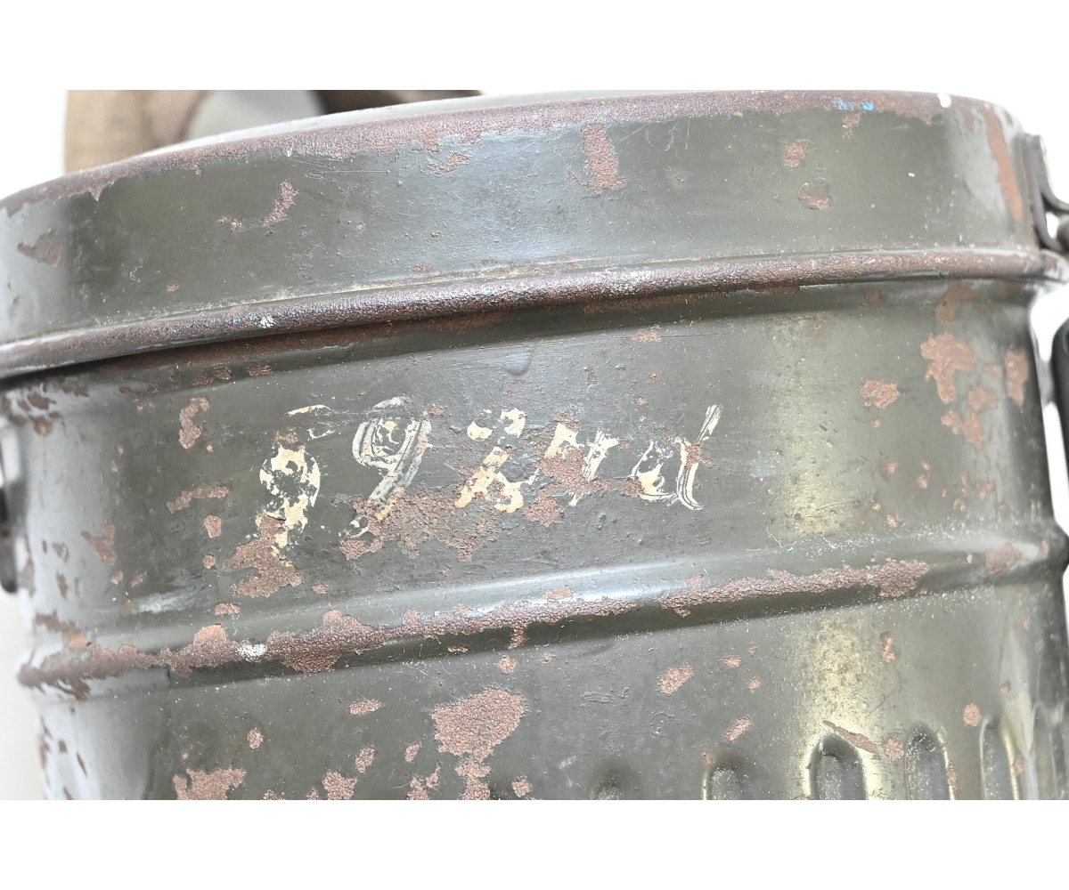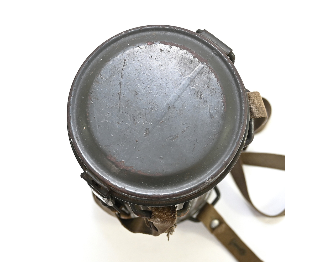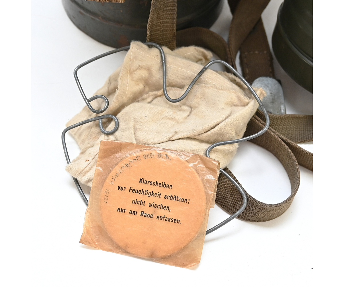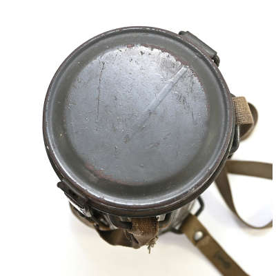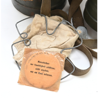 The overall condition of the set is very nice. It shows normal signs of use. The canister contains 90% of its original color. It's dated 1940 on the lid for the spare glasses and the nametag reads Oberfeldwebel Friedrich Wackler. Its complete with a long and short strap (1937). The gasmask is in absolute top condition and is the harder to find green rubber variant. It's complete with filter, all the straps and multiple markings. The set comes with spare glasses, a retaining spring and it's often missing cloth.