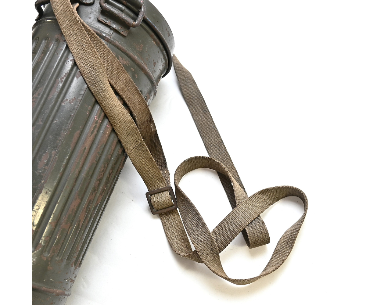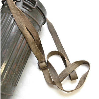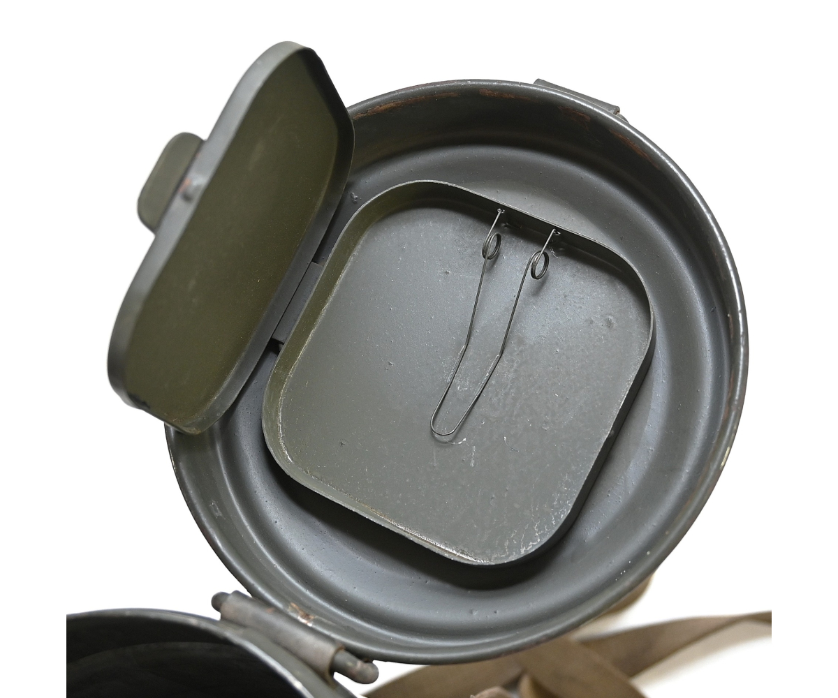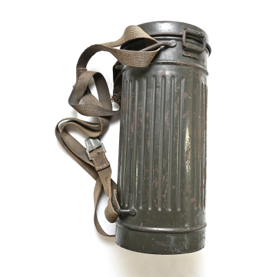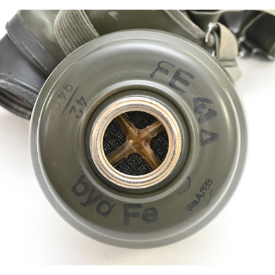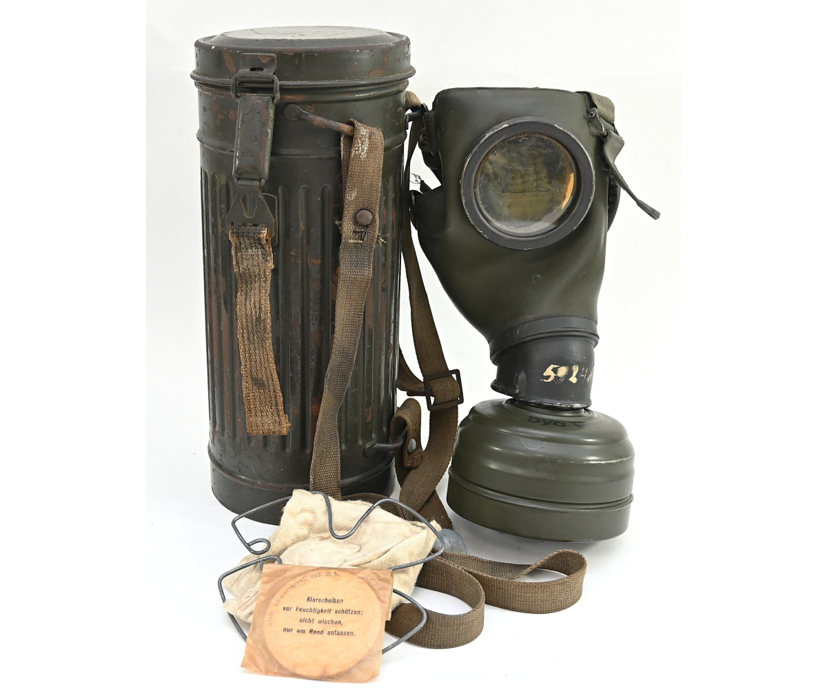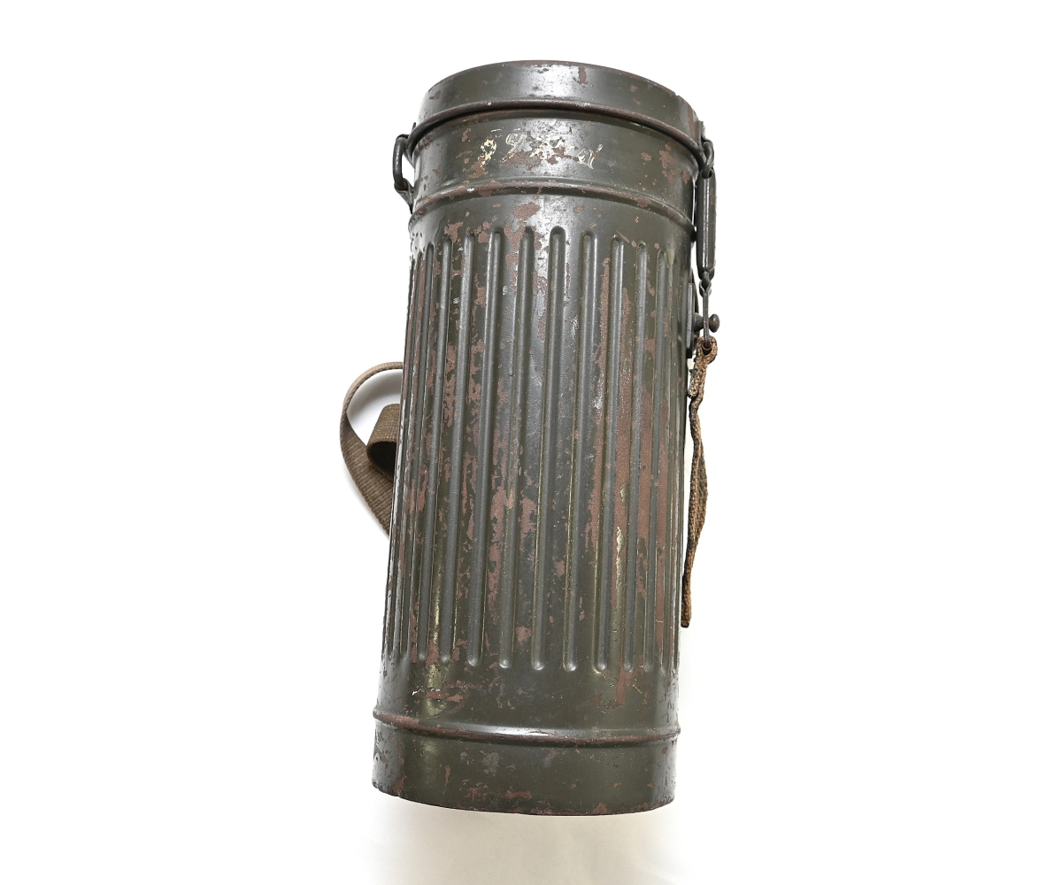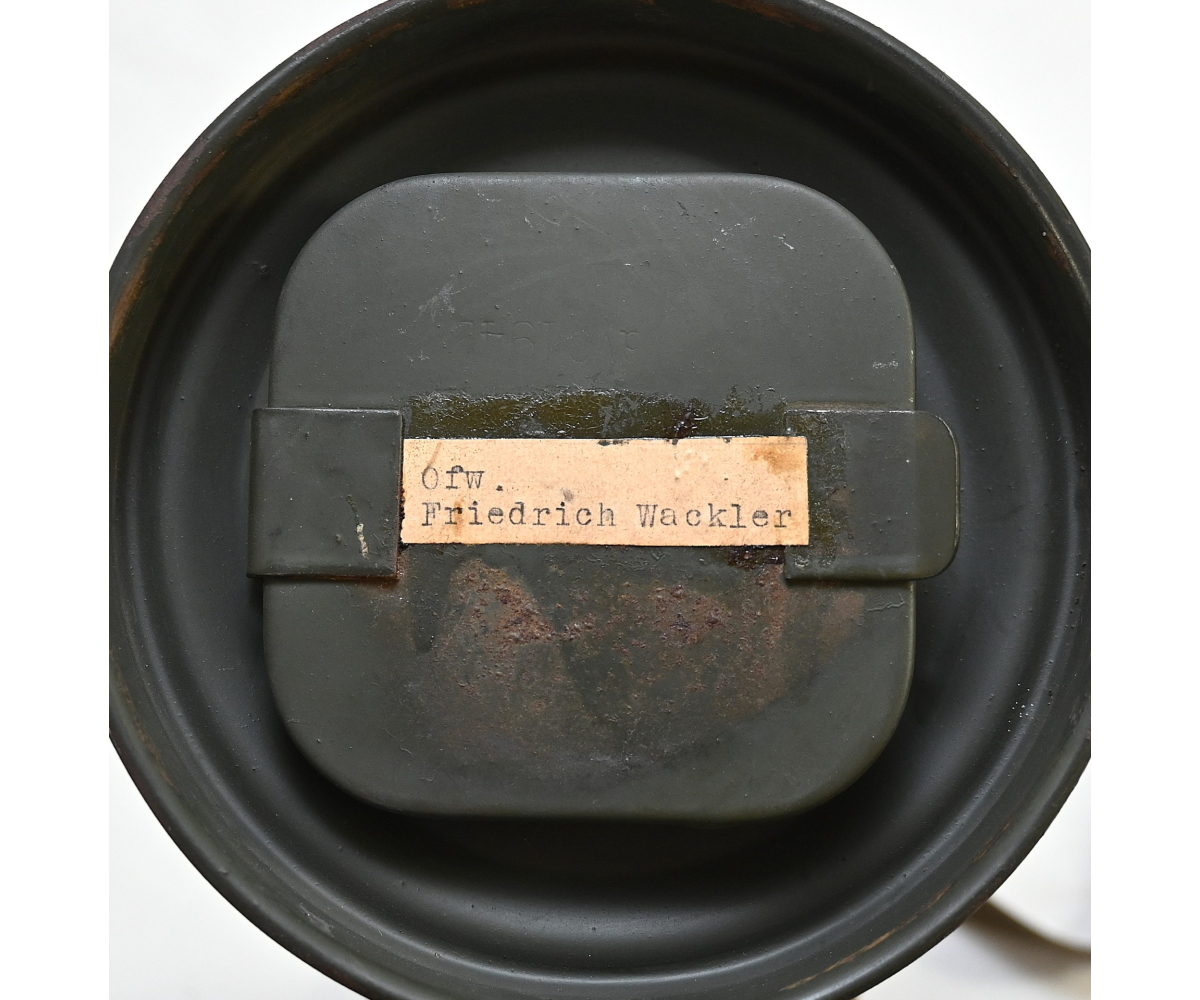The overall condition of the set is very nice. It shows normal signs of use. The canister contains 90% of its original color. It's dated 1940 on the lid for the spare glasses and the nametag reads Oberfeldwebel Friedrich Wackler. Its complete with a long and short strap (1937). The gasmask is in absolute top condition and is the harder to find green rubber variant. It's complete with filter, all the straps and multiple markings. The set comes with spare glasses, a retaining spring and it's often missing cloth.