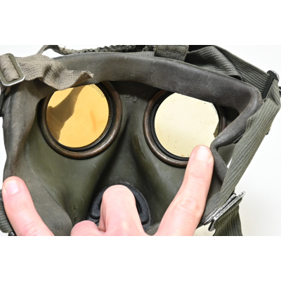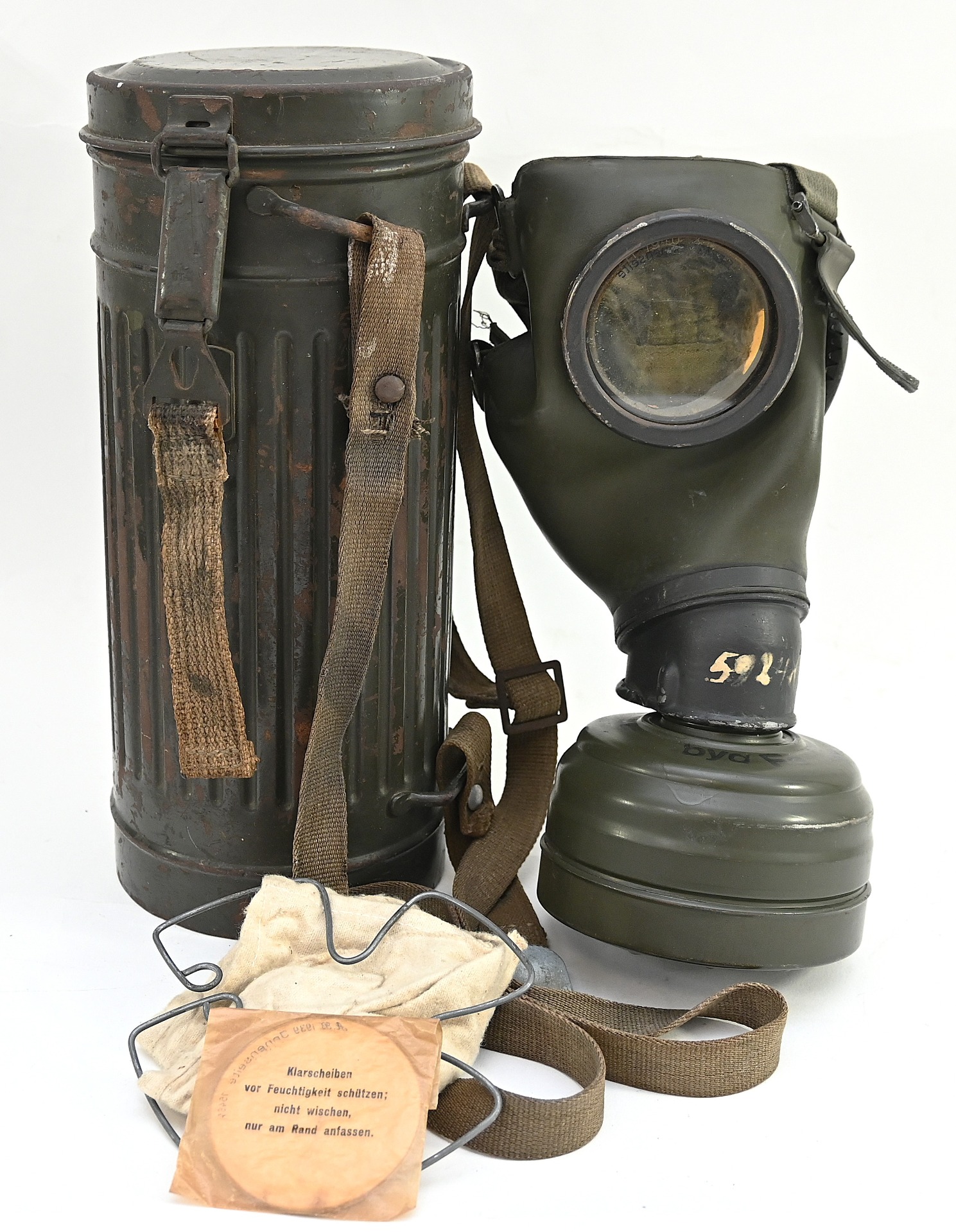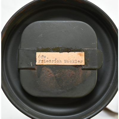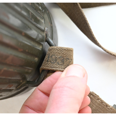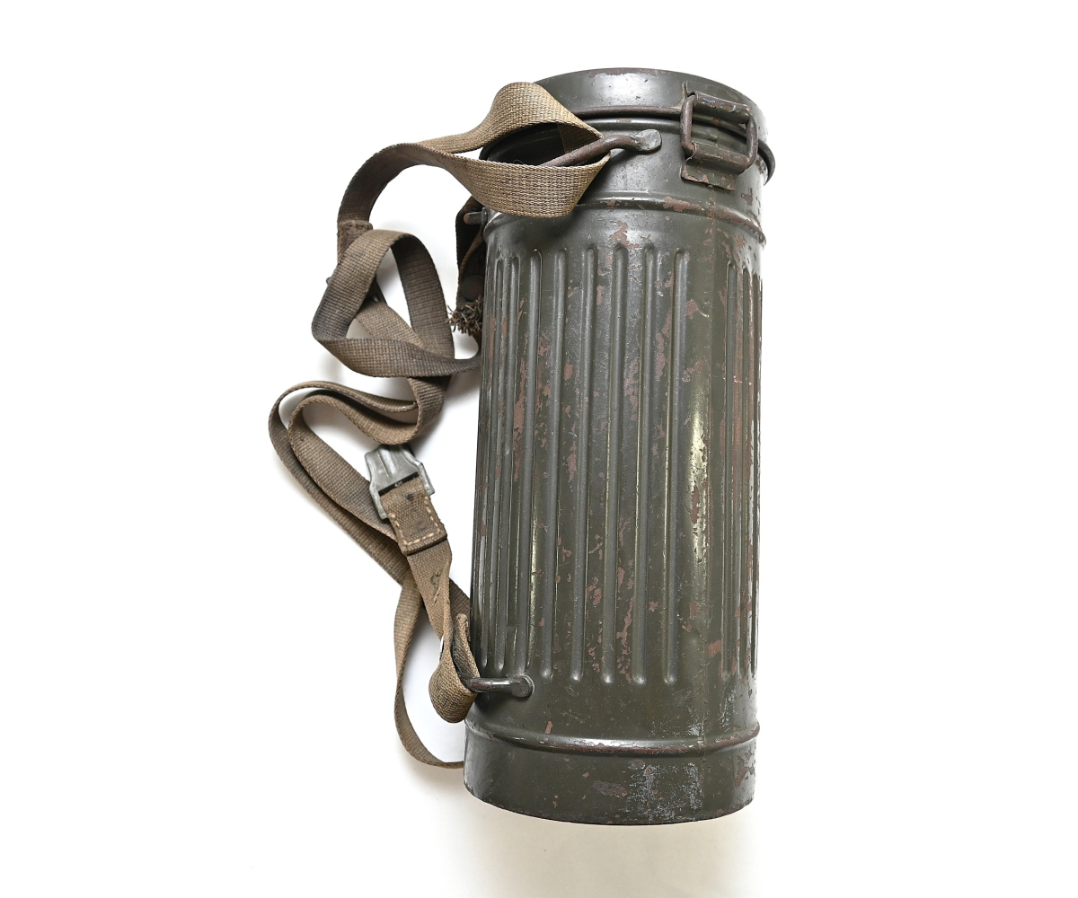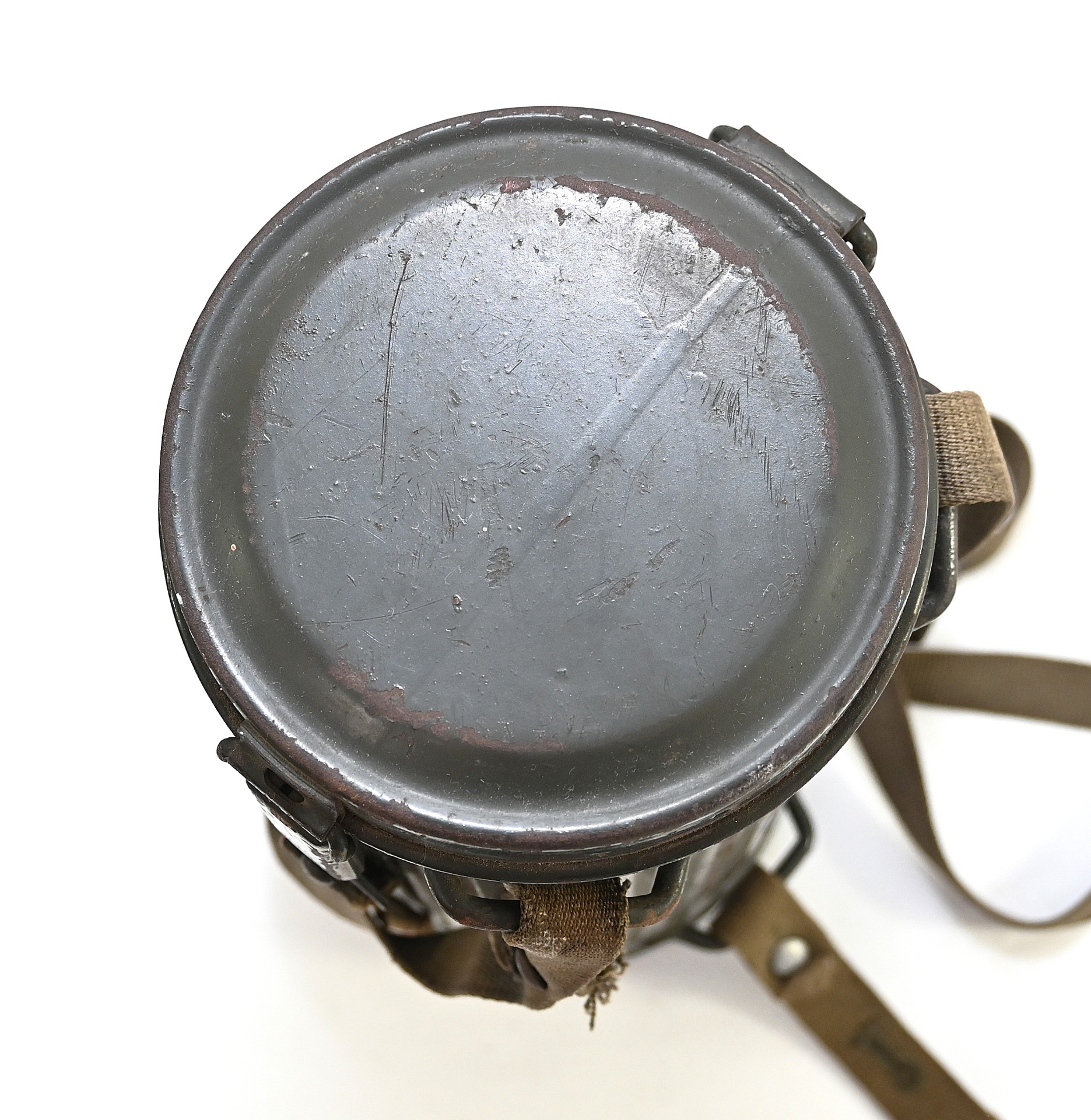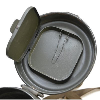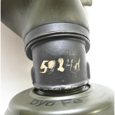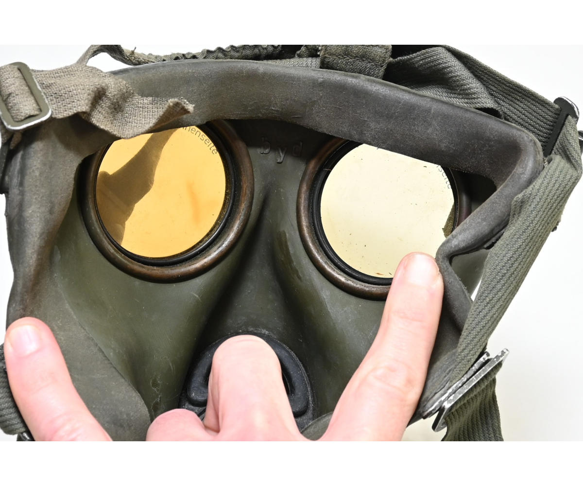 The overall condition of the set is very nice. It shows normal signs of use. The canister contains 90% of its original color. It's dated 1940 on the lid for the spare glasses and the nametag reads Oberfeldwebel Friedrich Wackler. Its complete with a long and short strap (1937). The gasmask is in absolute top condition and is the harder to find green rubber variant. It's complete with filter, all the straps and multiple markings. The set comes with spare glasses, a retaining spring and it's often missing cloth.