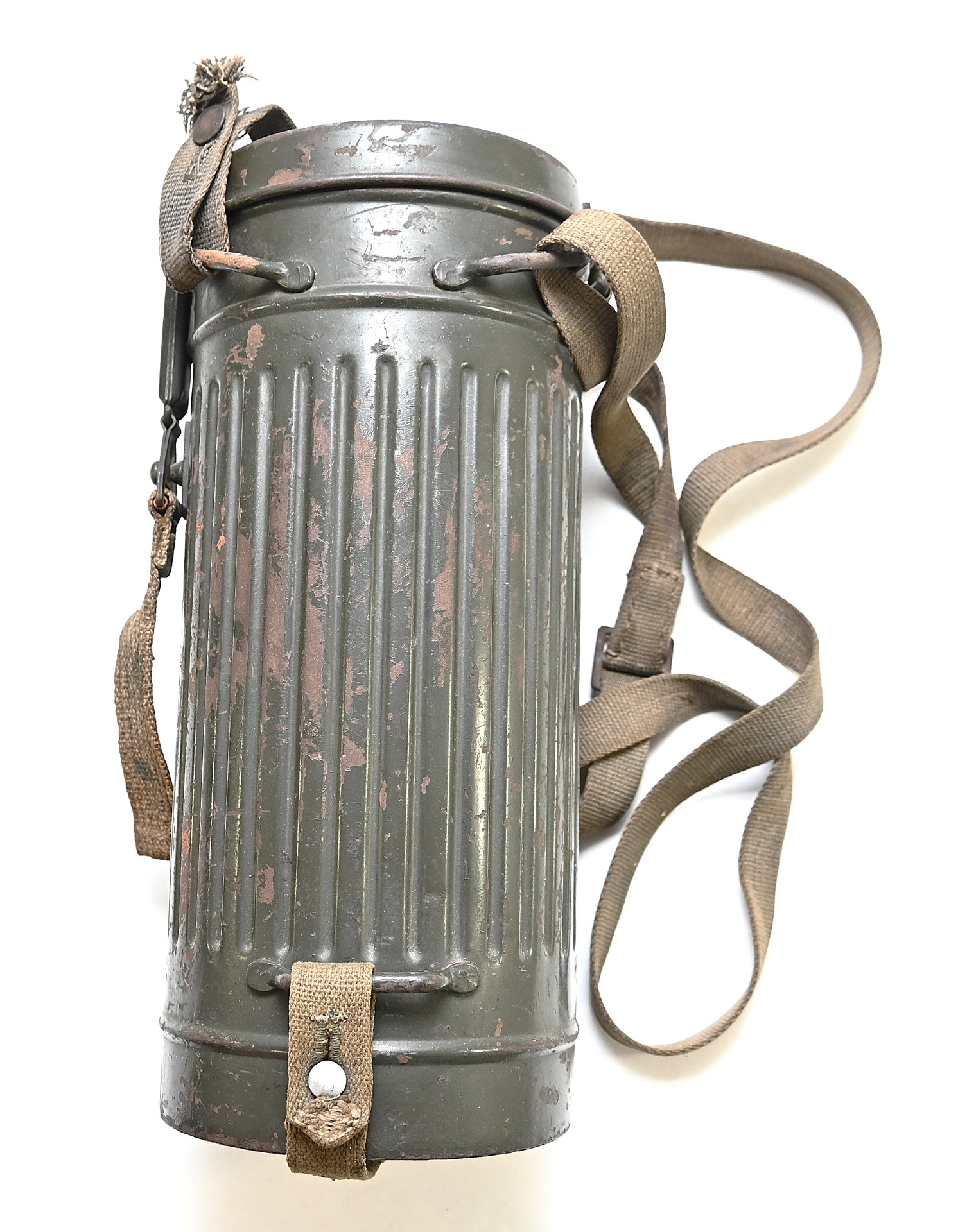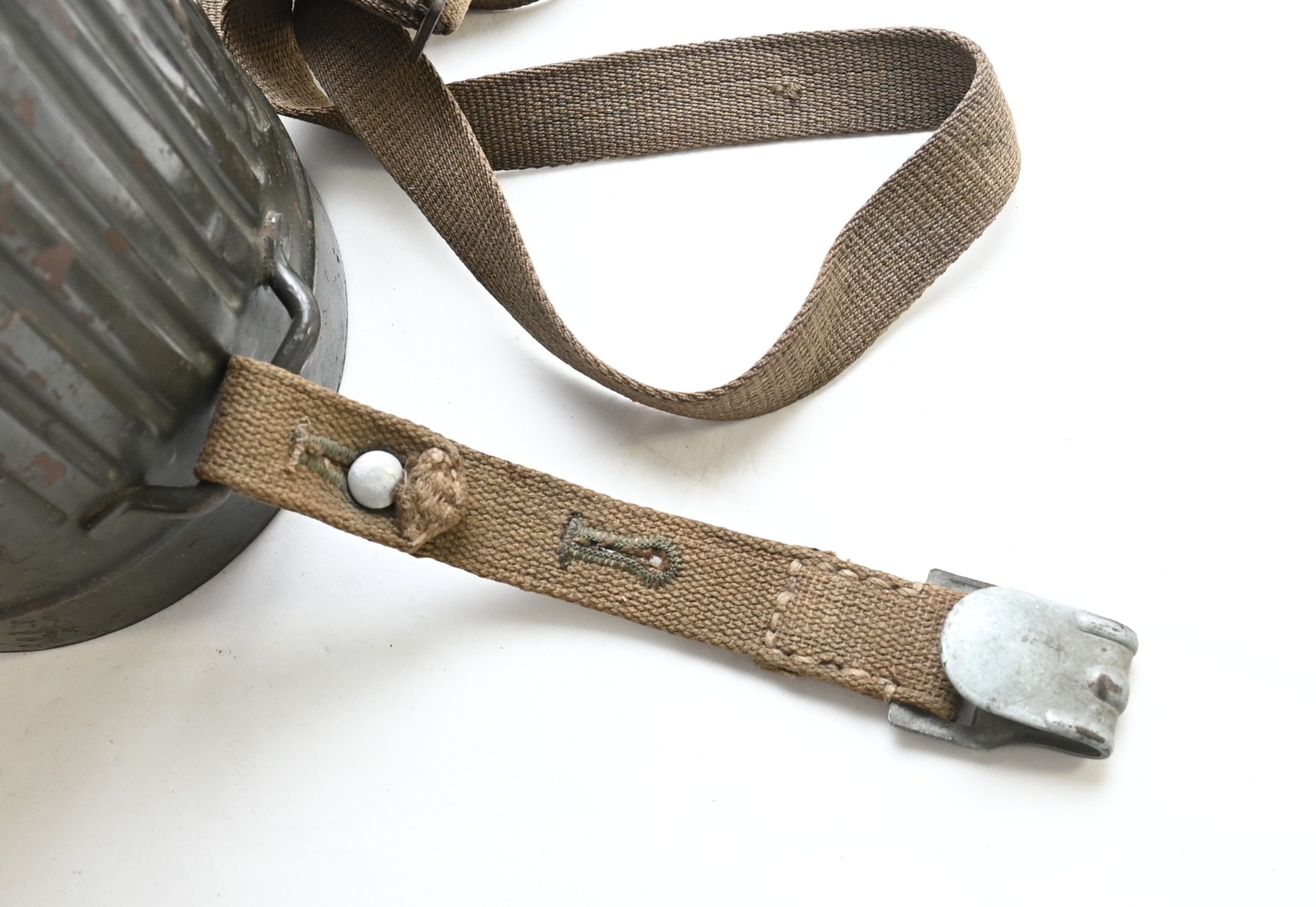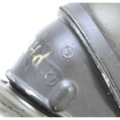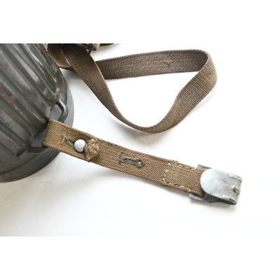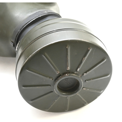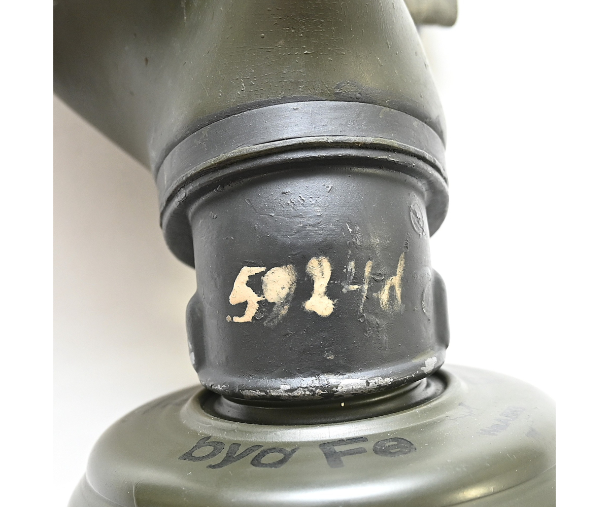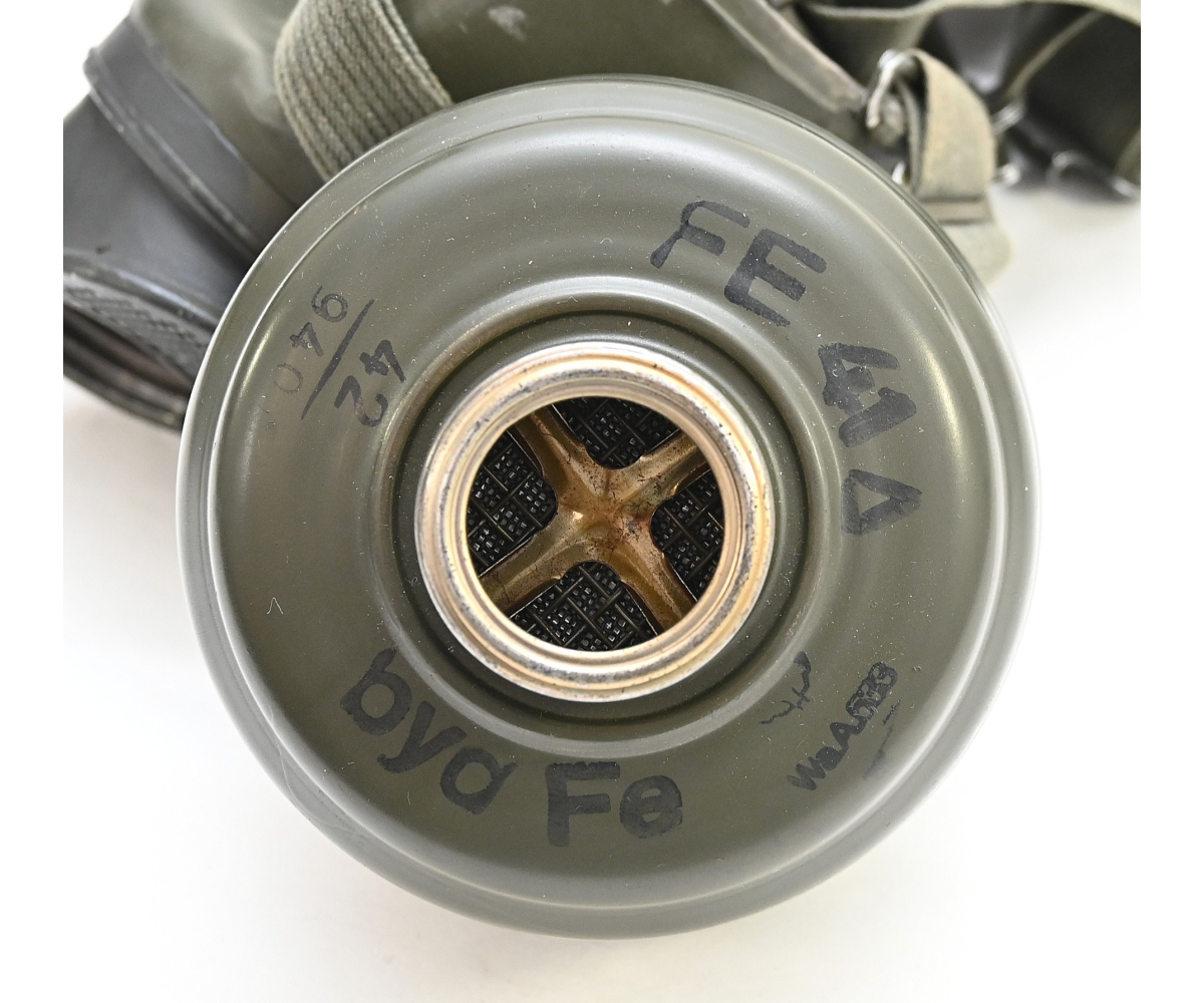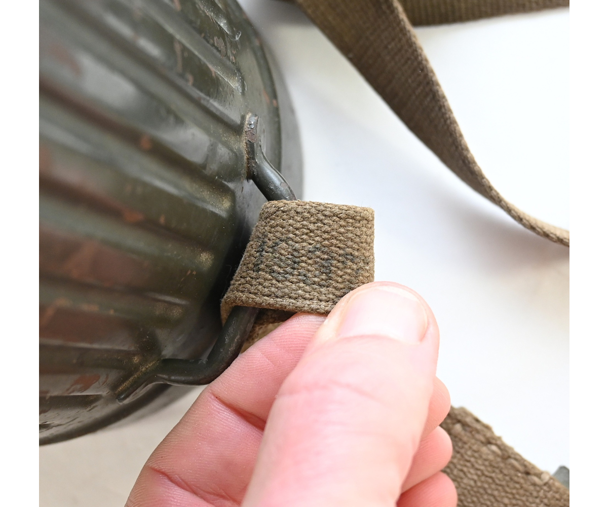 The overall condition of the set is very nice. It shows normal signs of use. The canister contains 90% of its original color. It's dated 1940 on the lid for the spare glasses and the nametag reads Oberfeldwebel Friedrich Wackler. Its complete with a long and short strap (1937). The gasmask is in absolute top condition and is the harder to find green rubber variant. It's complete with filter, all the straps and multiple markings. The set comes with spare glasses, a retaining spring and it's often missing cloth.