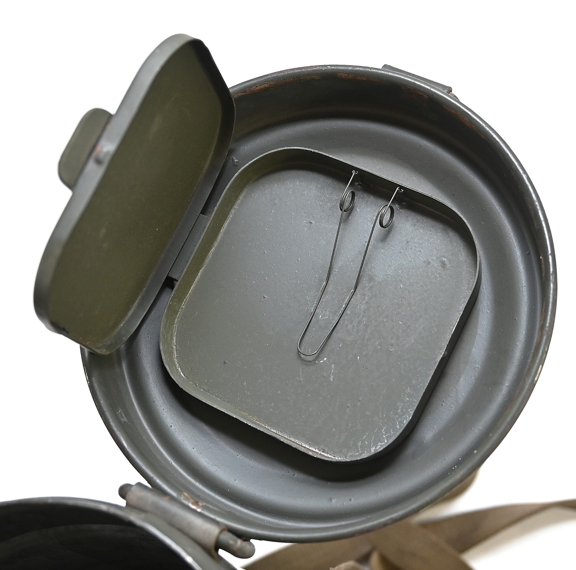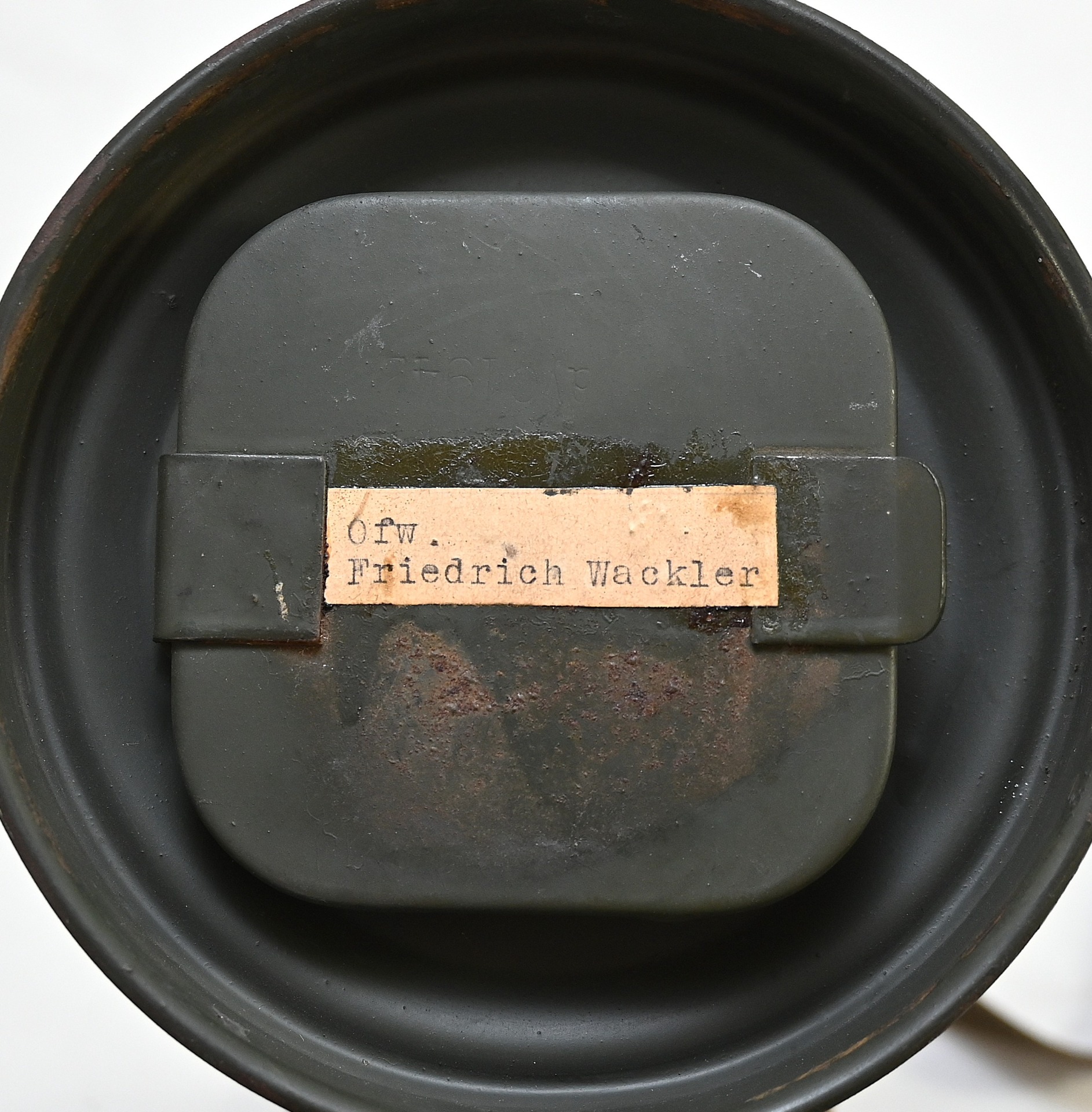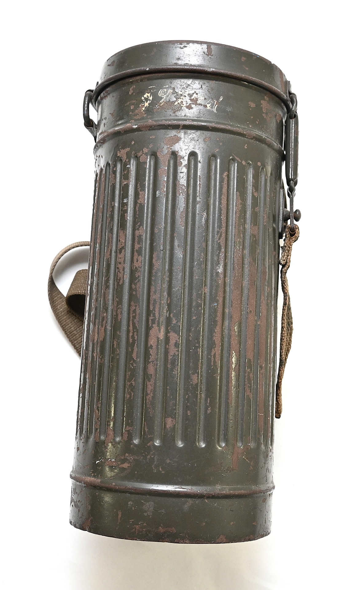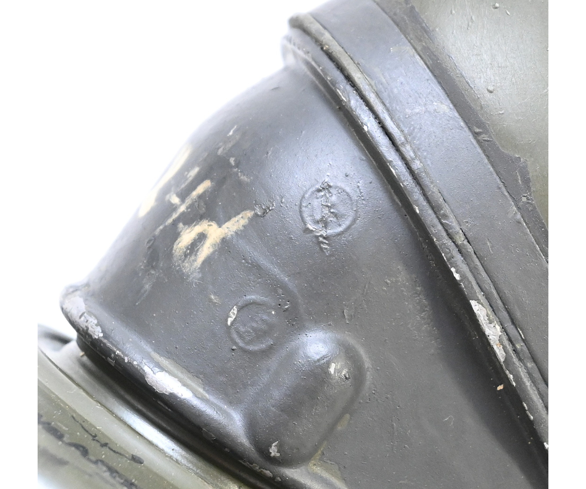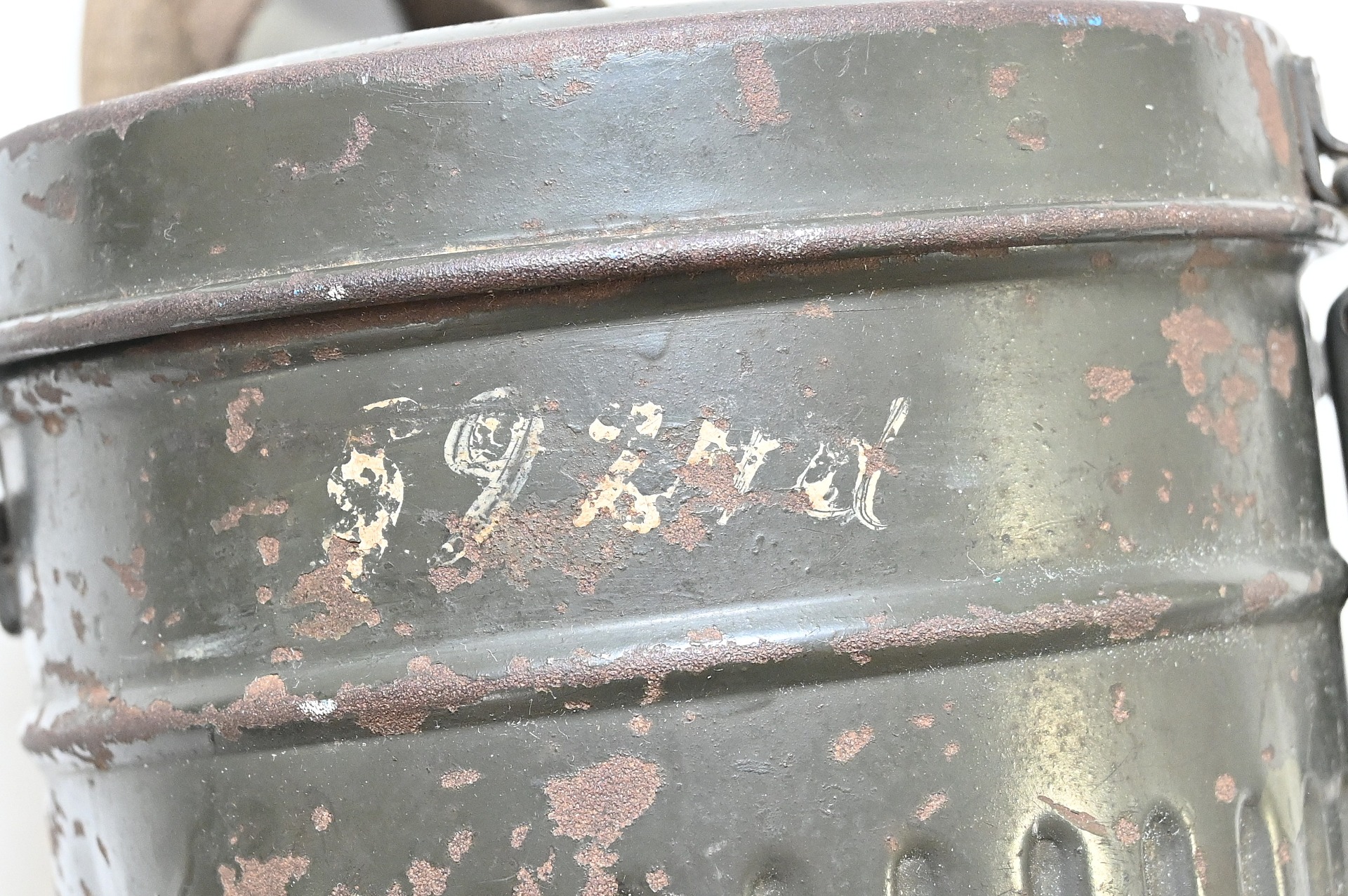 The overall condition of the set is very nice. It shows normal signs of use. The canister contains 90% of its original color. It's dated 1940 on the lid for the spare glasses and the nametag reads Oberfeldwebel Friedrich Wackler. Its complete with a long and short strap (1937). The gasmask is in absolute top condition and is the harder to find green rubber variant. It's complete with filter, all the straps and multiple markings. The set comes with spare glasses, a retaining spring and it's often missing cloth.