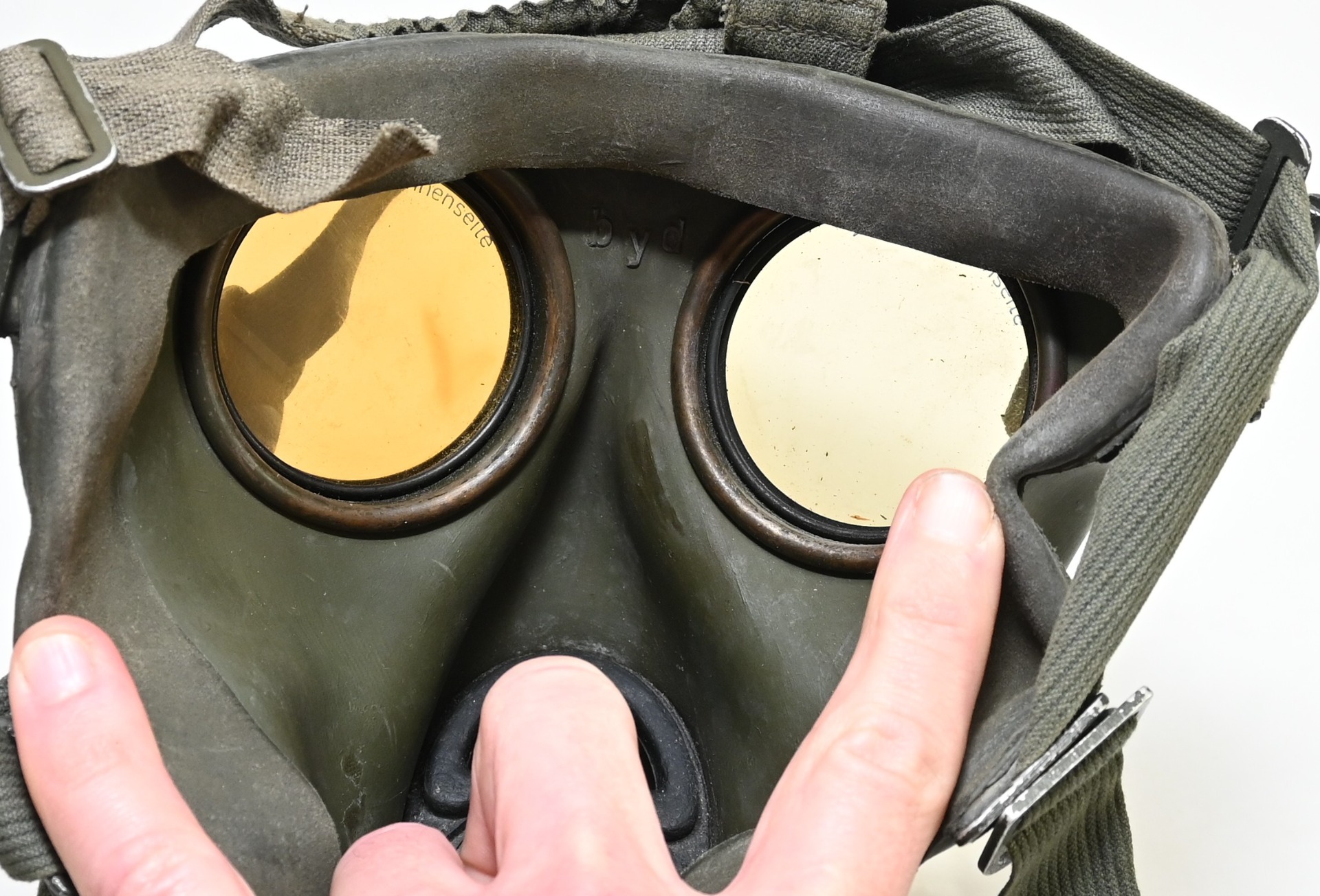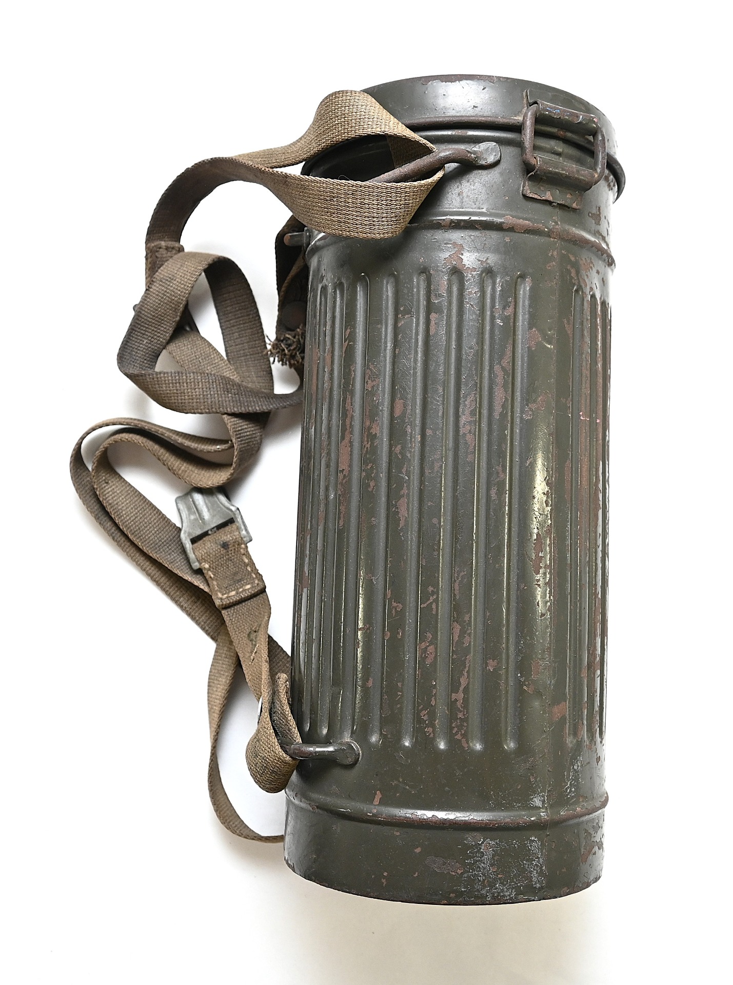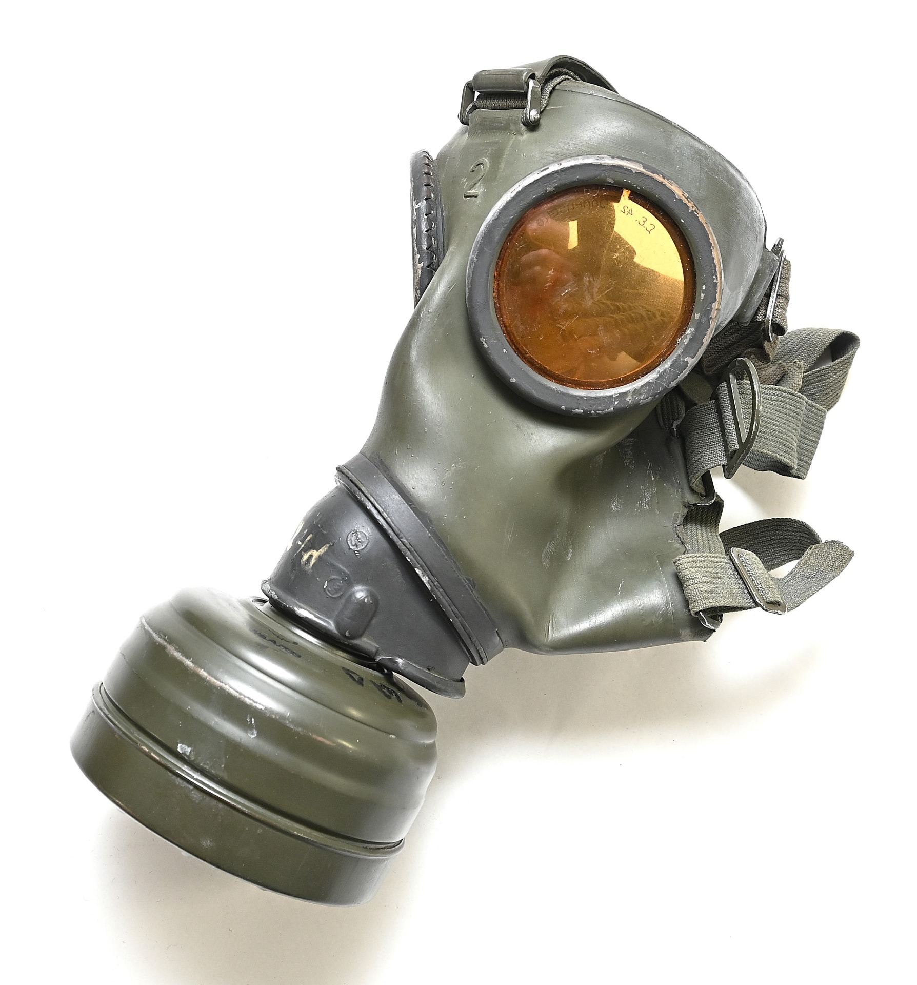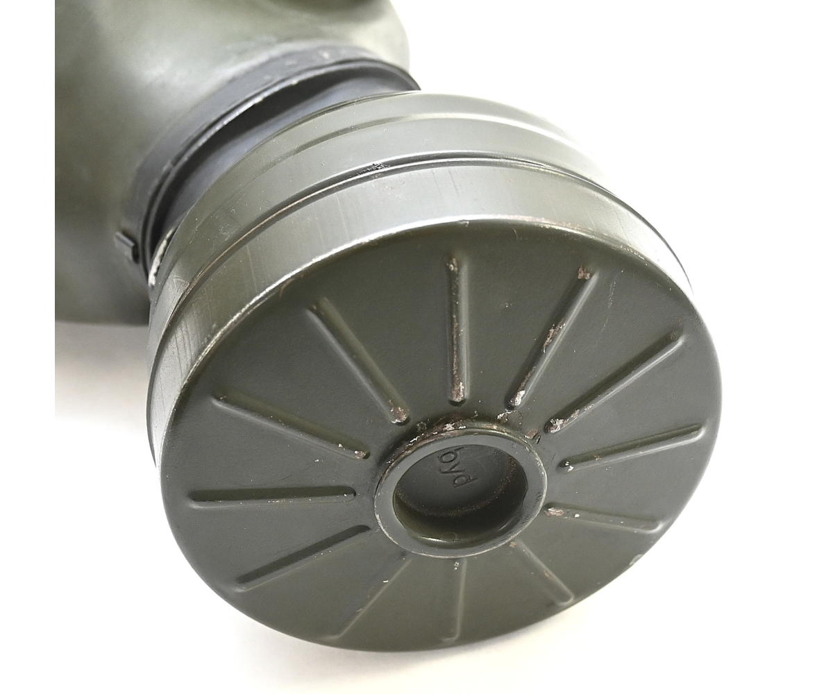 The overall condition of the set is very nice. It shows normal signs of use. The canister contains 90% of its original color. It's dated 1940 on the lid for the spare glasses and the nametag reads Oberfeldwebel Friedrich Wackler. Its complete with a long and short strap (1937). The gasmask is in absolute top condition and is the harder to find green rubber variant. It's complete with filter, all the straps and multiple markings. The set comes with spare glasses, a retaining spring and it's often missing cloth.