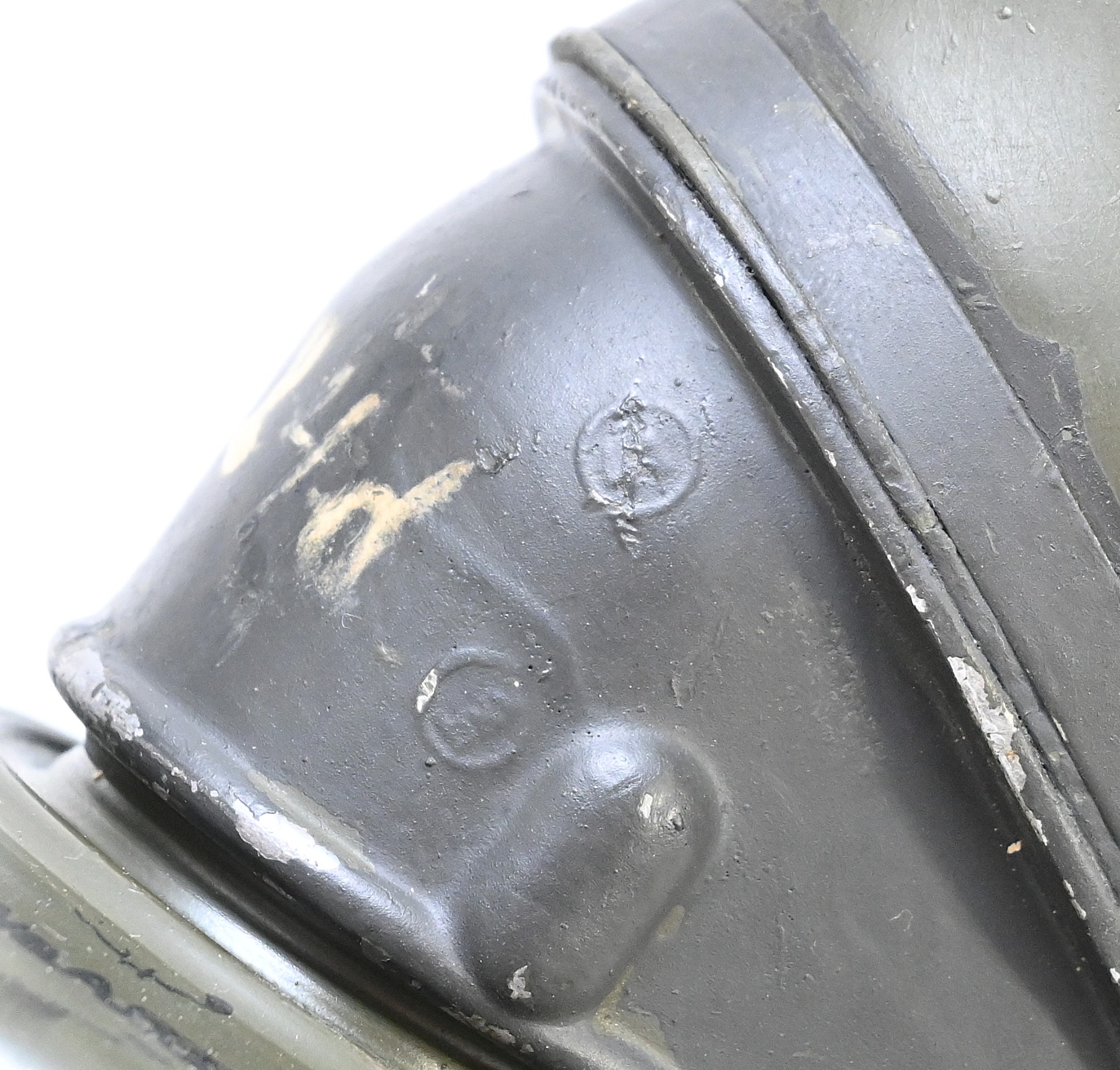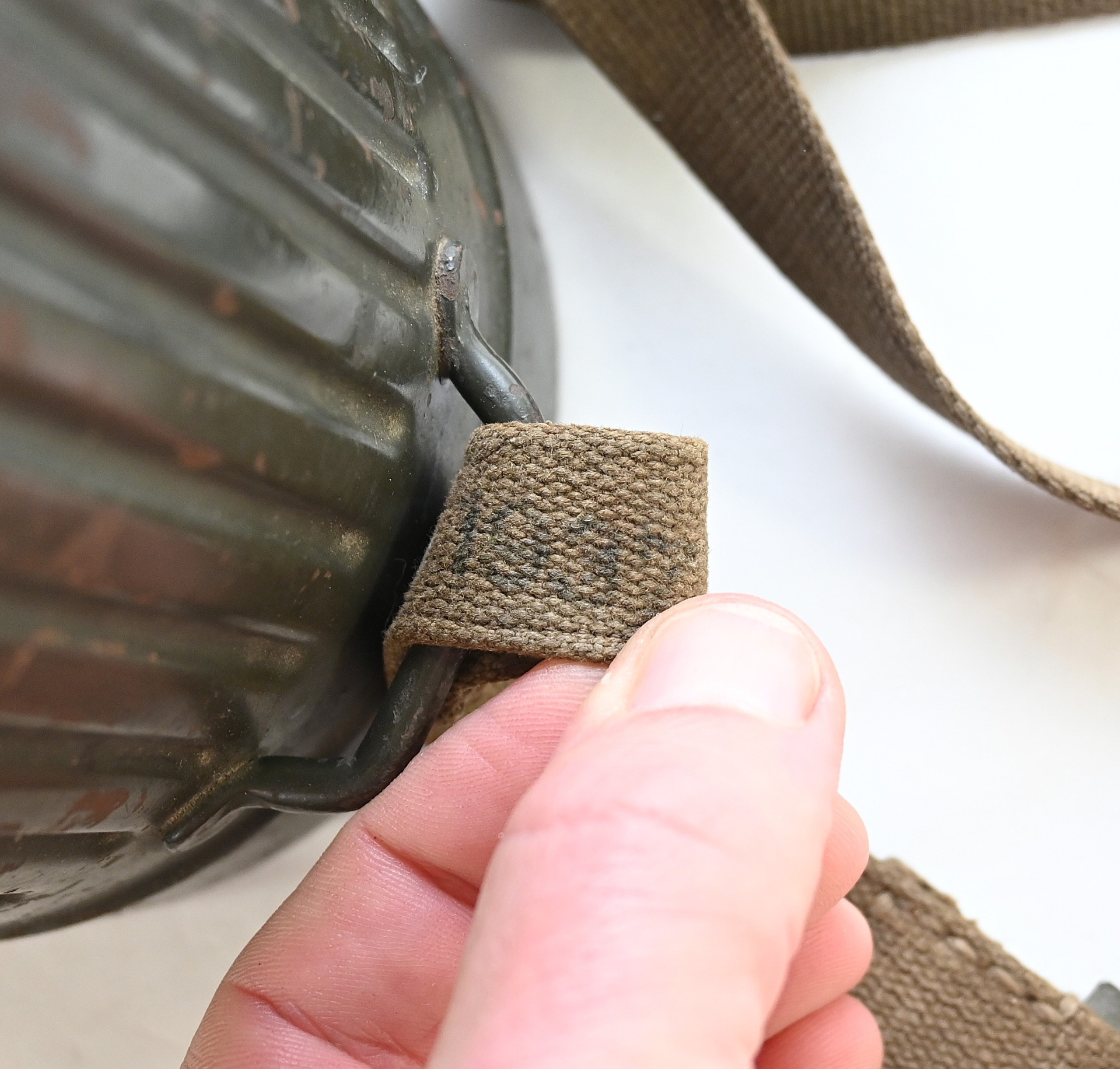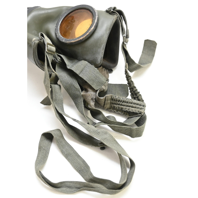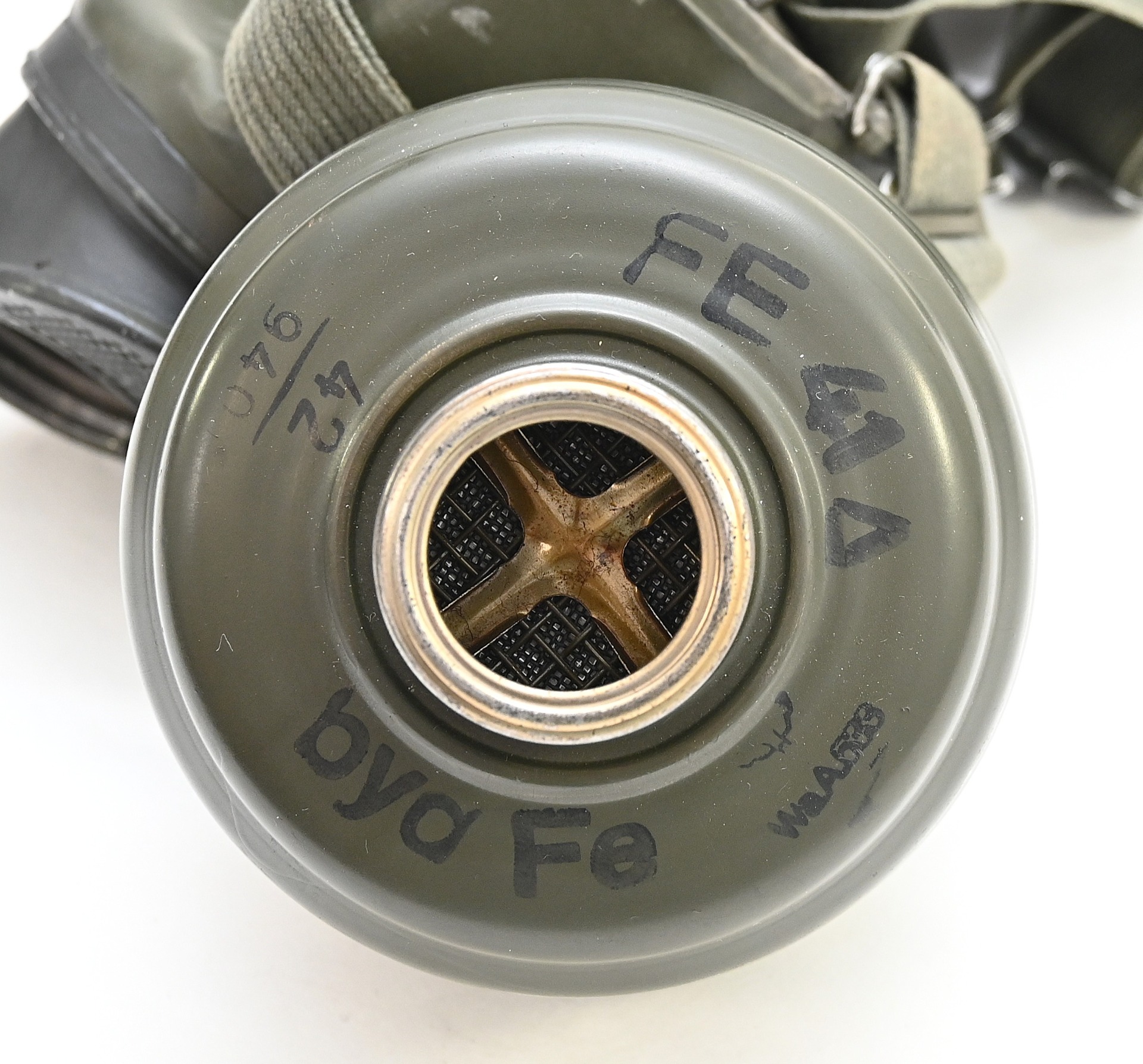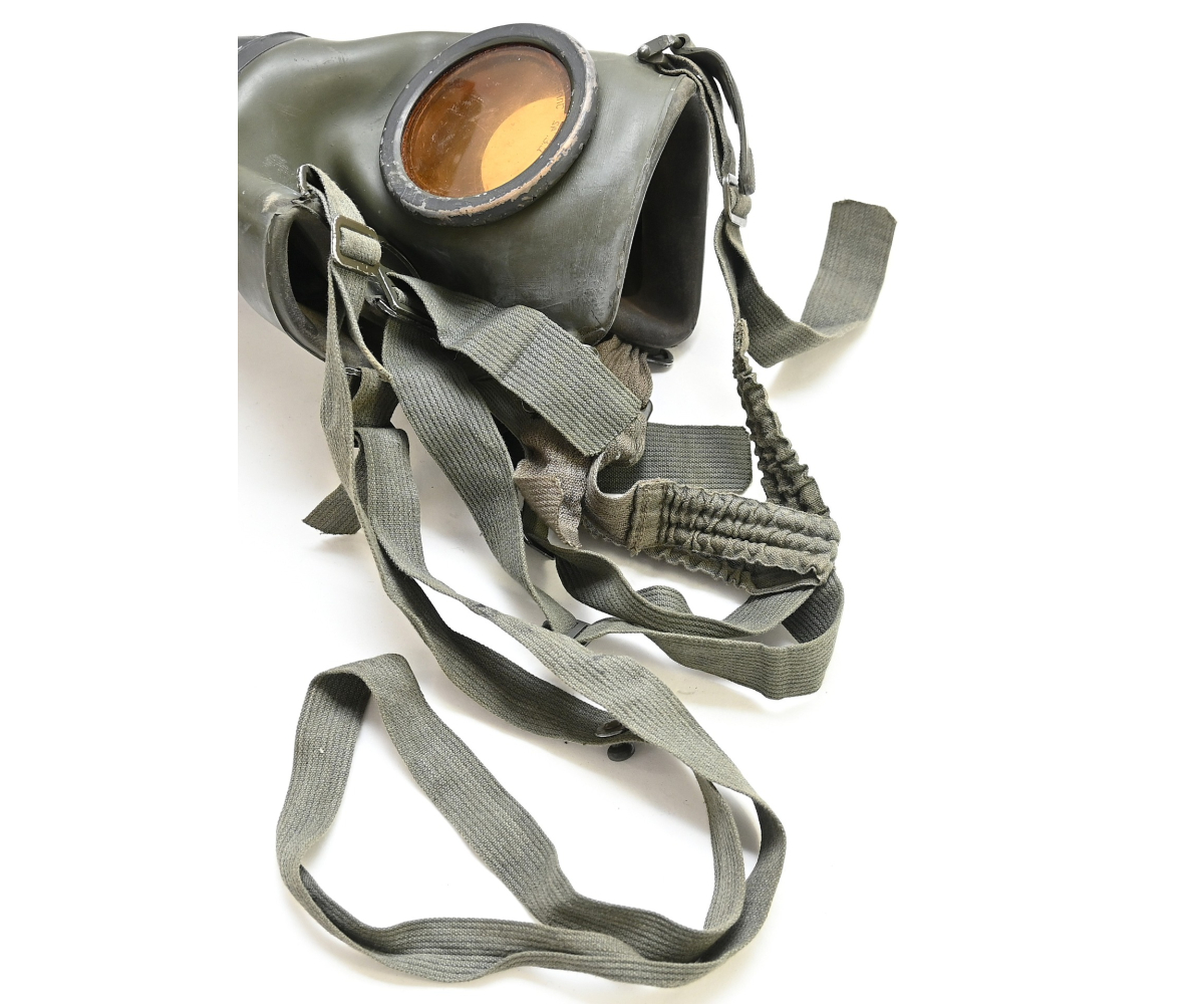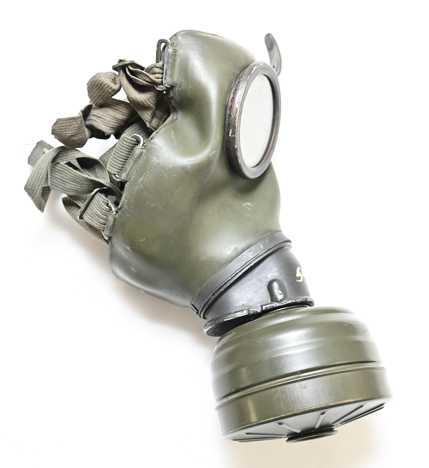 The overall condition of the set is very nice. It shows normal signs of use. The canister contains 90% of its original color. It's dated 1940 on the lid for the spare glasses and the nametag reads Oberfeldwebel Friedrich Wackler. Its complete with a long and short strap (1937). The gasmask is in absolute top condition and is the harder to find green rubber variant. It's complete with filter, all the straps and multiple markings. The set comes with spare glasses, a retaining spring and it's often missing cloth.