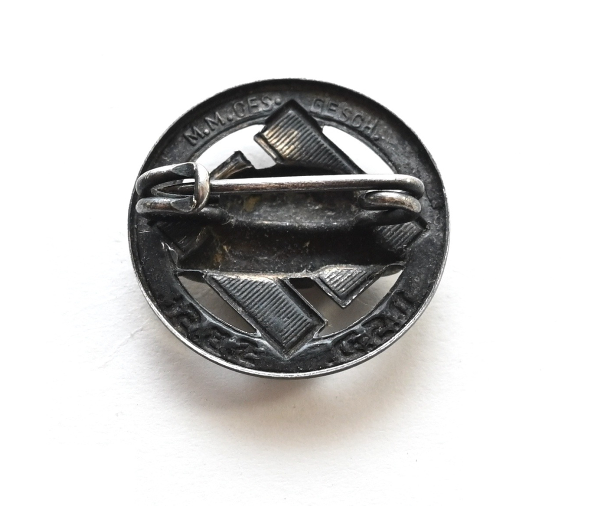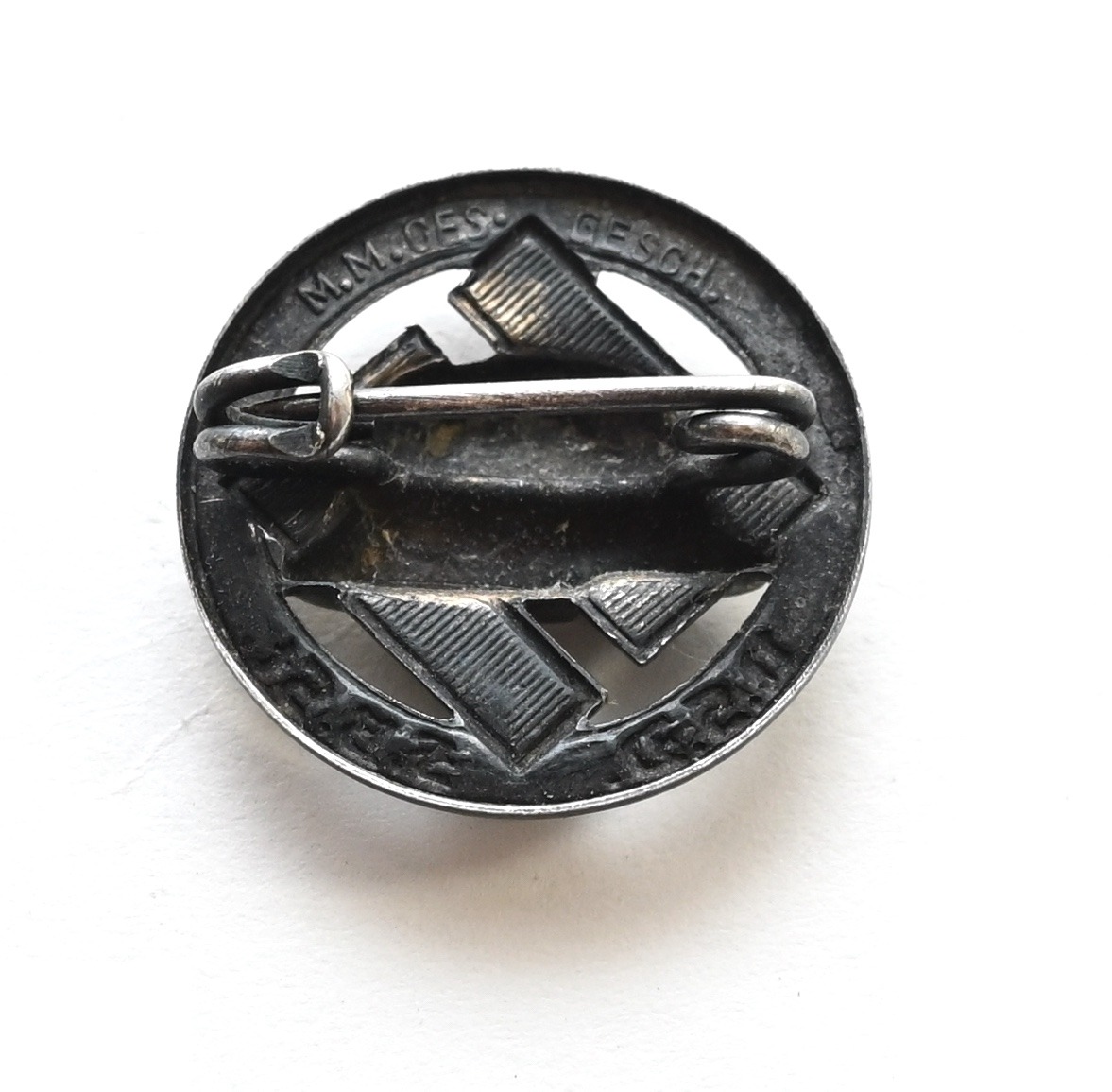 The pin shows overall normal signs of wear. Complete with working needle on the back. Marked 'M.M' and 'ges.gesch' on the back.