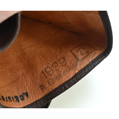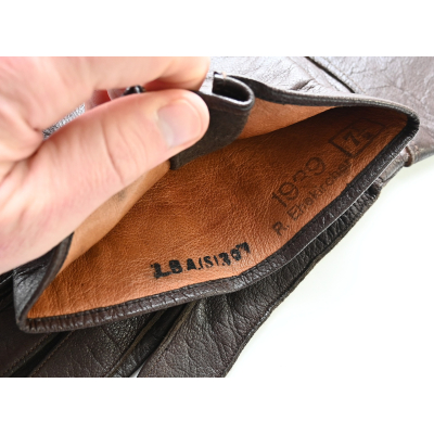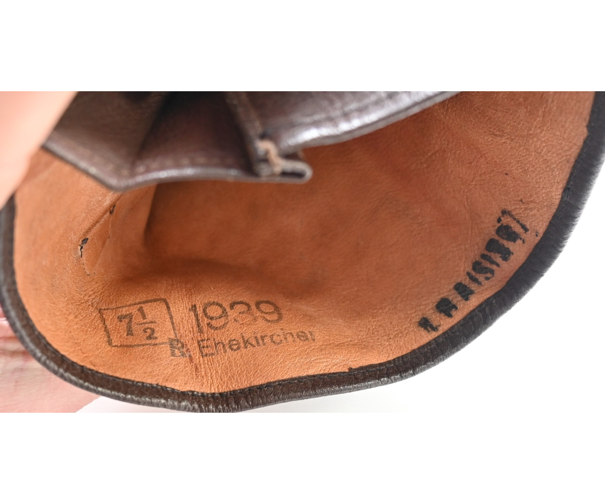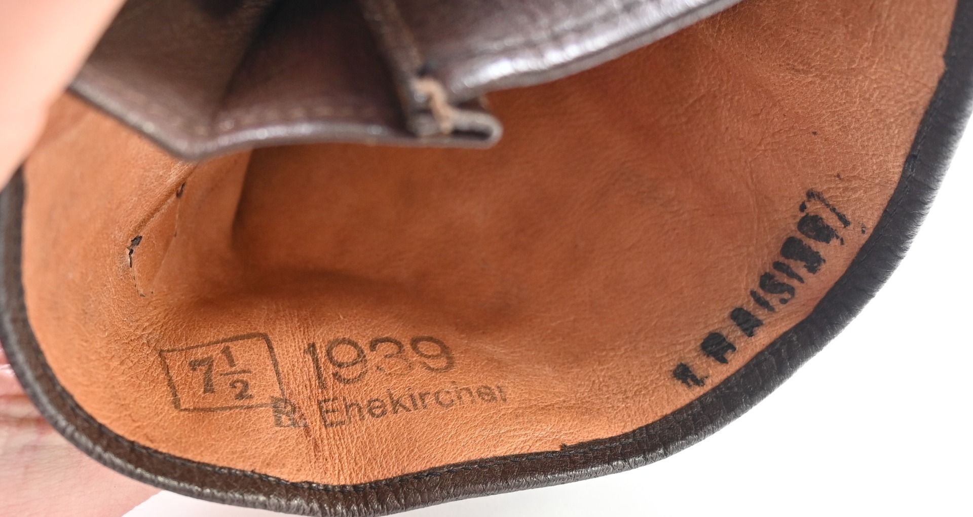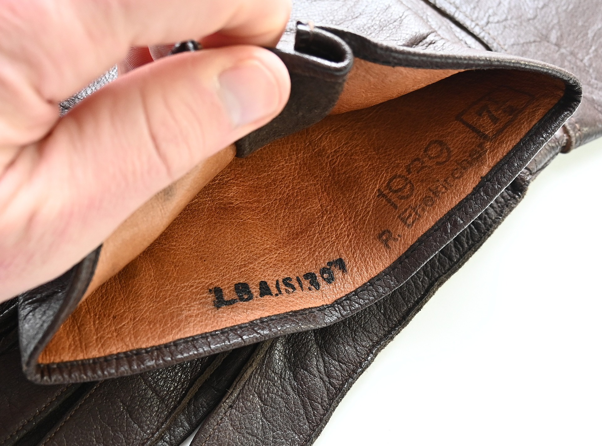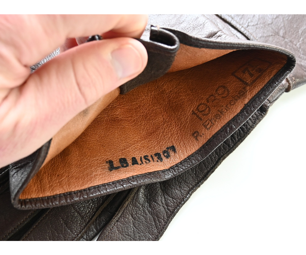 The gloves show overall minor signs of wear. Leather is supple and solid. Push buttons are in good working order. The gloves are maker marked, dated '1939' and size marked '7,5'. They are also marked 'L.B.A.S.39' which stands for 'Luftwaffe Bekleidungsamt Stettin 1939'.