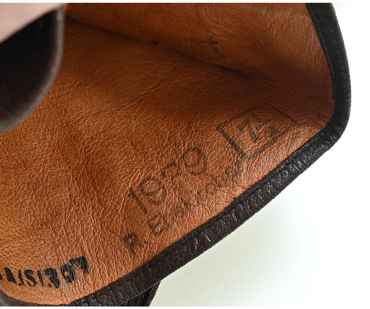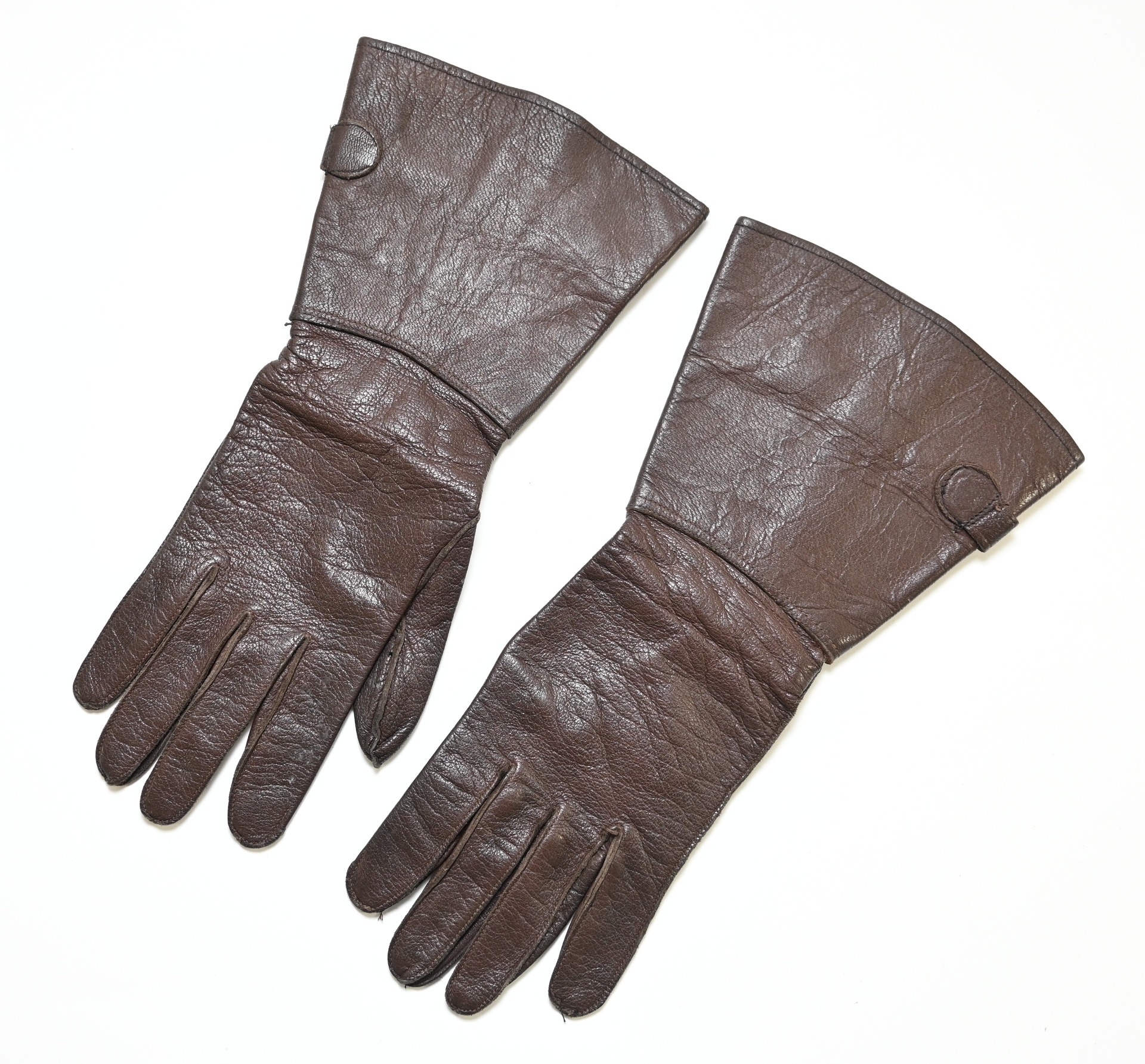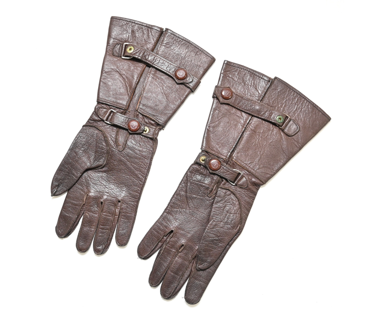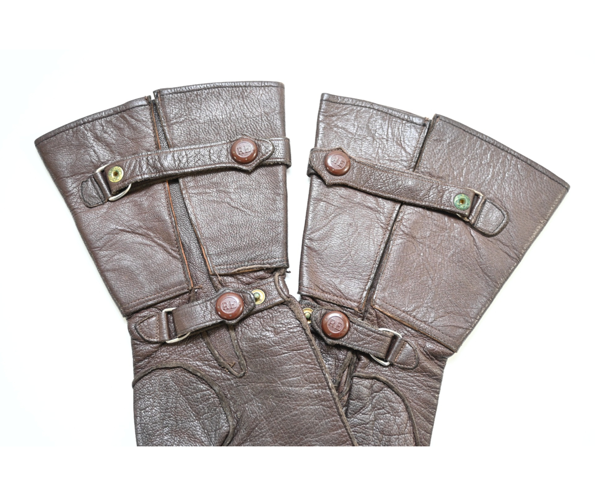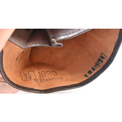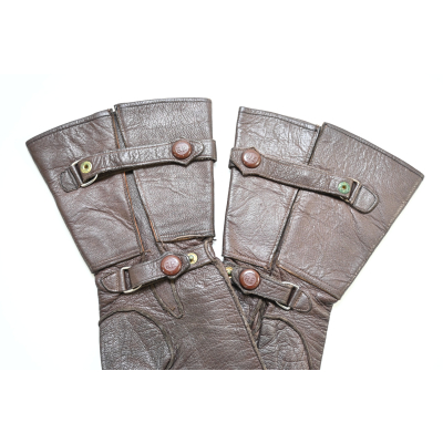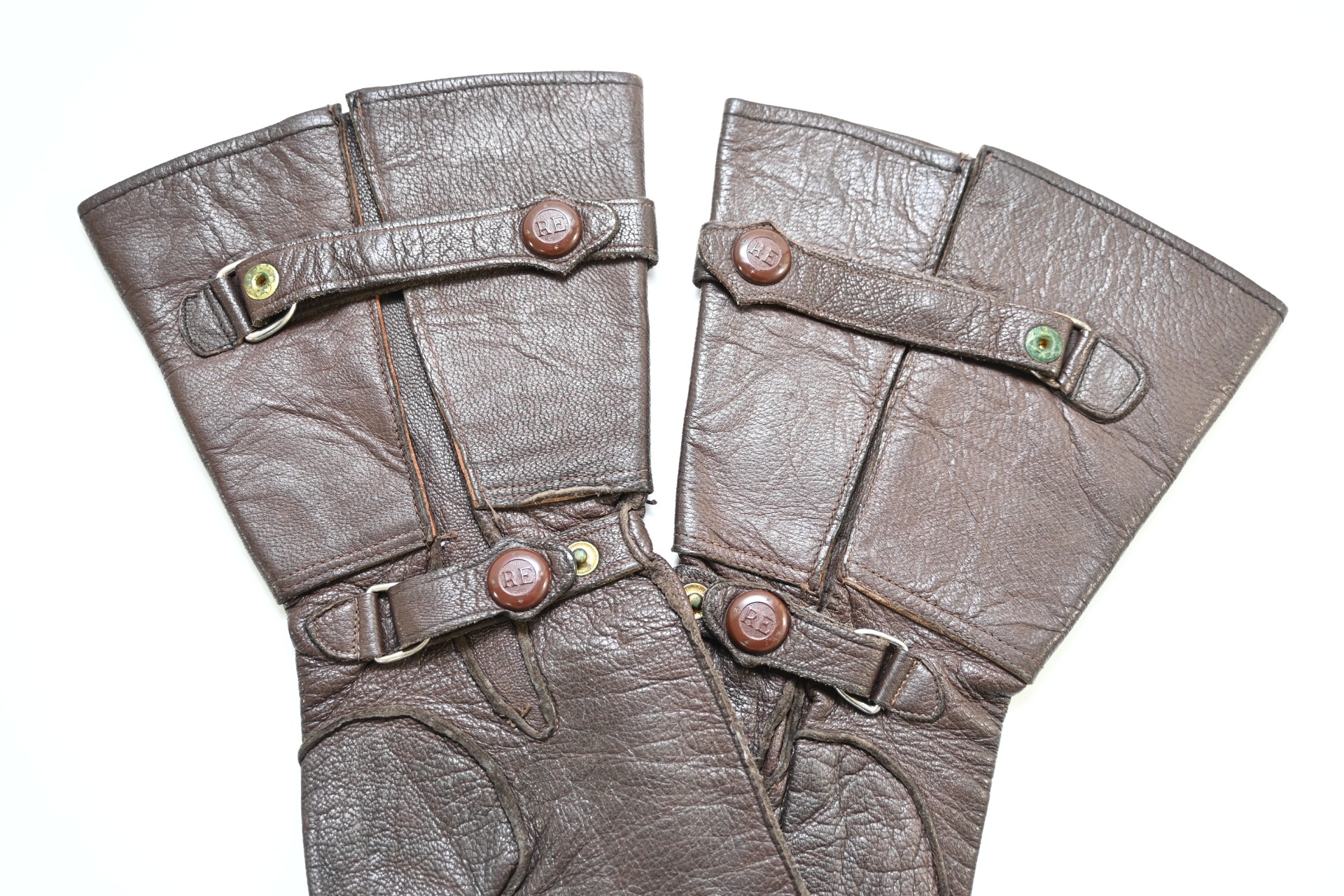 The gloves show overall minor signs of wear. Leather is supple and solid. Push buttons are in good working order. The gloves are maker marked, dated '1939' and size marked '7,5'. They are also marked 'L.B.A.S.39' which stands for 'Luftwaffe Bekleidungsamt Stettin 1939'.