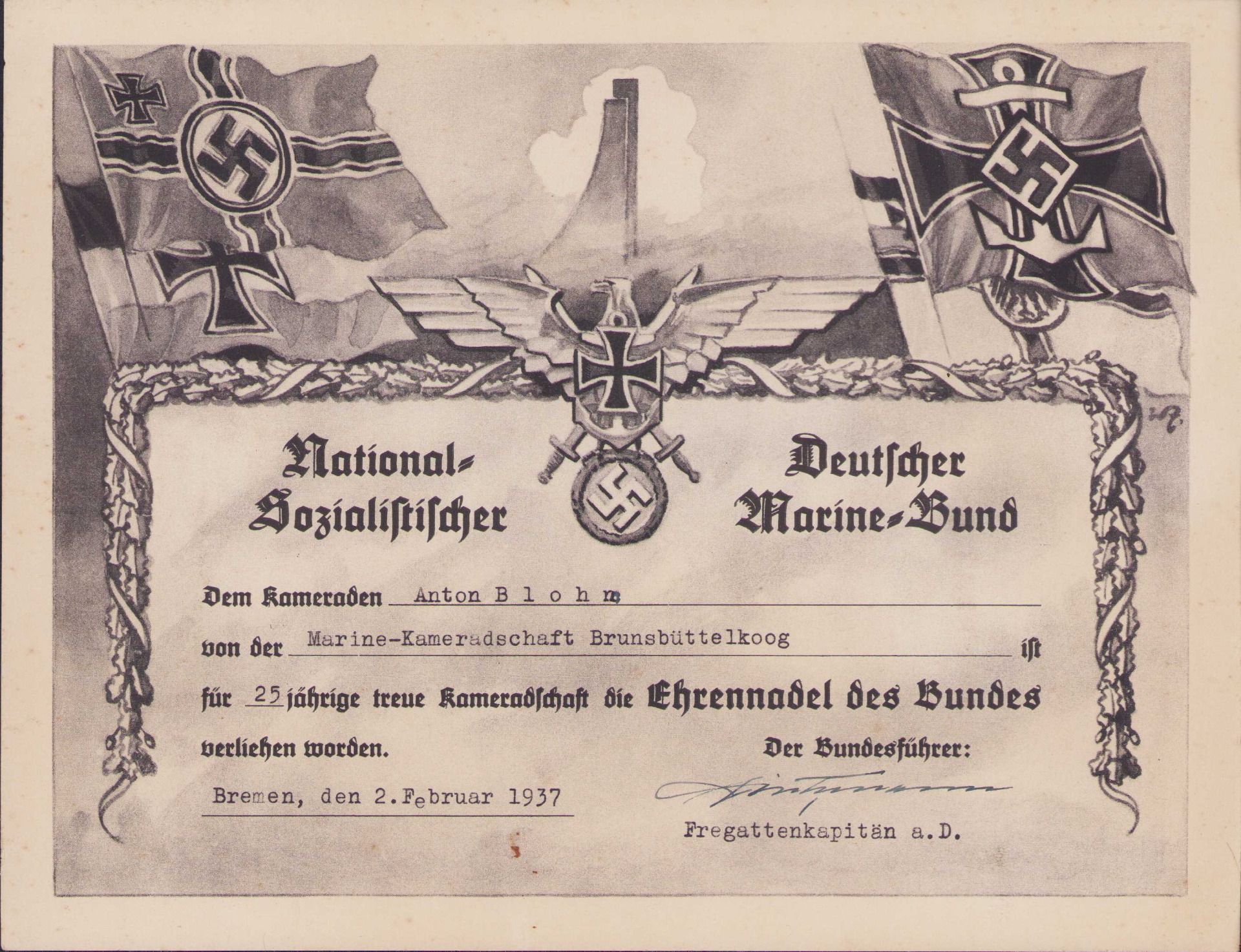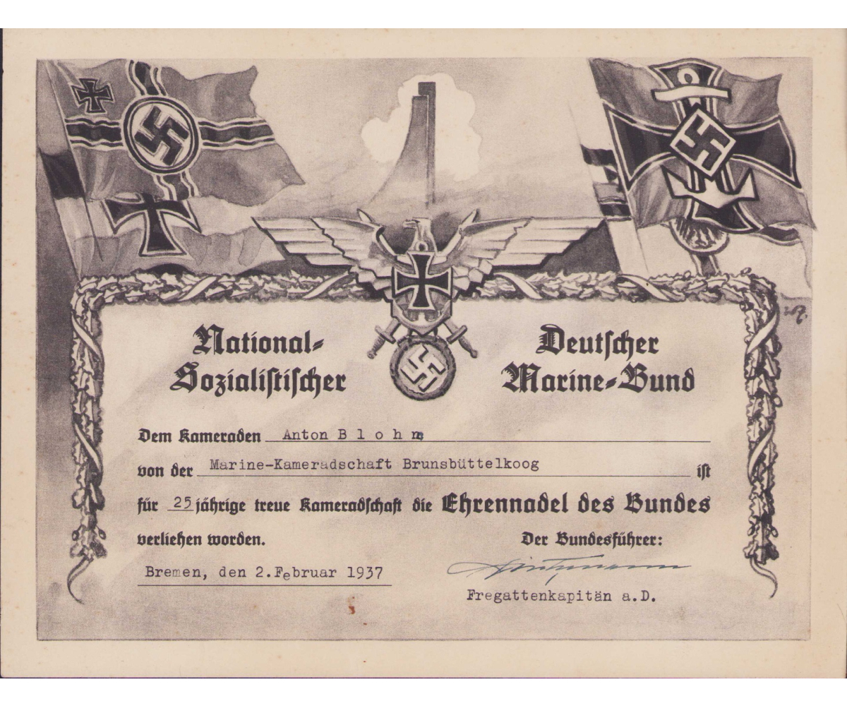 Very nice and hard to find National Sozialistischer Deutscher Marine-Bund related award document in good condition.