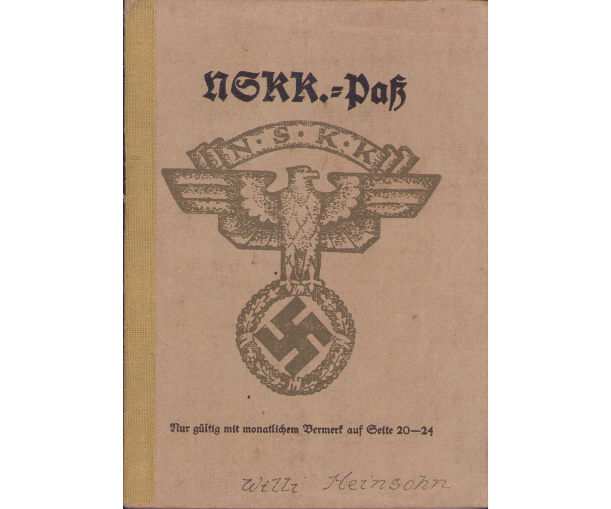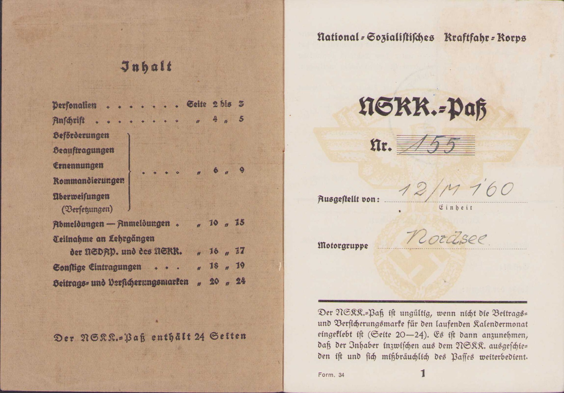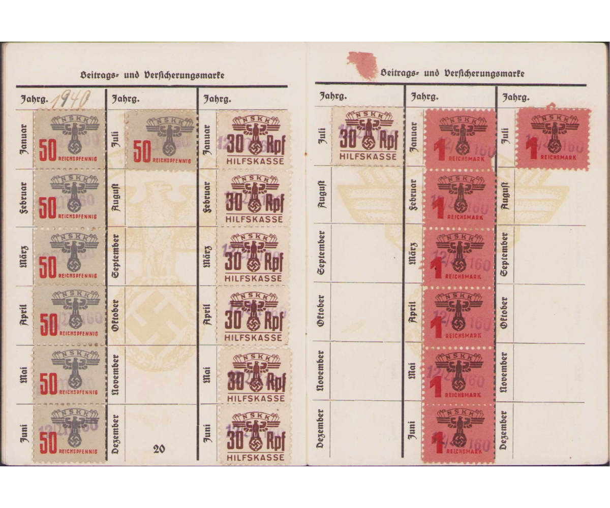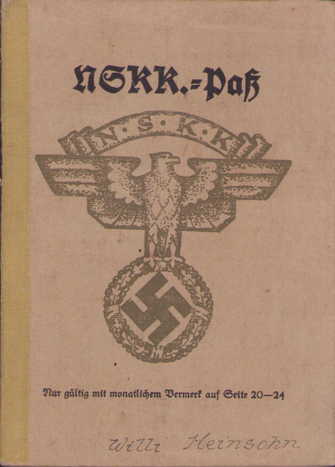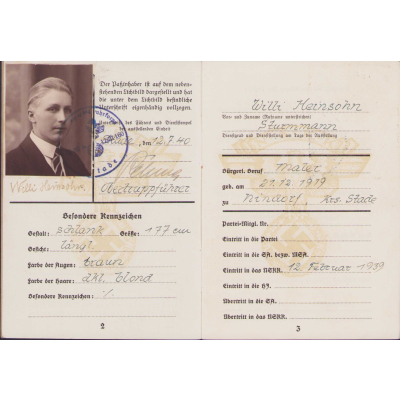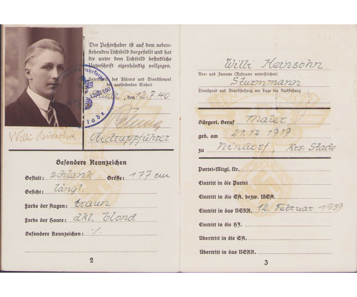 The pass shows overall normal signs of wear. It's solid and complete with all 24 pages. It belonged to Sturmmann Willi Heinsohn. All pages with entries have been scanned by us. The portrait may have been replaced at some point.
