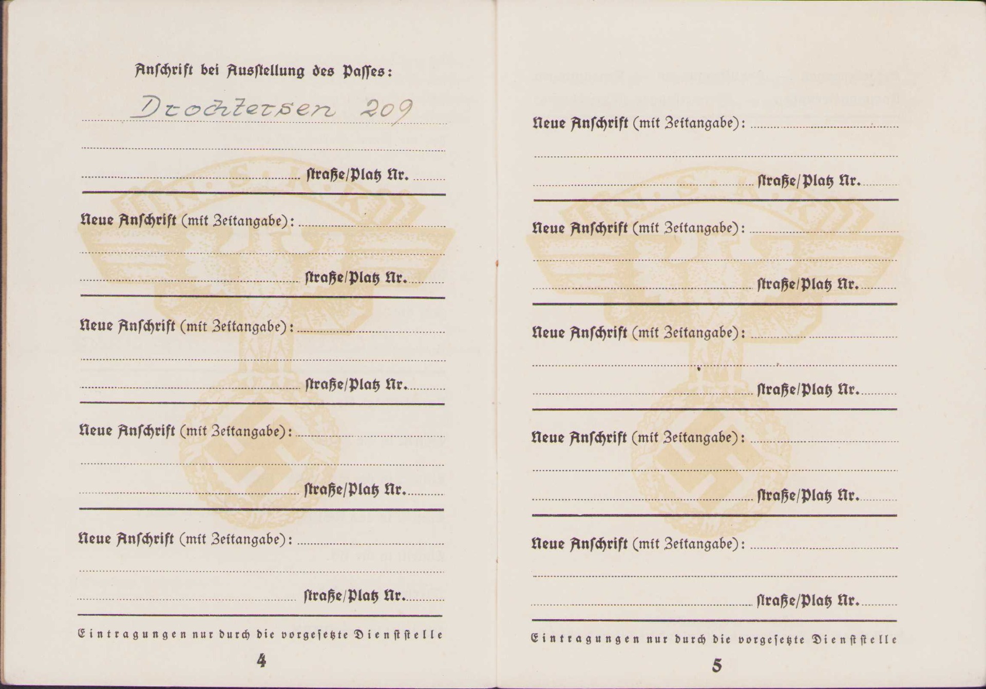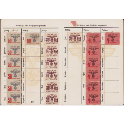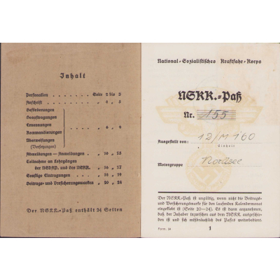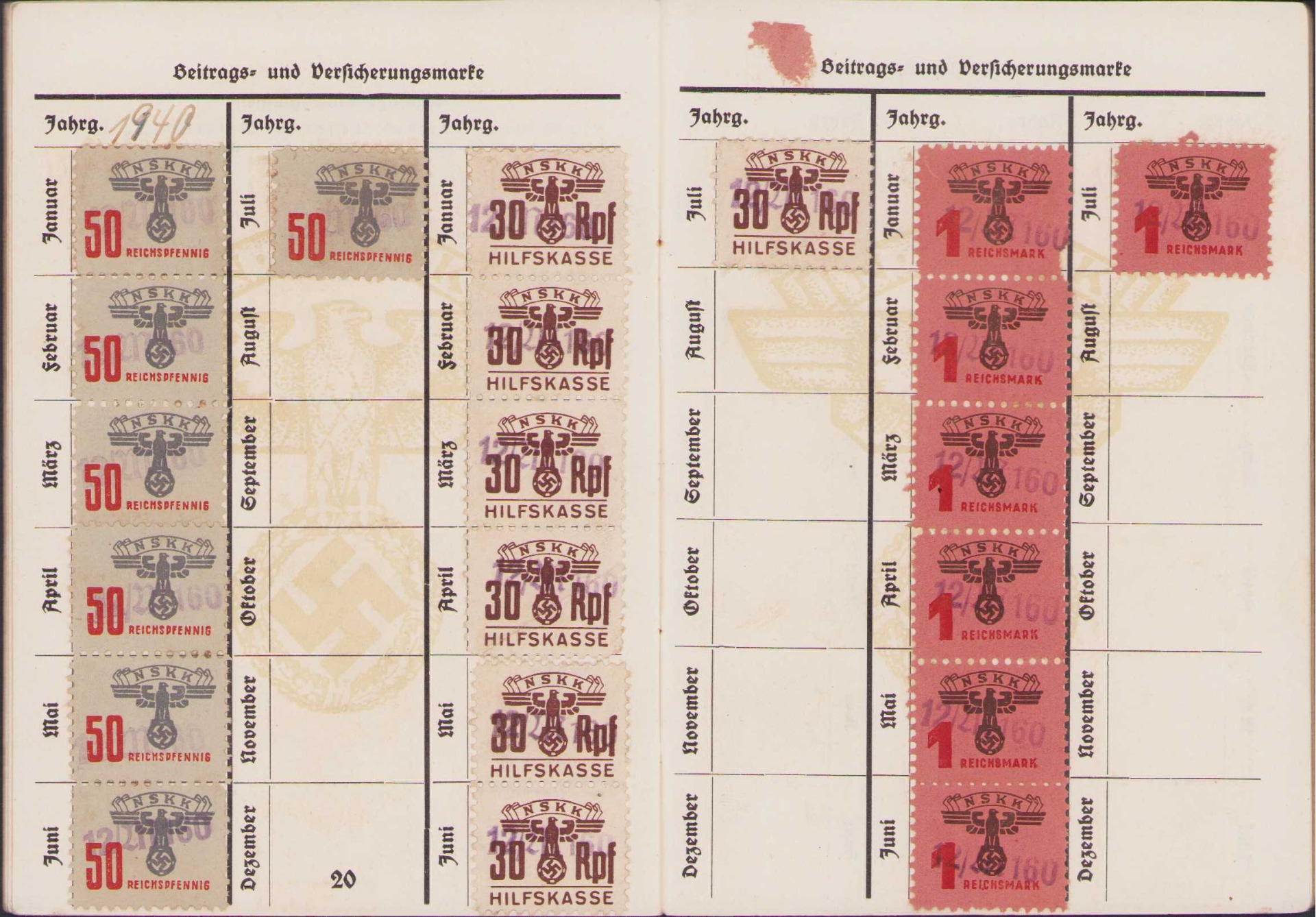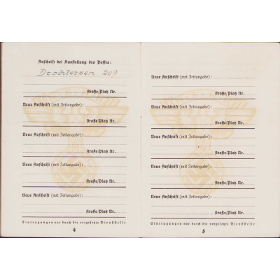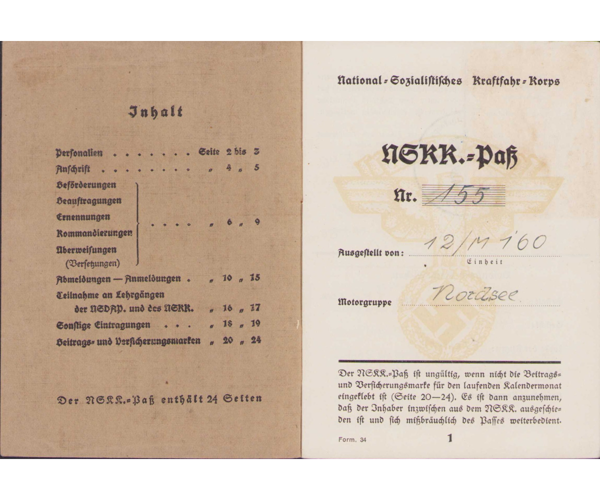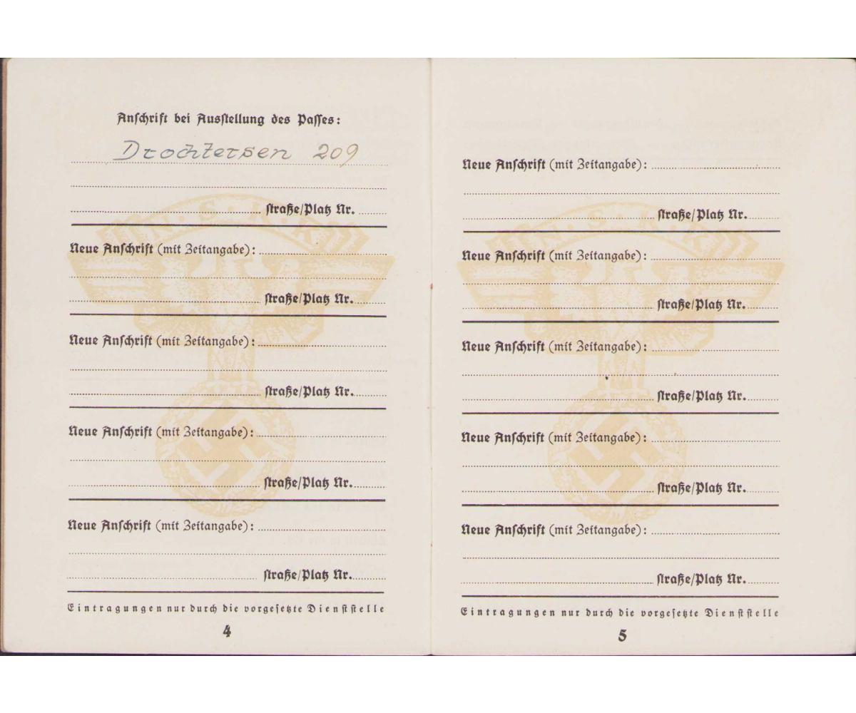 The pass shows overall normal signs of wear. It's solid and complete with all 24 pages. It belonged to Sturmmann Willi Heinsohn. All pages with entries have been scanned by us. The portrait may have been replaced at some point.