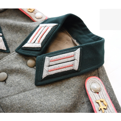 The enlisted eagle has been replaced for an officer's bullion eagle, as have the collar tabs. The collar has also been carefully period upgraded by a tailor to a dark green example. Changing the color of an M41 Feldbluse was done more often, to give the uniform a luxurious apperance and make it look like an M36 model.