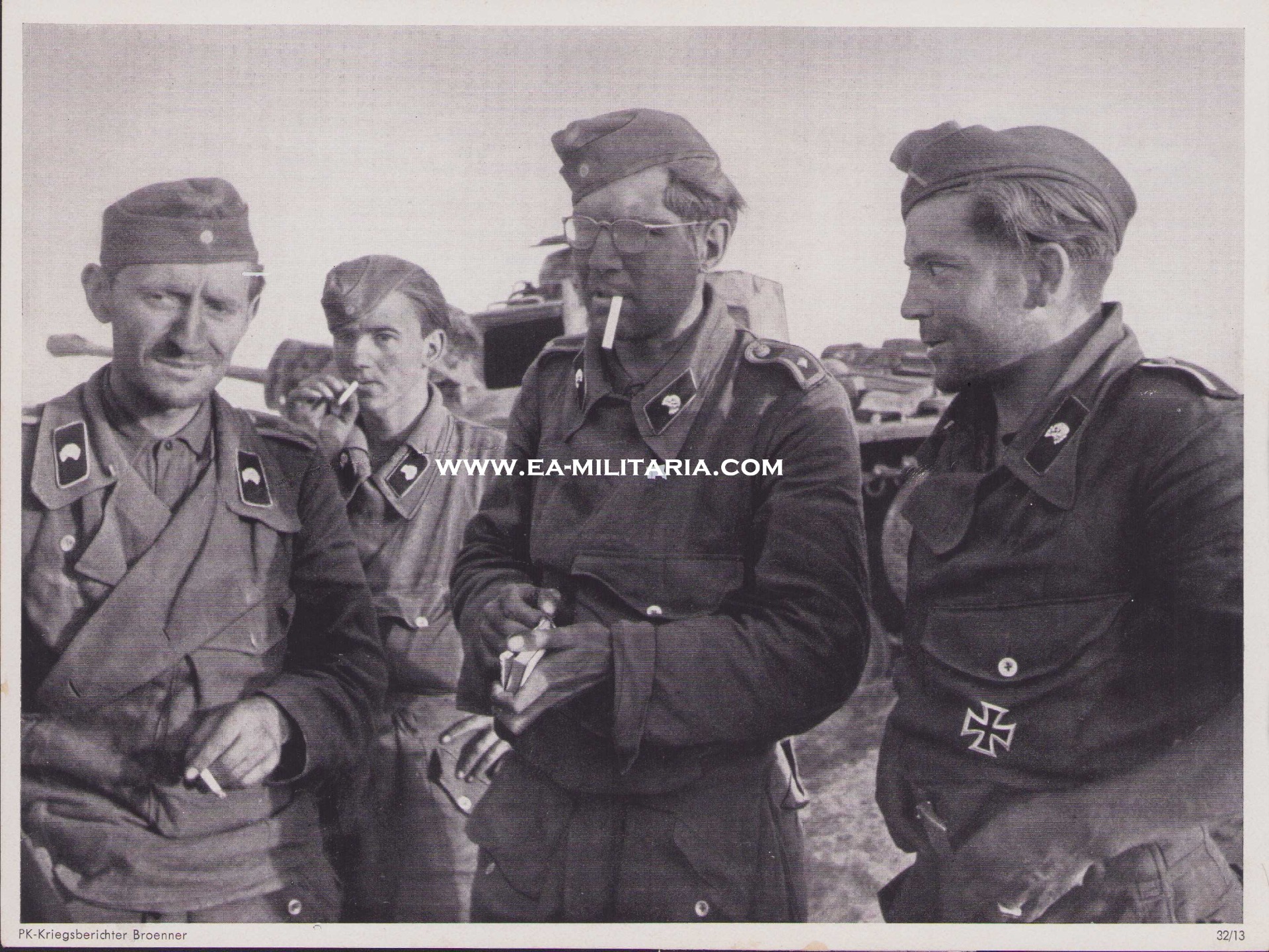 The photo shows overall normal signs of storage wear. It shows a German tank crew having a cigarette break. Behind them their Panzer III is parked. Note the panzer wrap they are wearing, with breast pocket which tells us its their work/maintance wrapper.