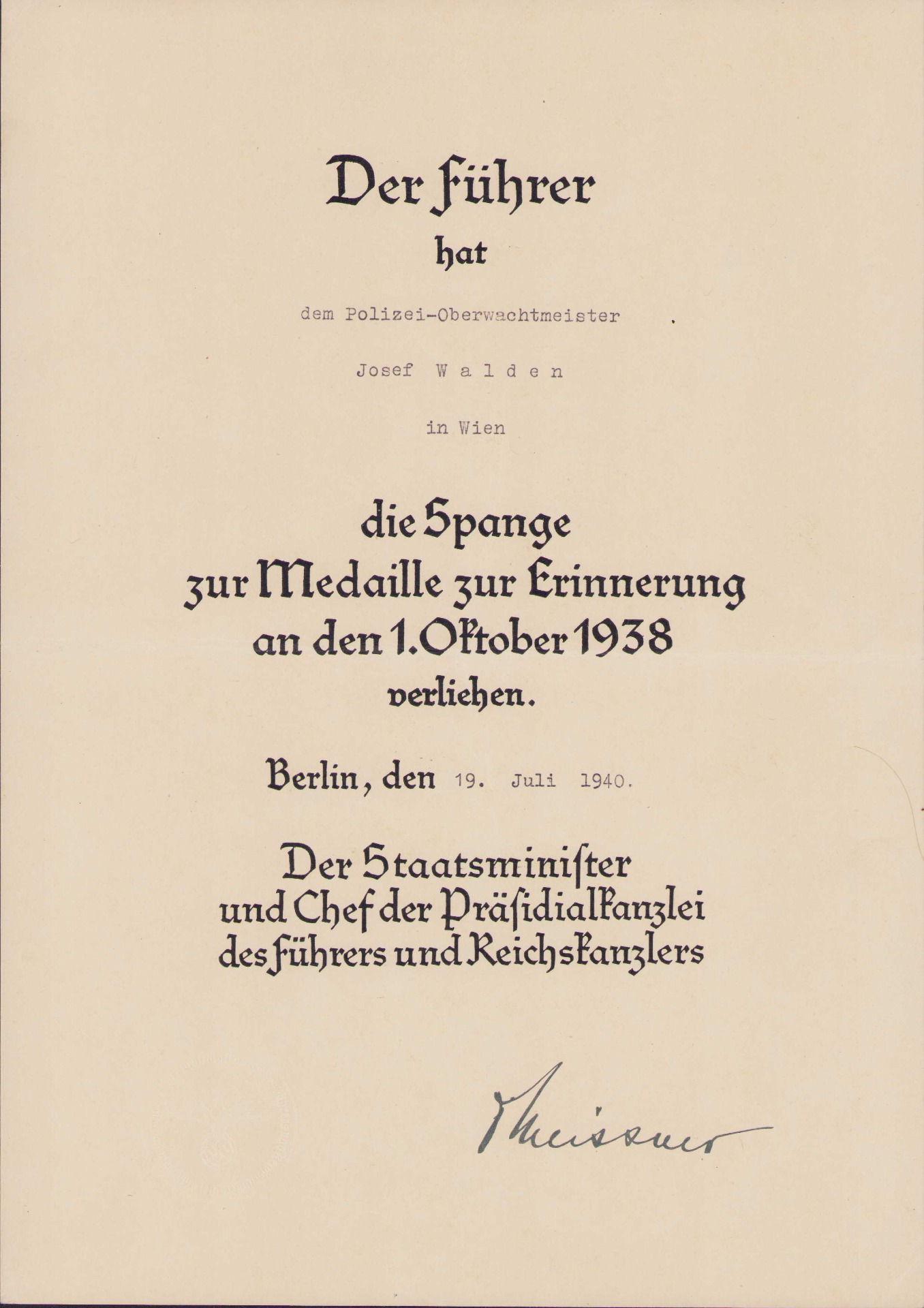 Very nice Polizei related Spange zur Medaille an den 1.Oktober 1938 award document in very good condition.