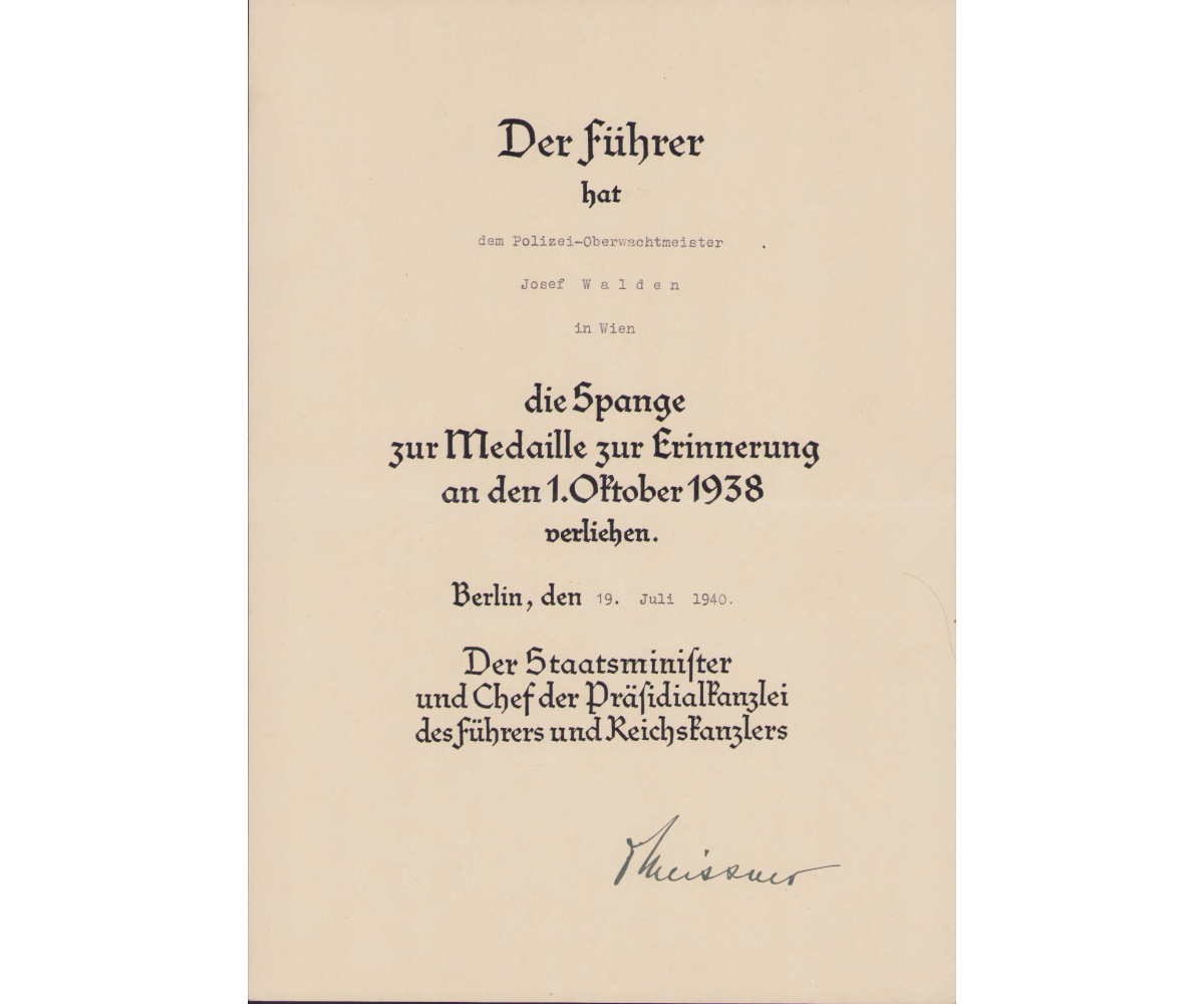 The document shows overall normal signs of wear. It's solid and has no damages. The Spange was issued on the 19th of July 1940 to Polizei-Oberwachtmeister Josef Walden from Vienna.