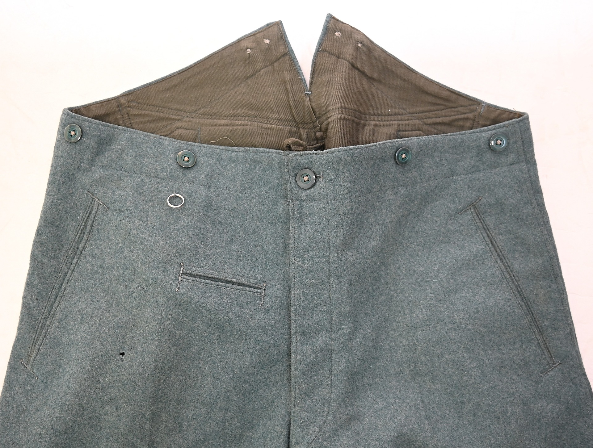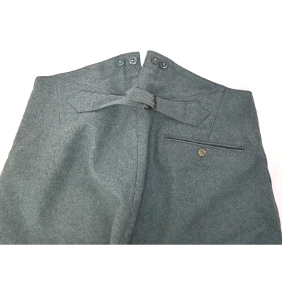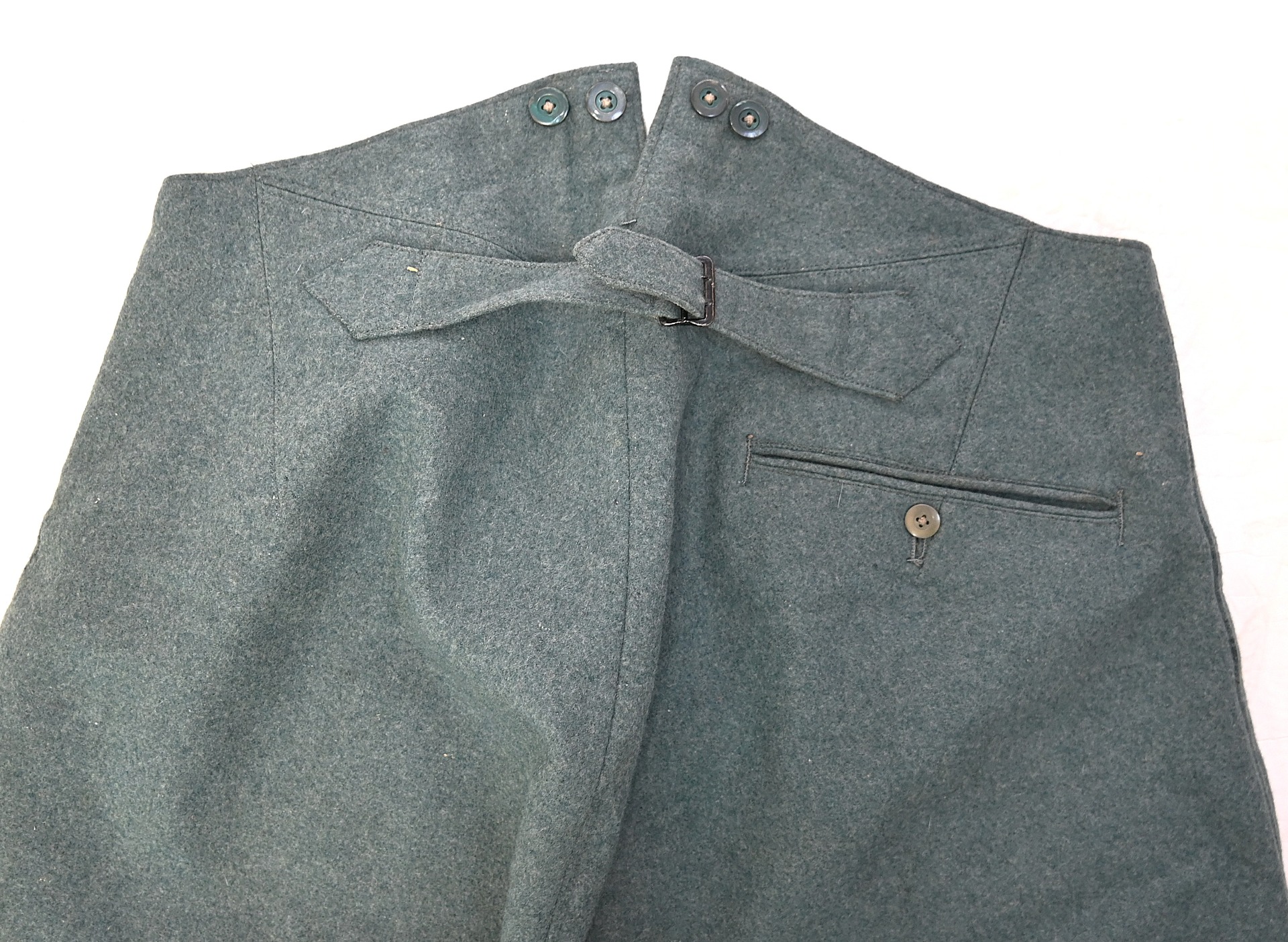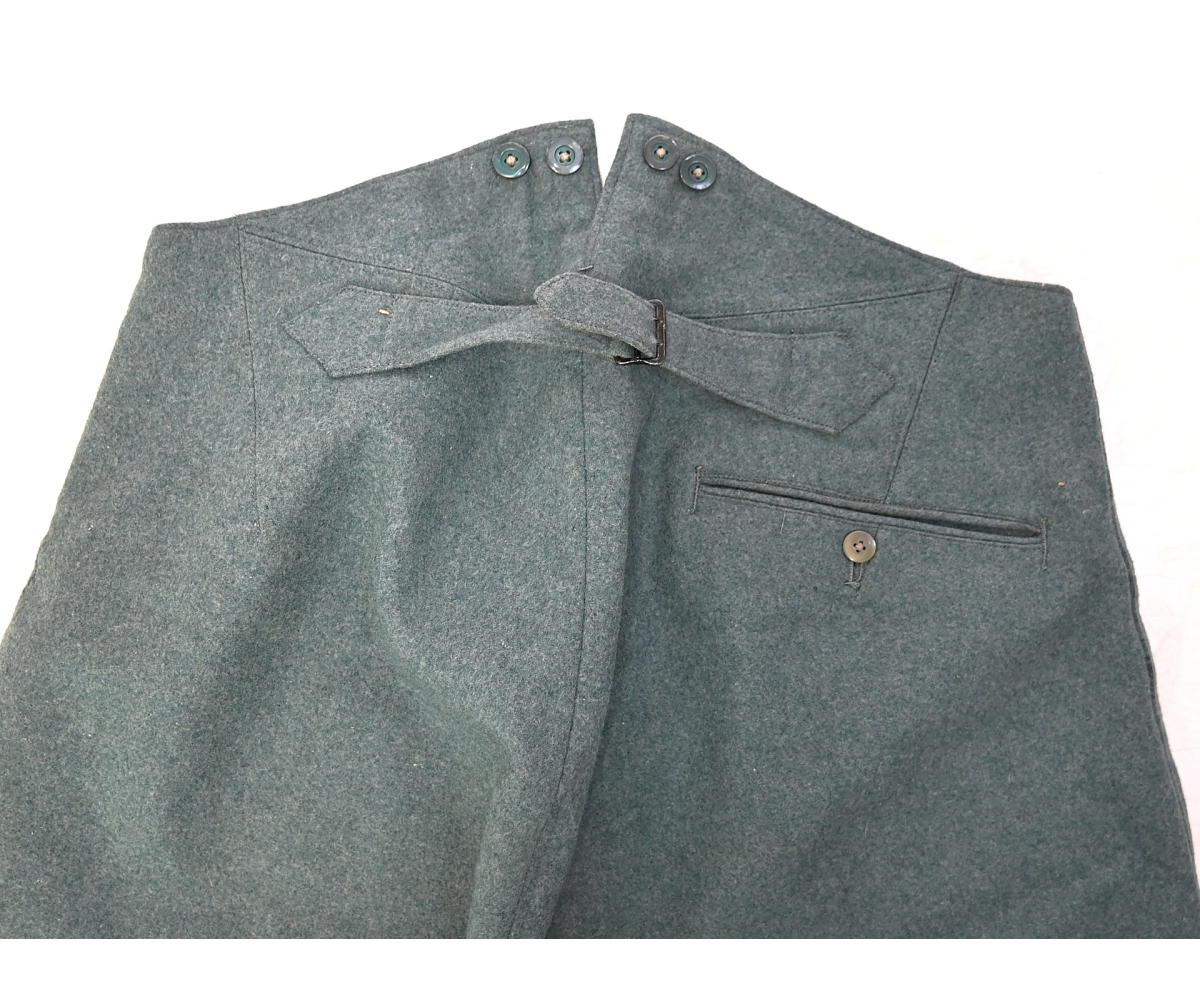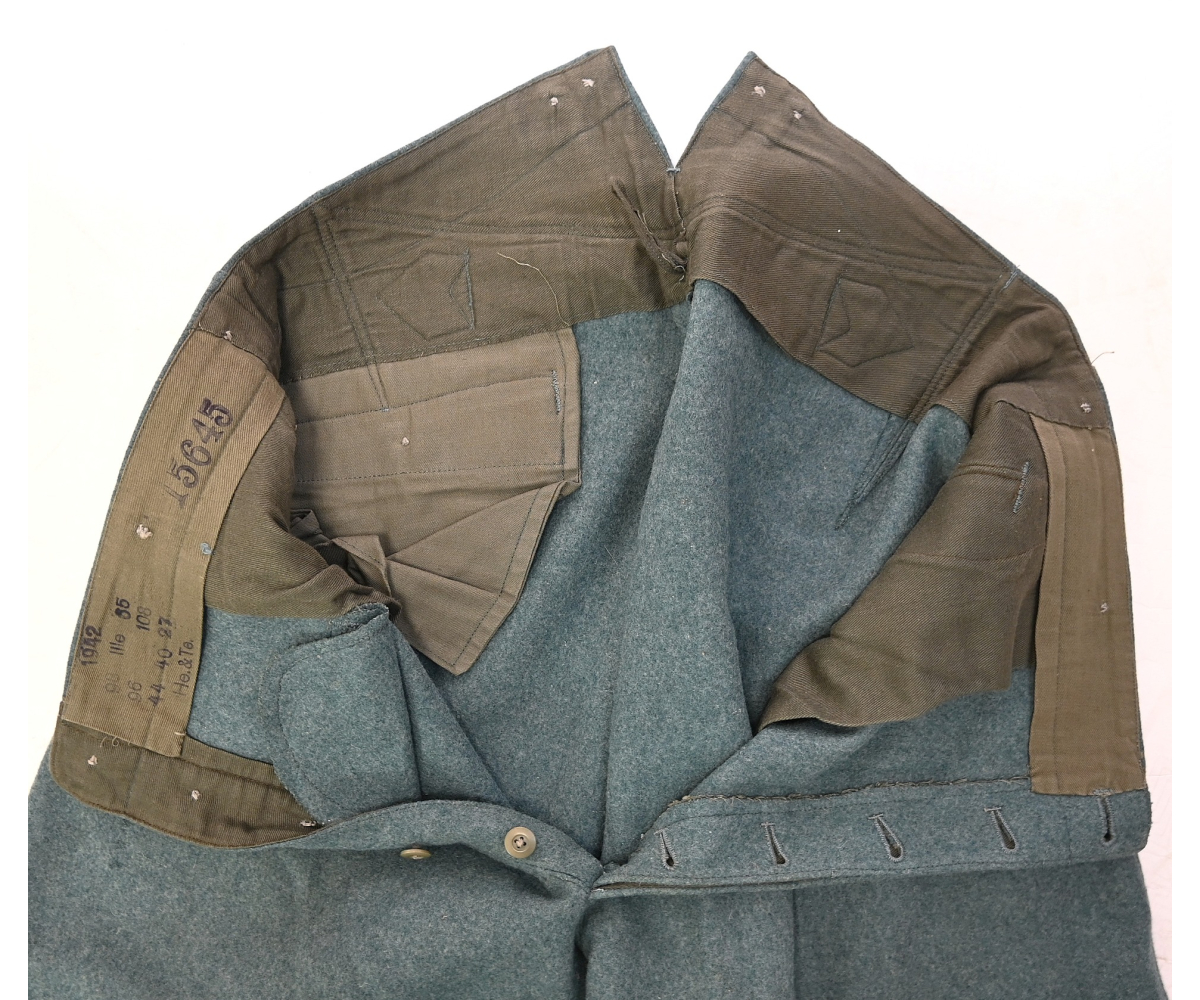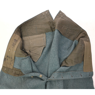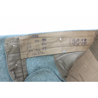 The trousers show overall normal signs of storage wear. It has a couple of tiny moth bites on both sides, but nothing major. It's complete with all buttons. Nicely marked on the inside with the makers initials and the size markings. Dated 1942.