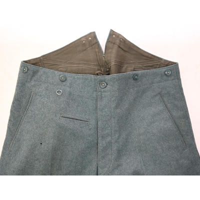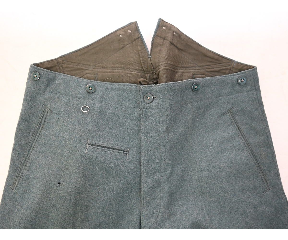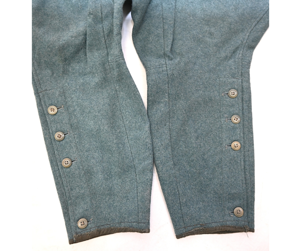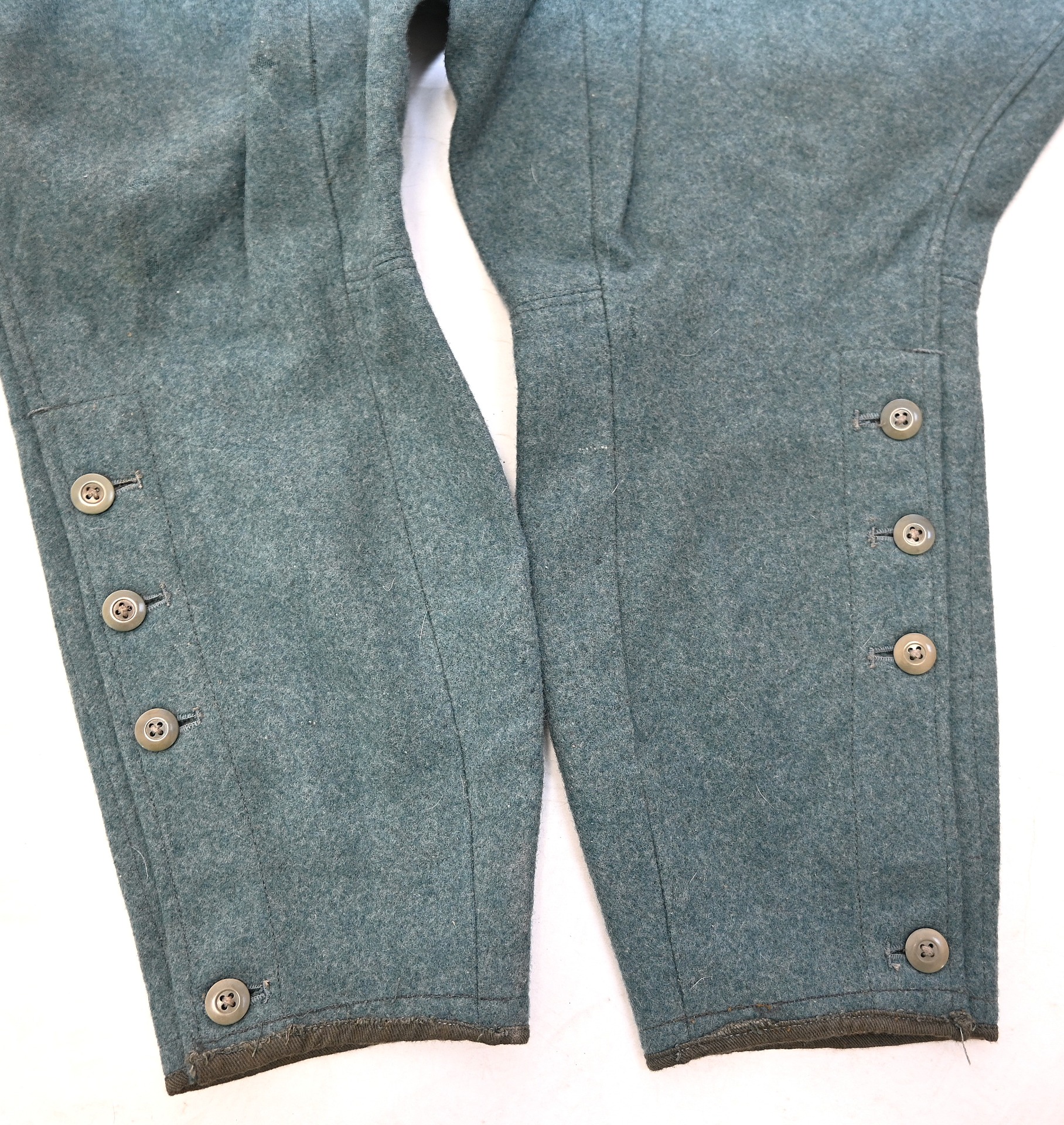 The trousers show overall normal signs of storage wear. It has a couple of tiny moth bites on both sides, but nothing major. It's complete with all buttons. Nicely marked on the inside with the makers initials and the size markings. Dated 1942.