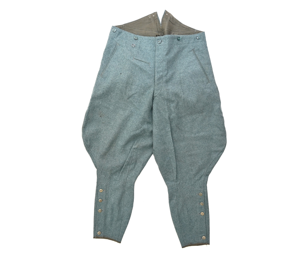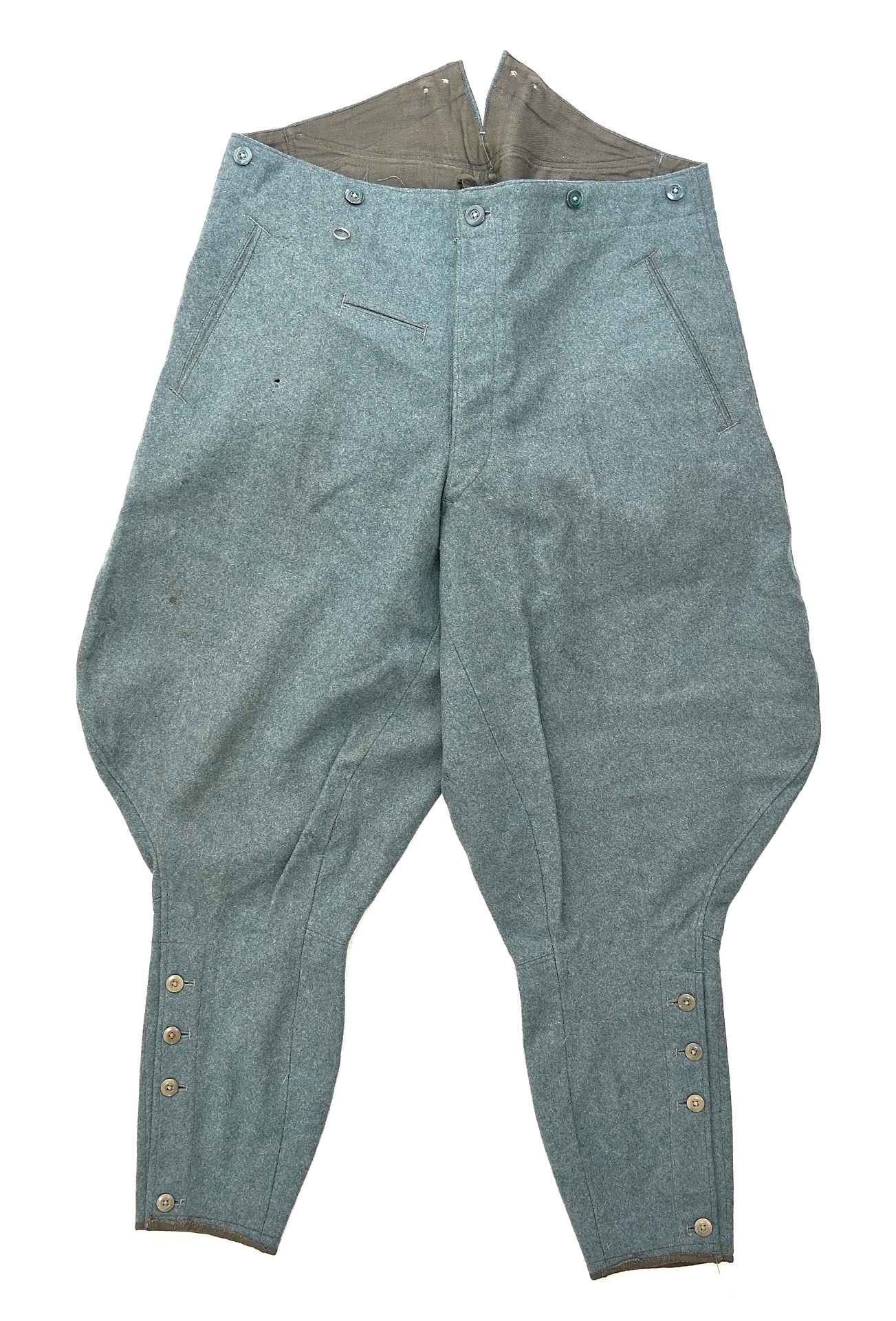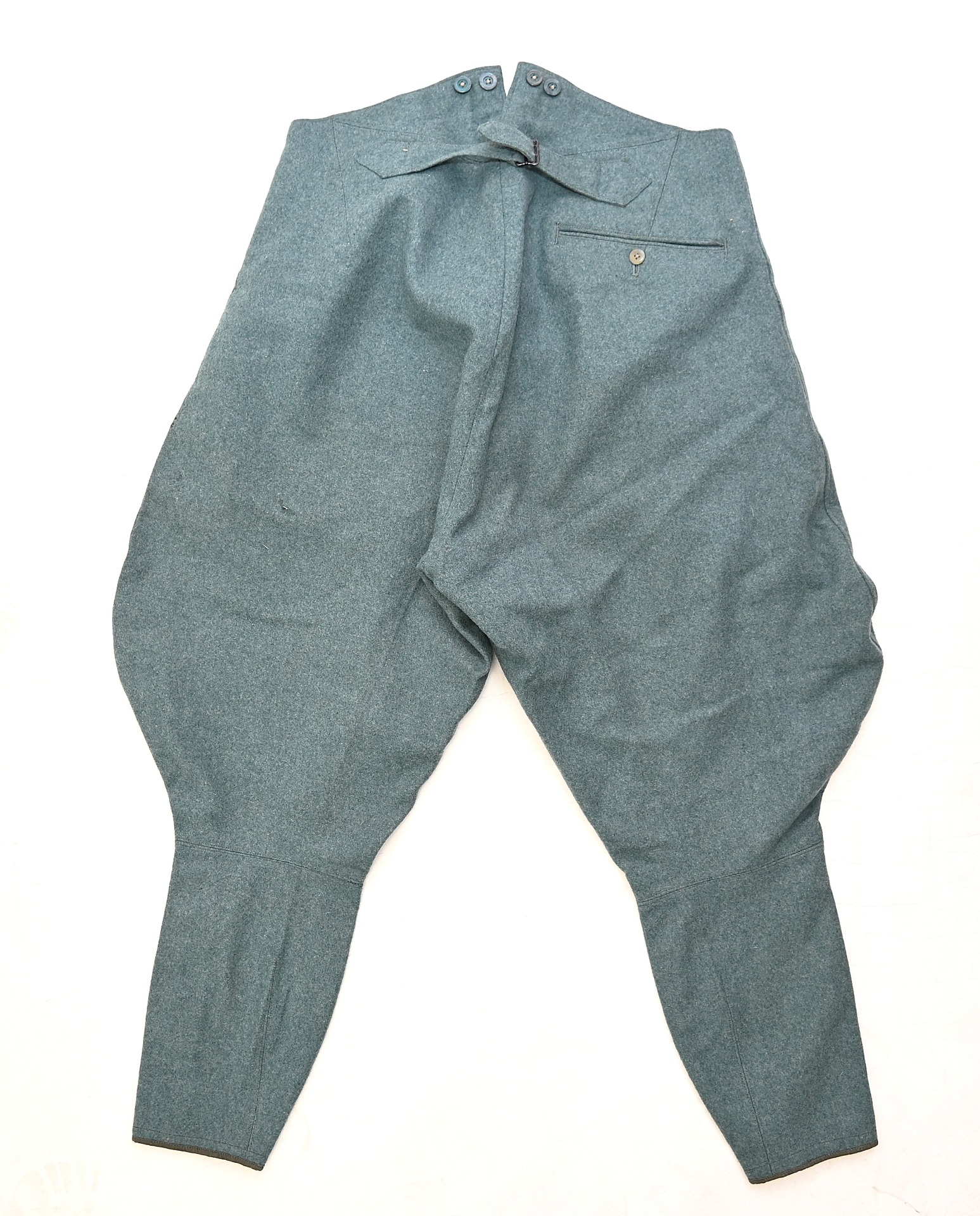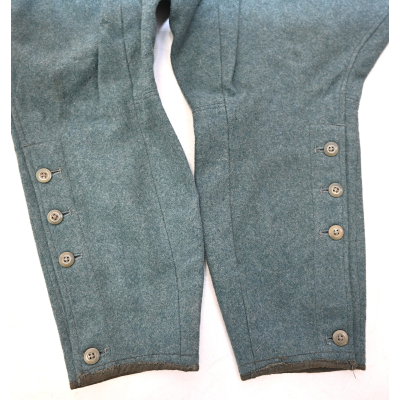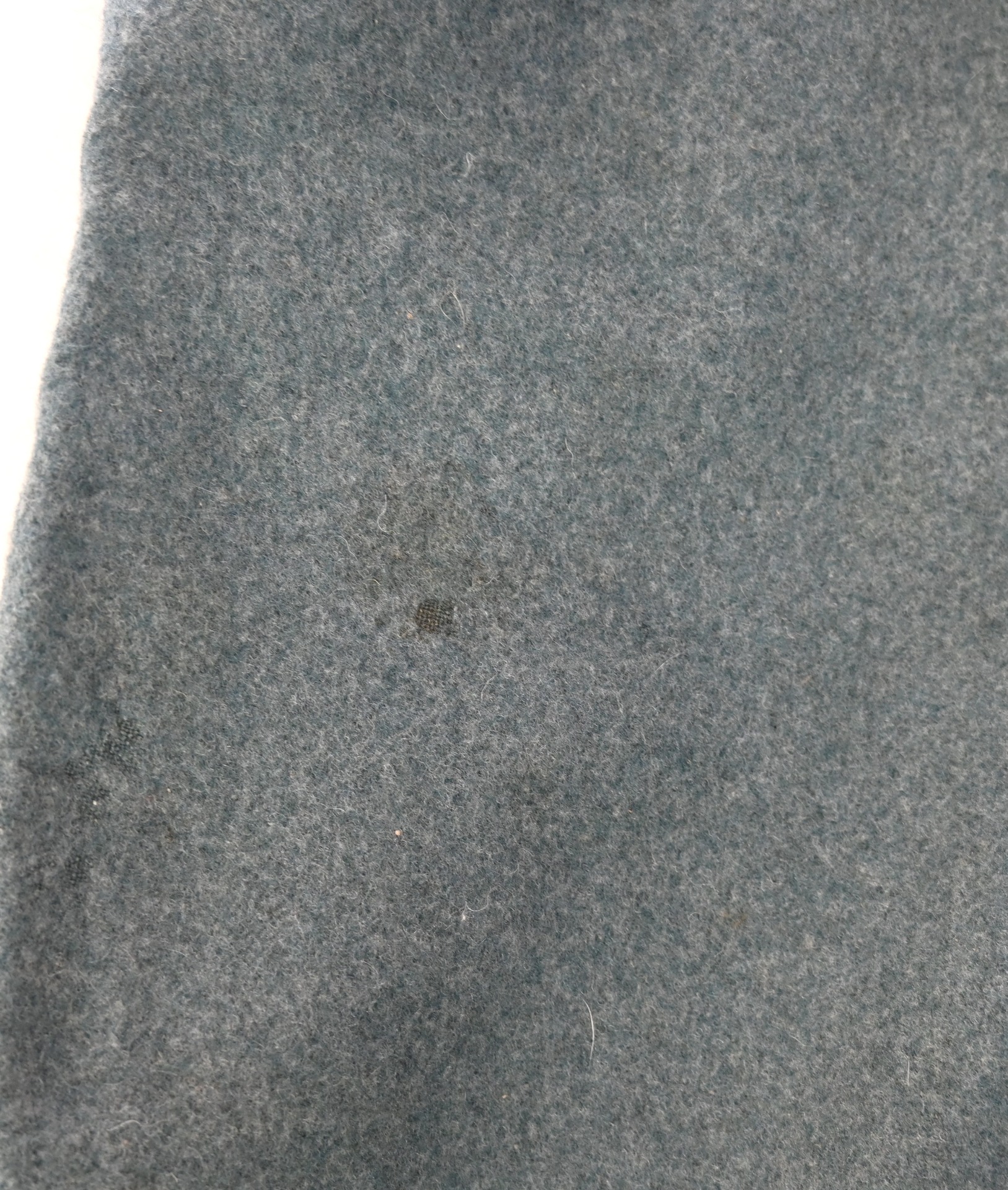 The trousers show overall normal signs of storage wear. It has a couple of tiny moth bites on both sides, but nothing major. It's complete with all buttons. Nicely marked on the inside with the makers initials and the size markings. Dated 1942.