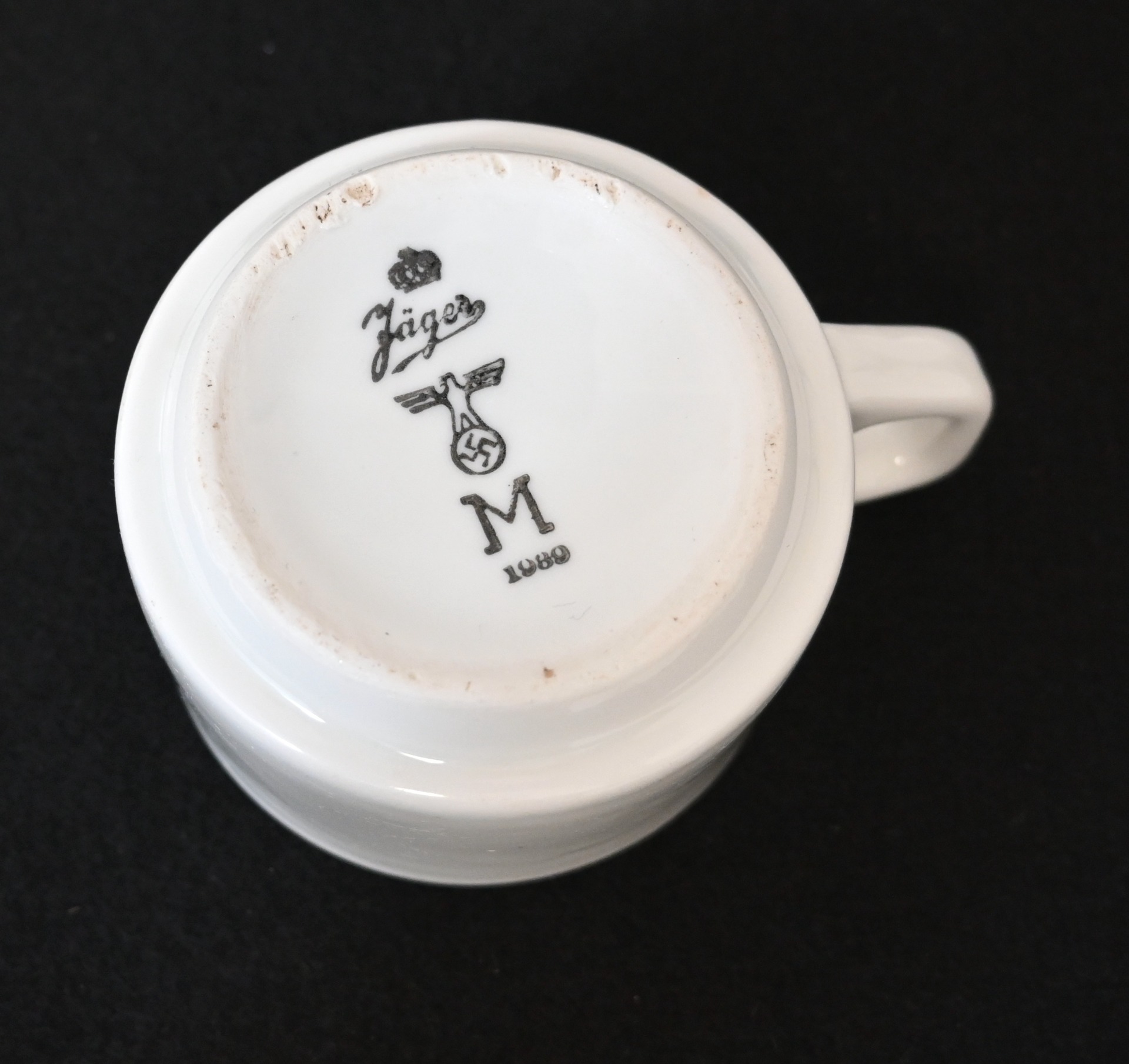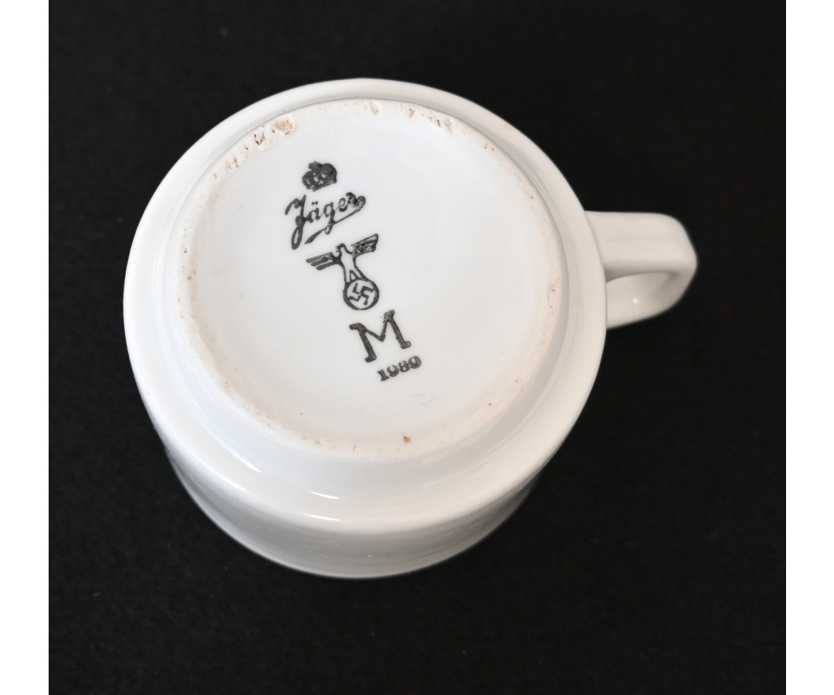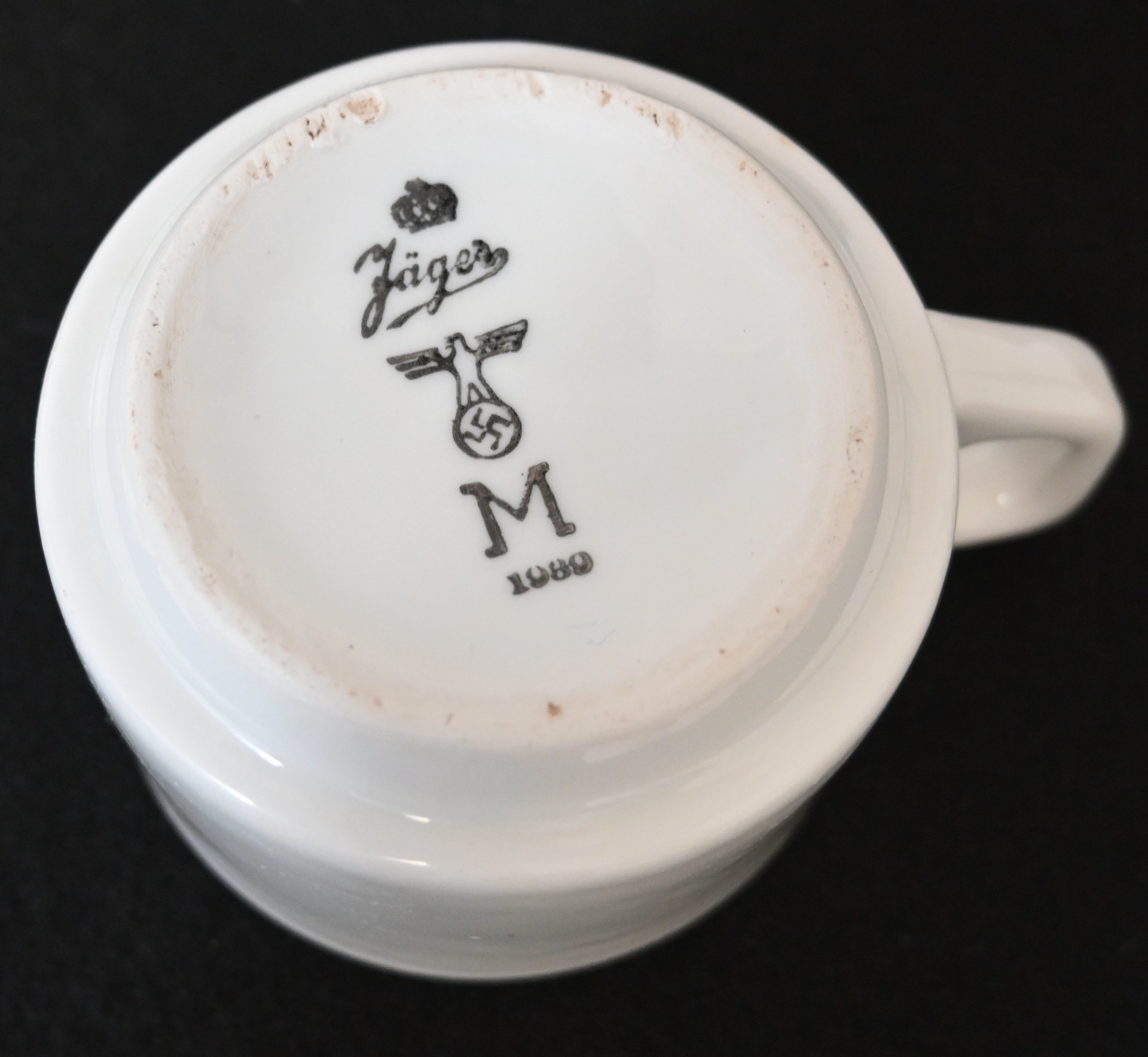 The cup is in used but good condition. It shows normal signs of usage/scratches. Nicely marked on the bottom with the Kriegsmarine eagle, the maker 'Jäger' and year of production '1939'.