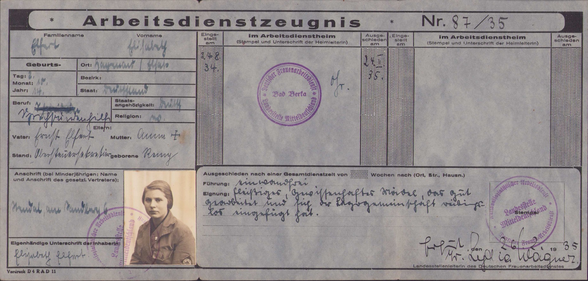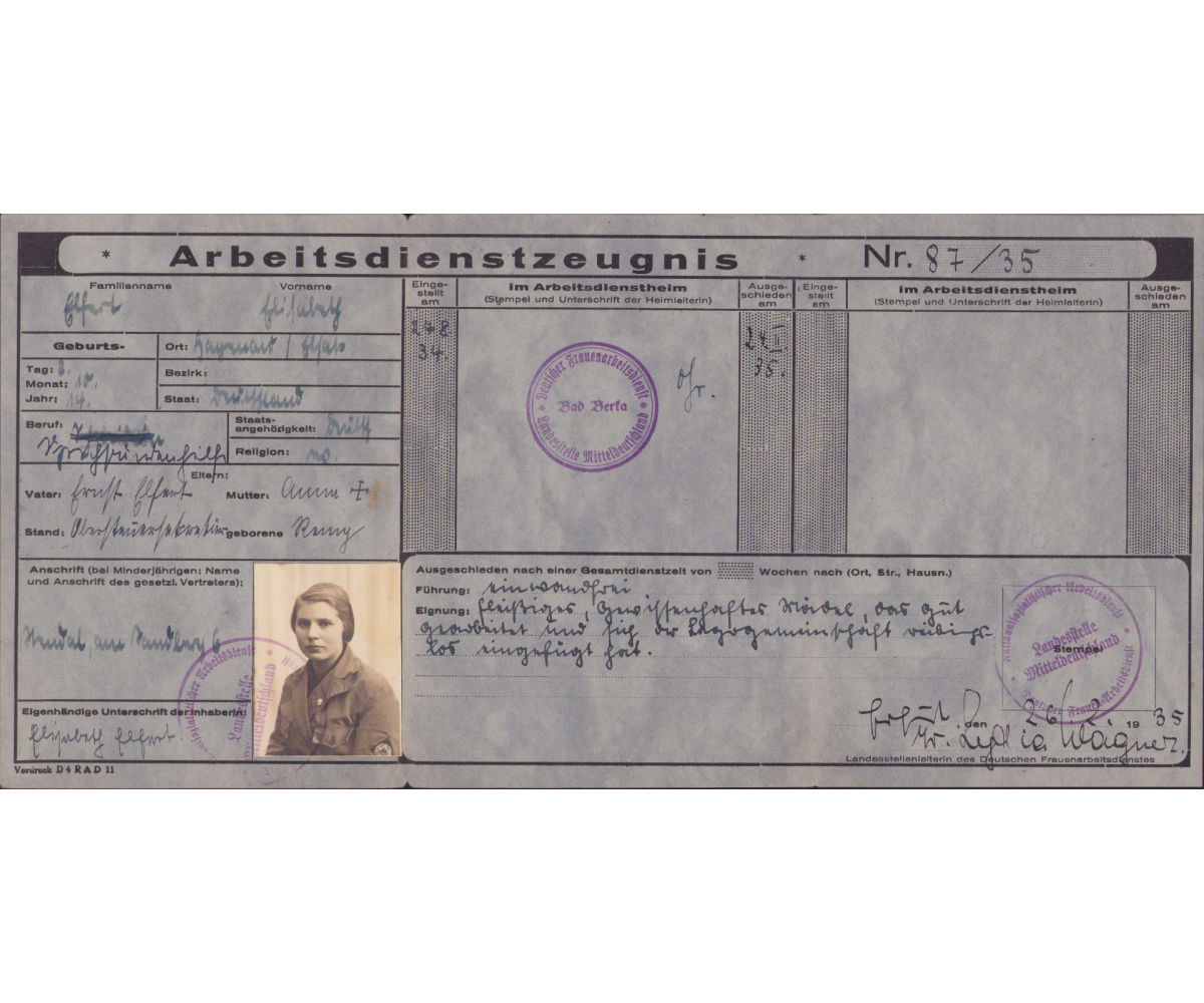 The card/pass shows overall normal signs of wear. It belonged to a girl who srved within the Reichsarbeitsdienst der Weiblichen Jugend. It's complete with portrait. Dated February 1935.