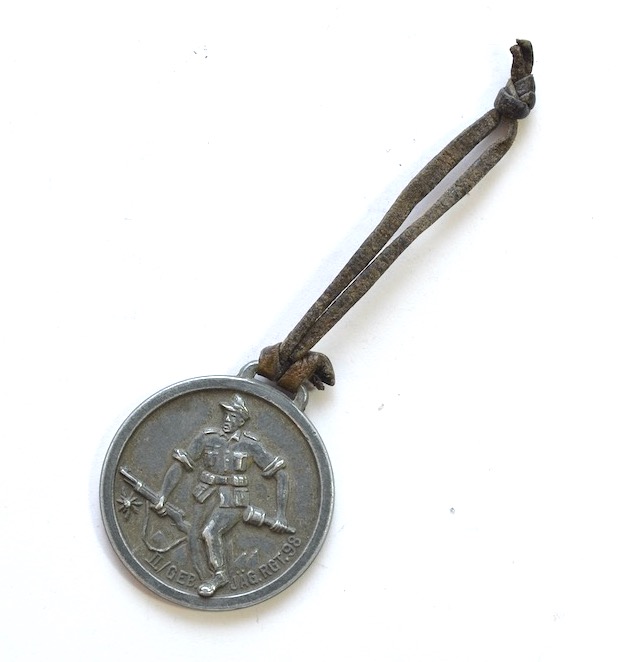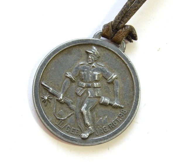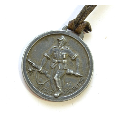 The pendant is in good condition. It shows normal signs of wear. Complete with it's original attached string. It's a pendant which has been issued to members of the II Kompanie Gebirgsjäger Regiment 98. This regiment was part of the 1.Gebirgs-Division and saw combat on different fronts like Poland, France, Yugoslavia, Russia, Greece, Serbia and Hungary. Not an easy to find pendant.
