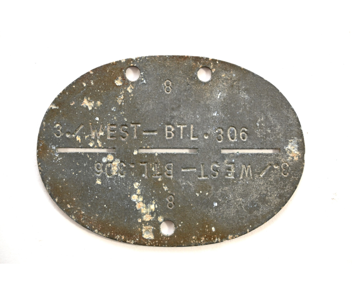 The tag or 'Erkennungsmarke' shows overall normal signs of wear. It belonged to a soldier who served in the 3.Kompanie Westheer Bataillon 306, but was also known as the I.Bataillon Kampfgruppe Katzmann. This bataillon was formed in September 1944 from the remains of the 84.Infanterie-Division that was destroyed in France. It consisted out of only 570 men and participated in the battle of Overloon in October 1944. After that it fought in the Kleve area. It was later used to form Grenadier Regiment 1062.