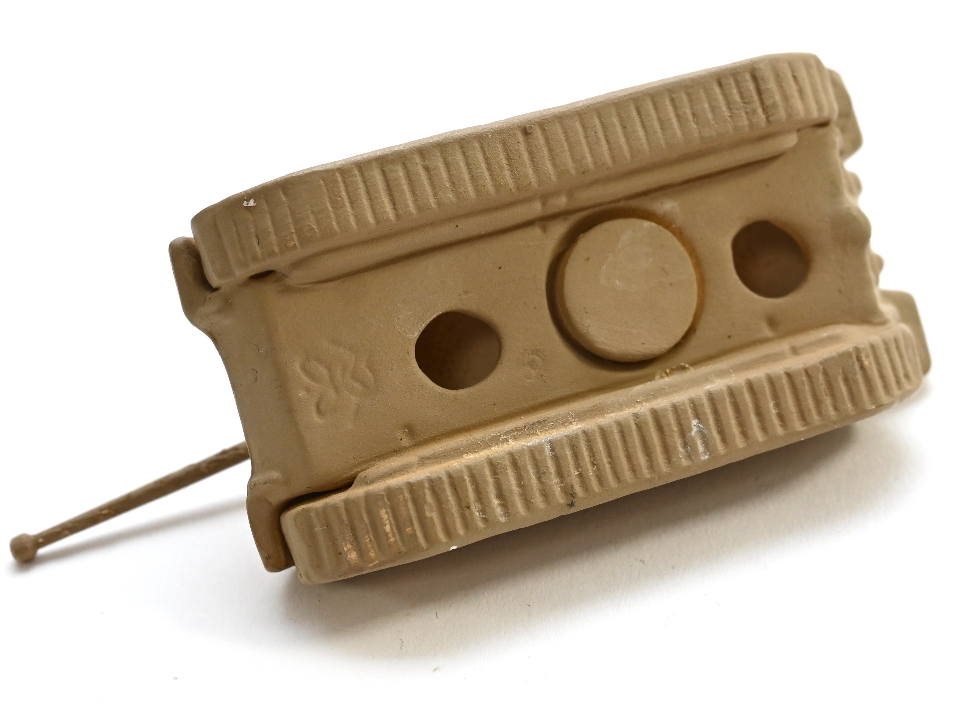 Only a handfull of these little panzers survived the war. The length (including barrel) is approx. 9cm. The panzer is made from Ceramic and the barrel of wood. The model Is made by the manufacturer 'Goebel', hence it's logo on the bottom.