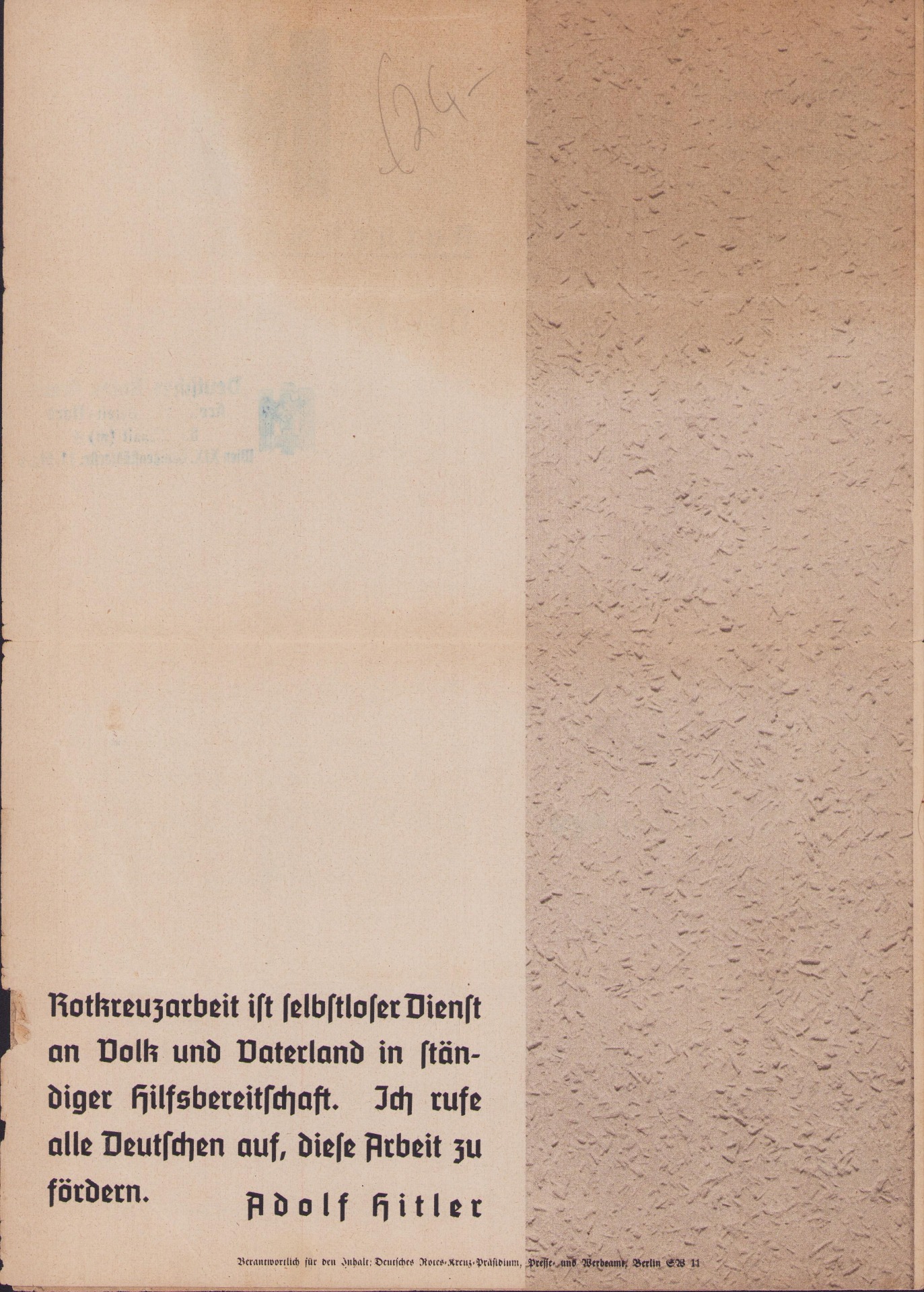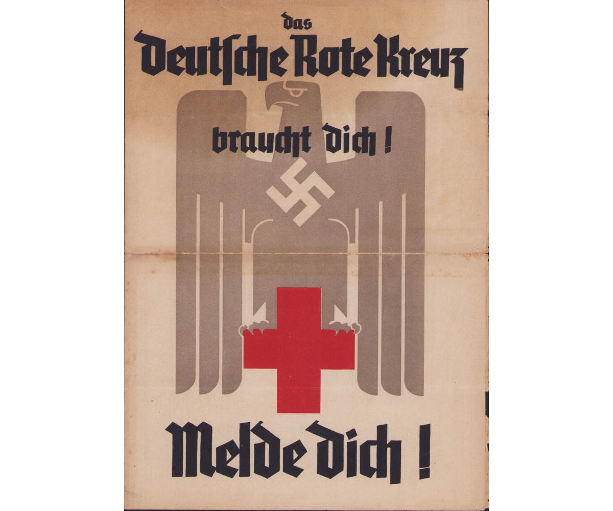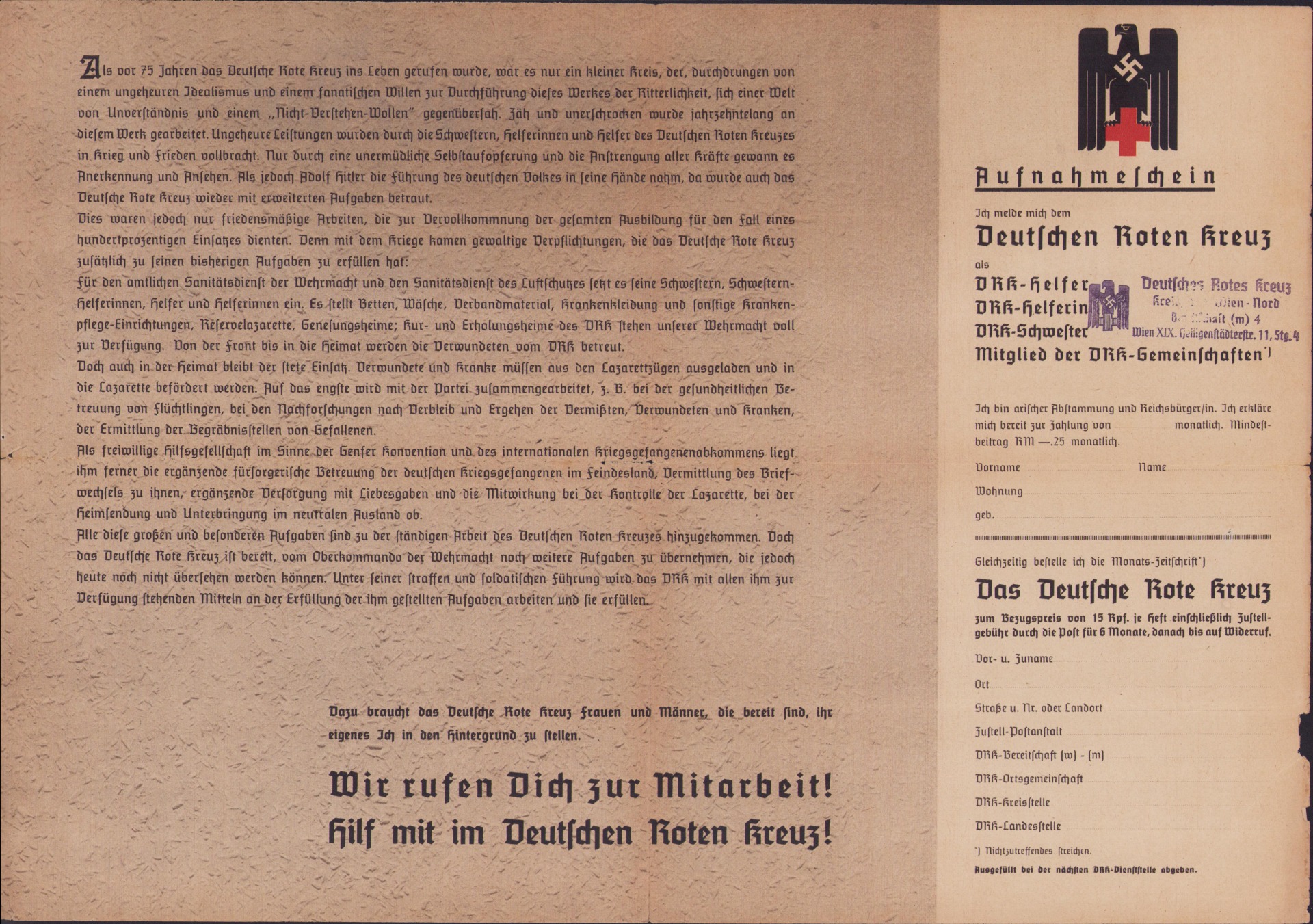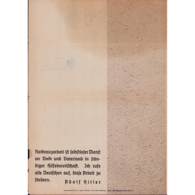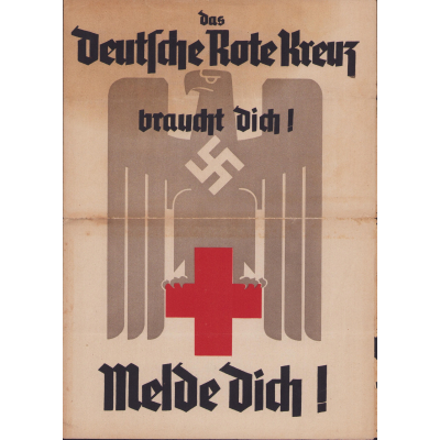 The folder shows overall normal signs of storage wear. Mainly on the edge of the second page. Its an application form to join the DRK as a DRK-Helfer, DRK-Helferin or as a Mitglied der DRK-Gemeinschaften. The size, when unfolded, is approx Din A3.