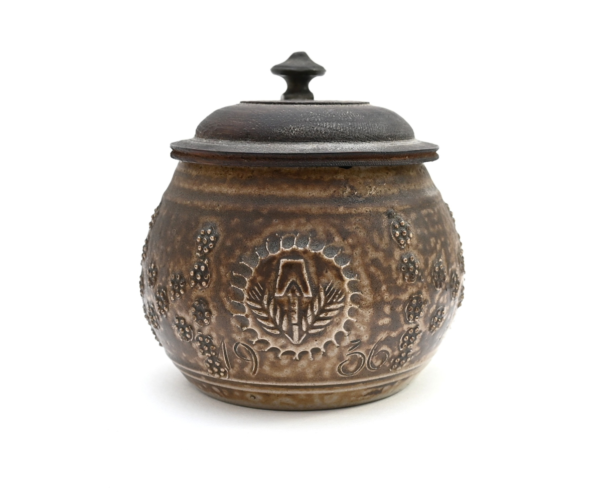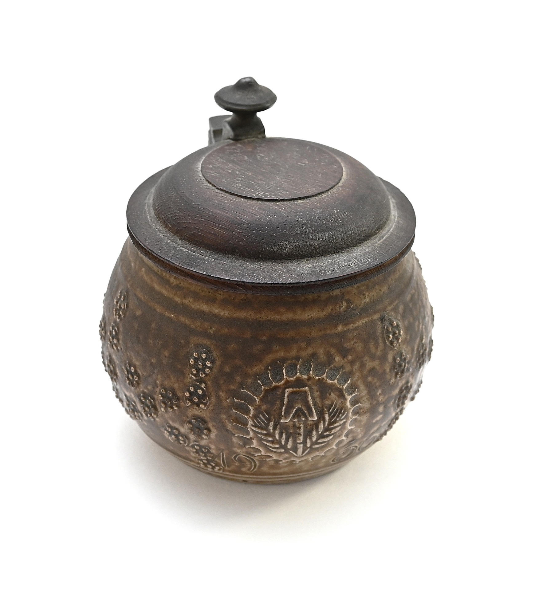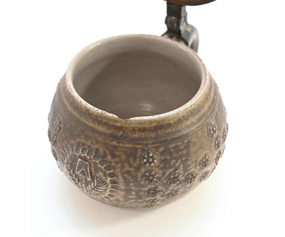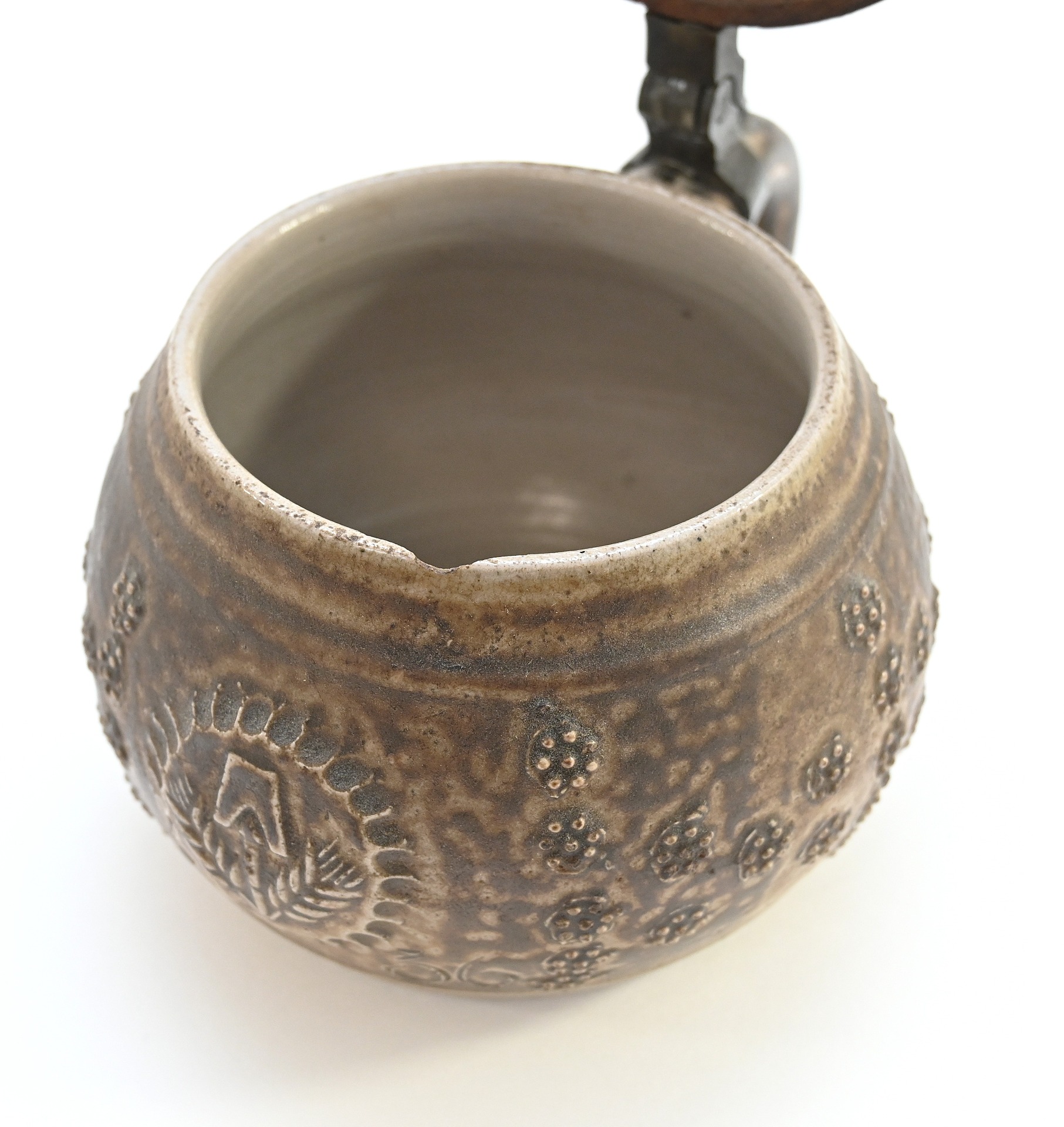 The beer stein shows overall normal signs of wear. It was issued in the year 1936. What makes this stein unique is that it has a wooden lid instead of a zinc one.