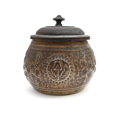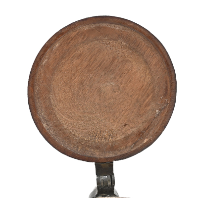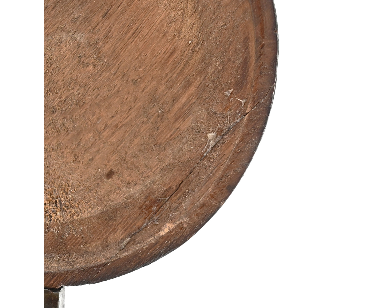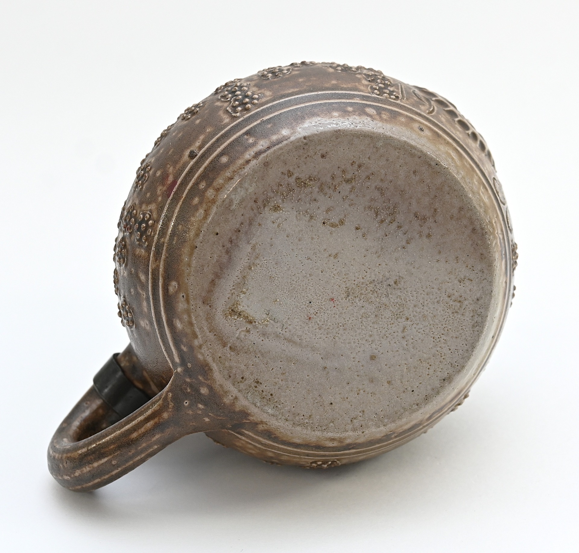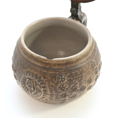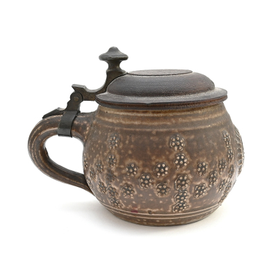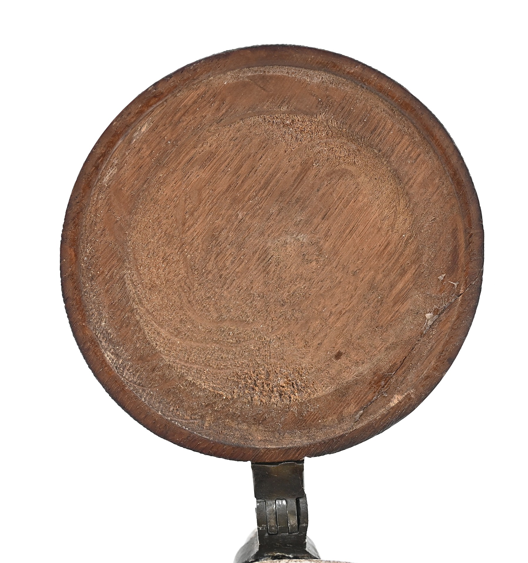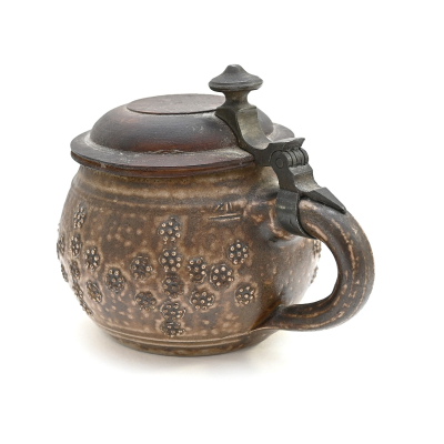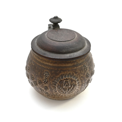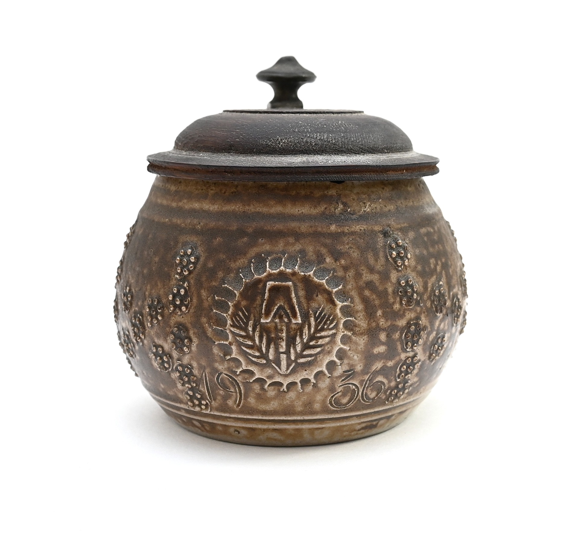 The beer stein shows overall normal signs of wear. It was issued in the year 1936. What makes this stein unique is that it has a wooden lid instead of a zinc one.