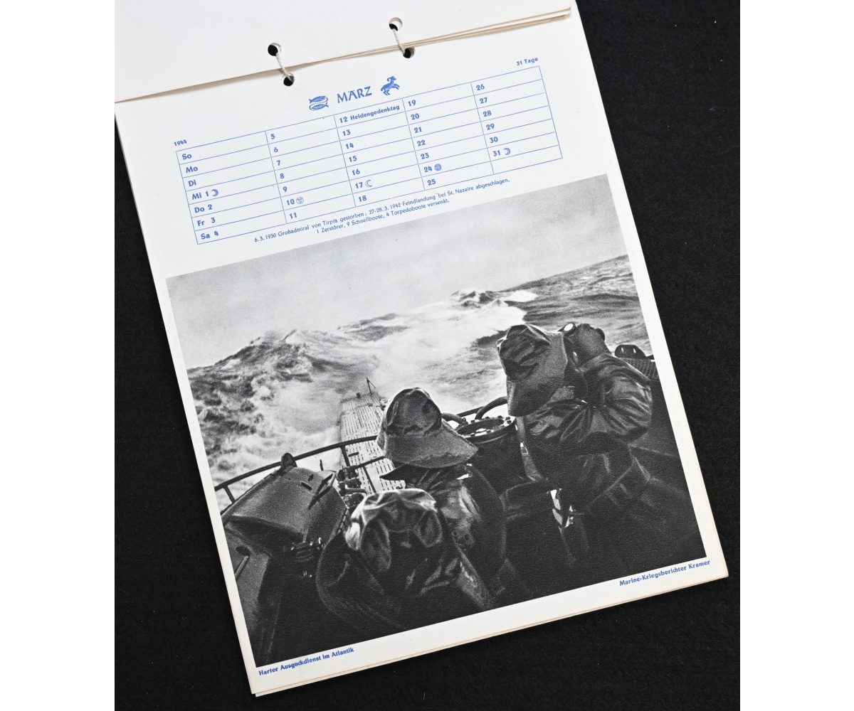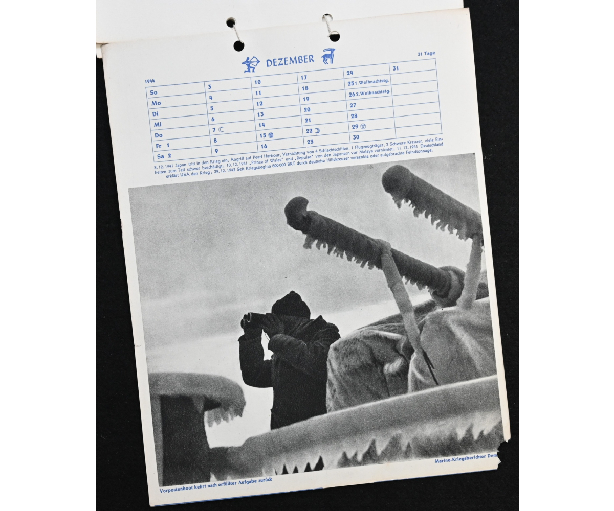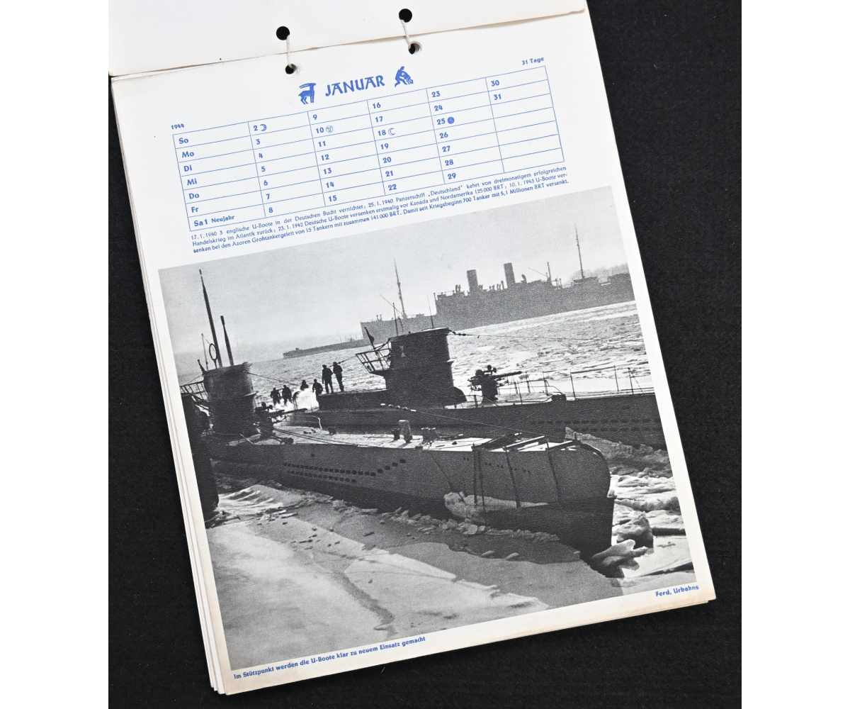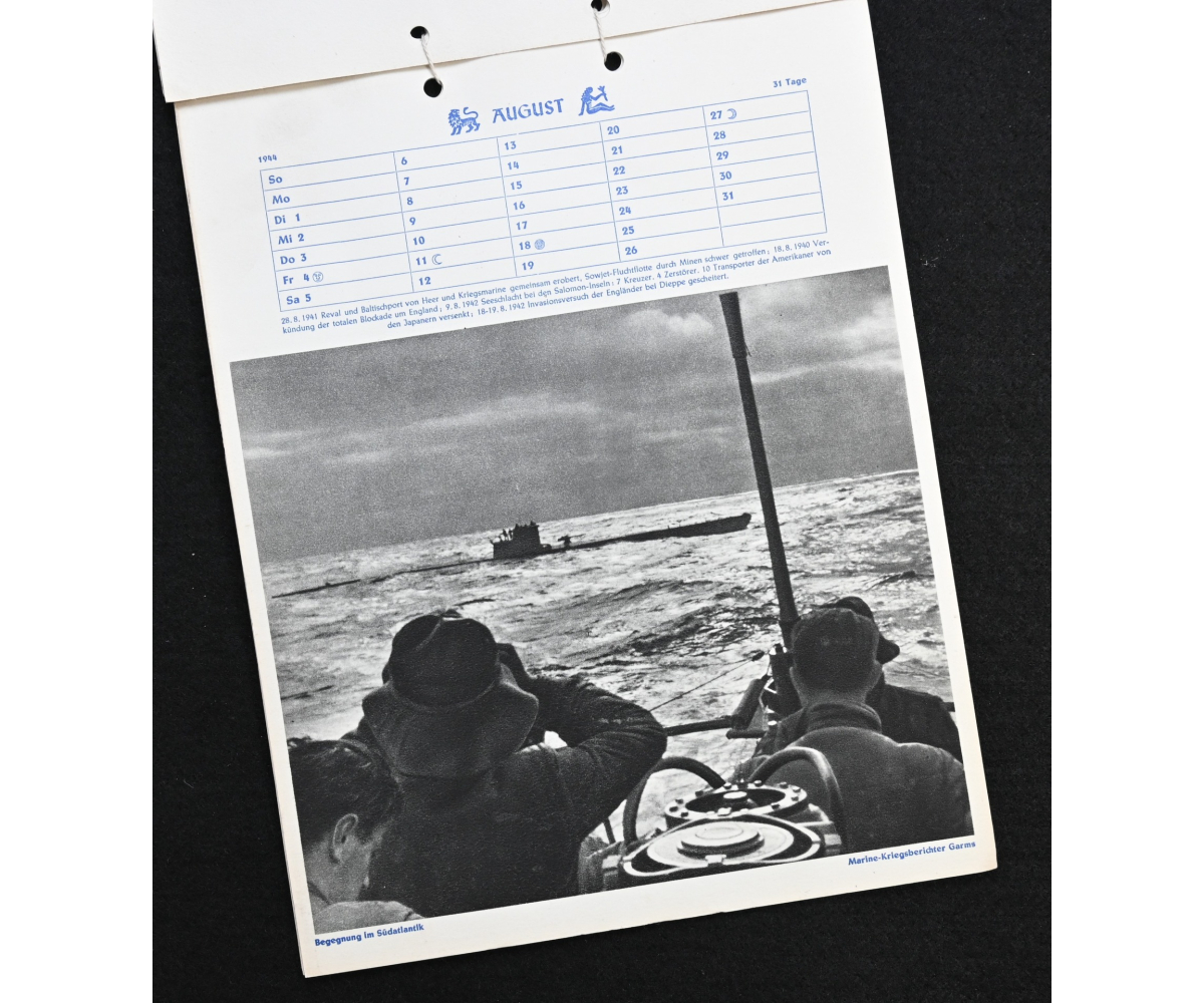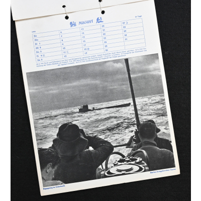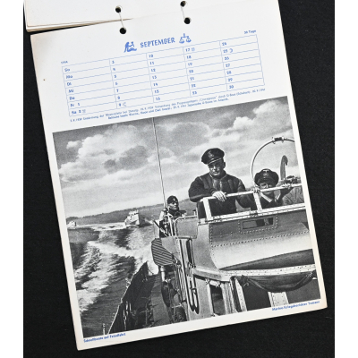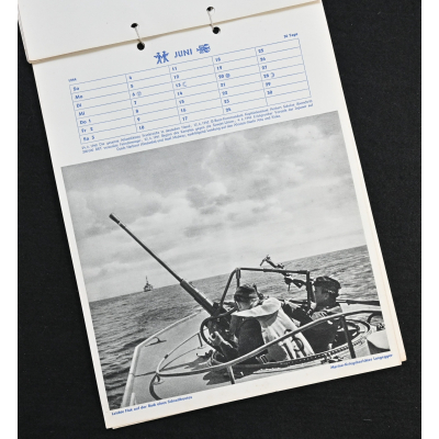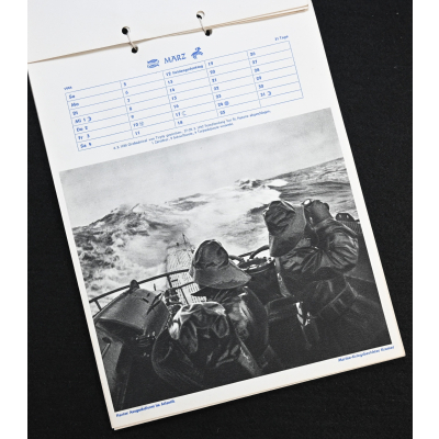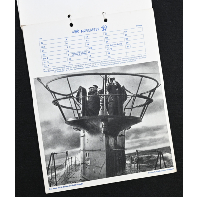 The kalender shows overall normal signs of wears. It's complete with all 13 pages. There is a awesome Kriegsmarine related photograph on each page. Issued in 1944.