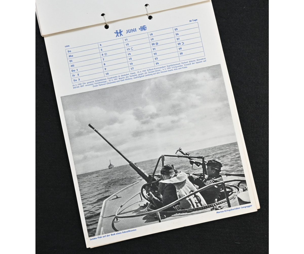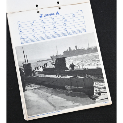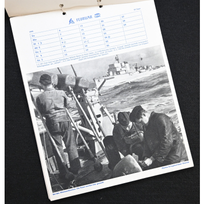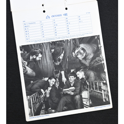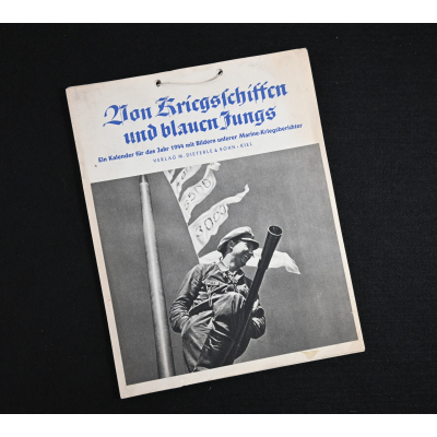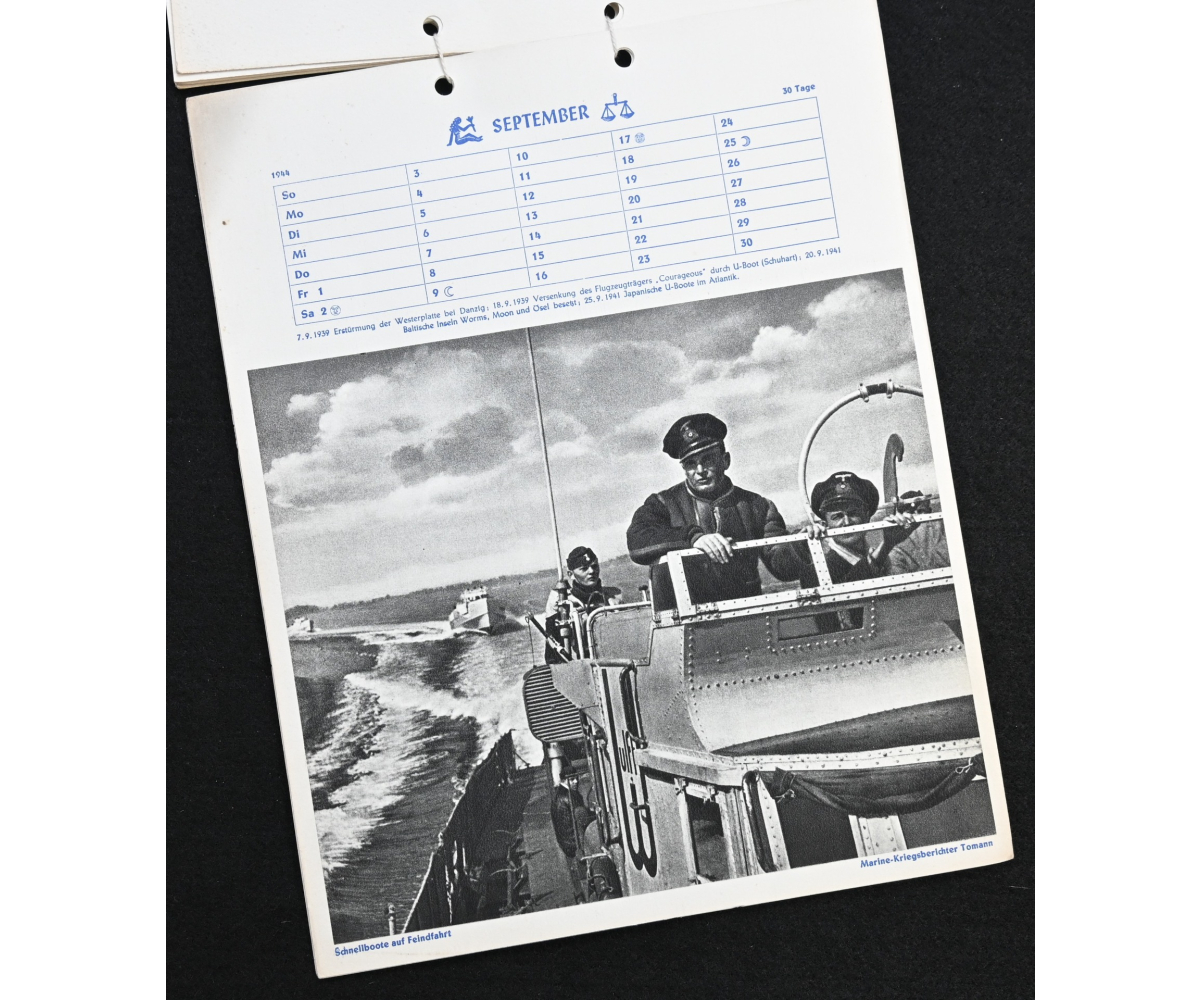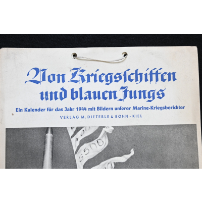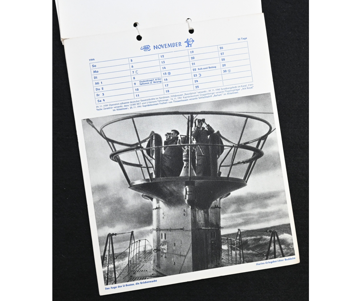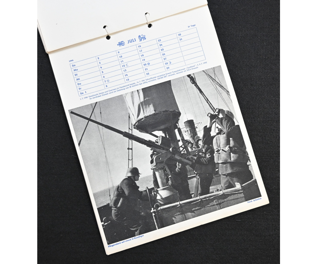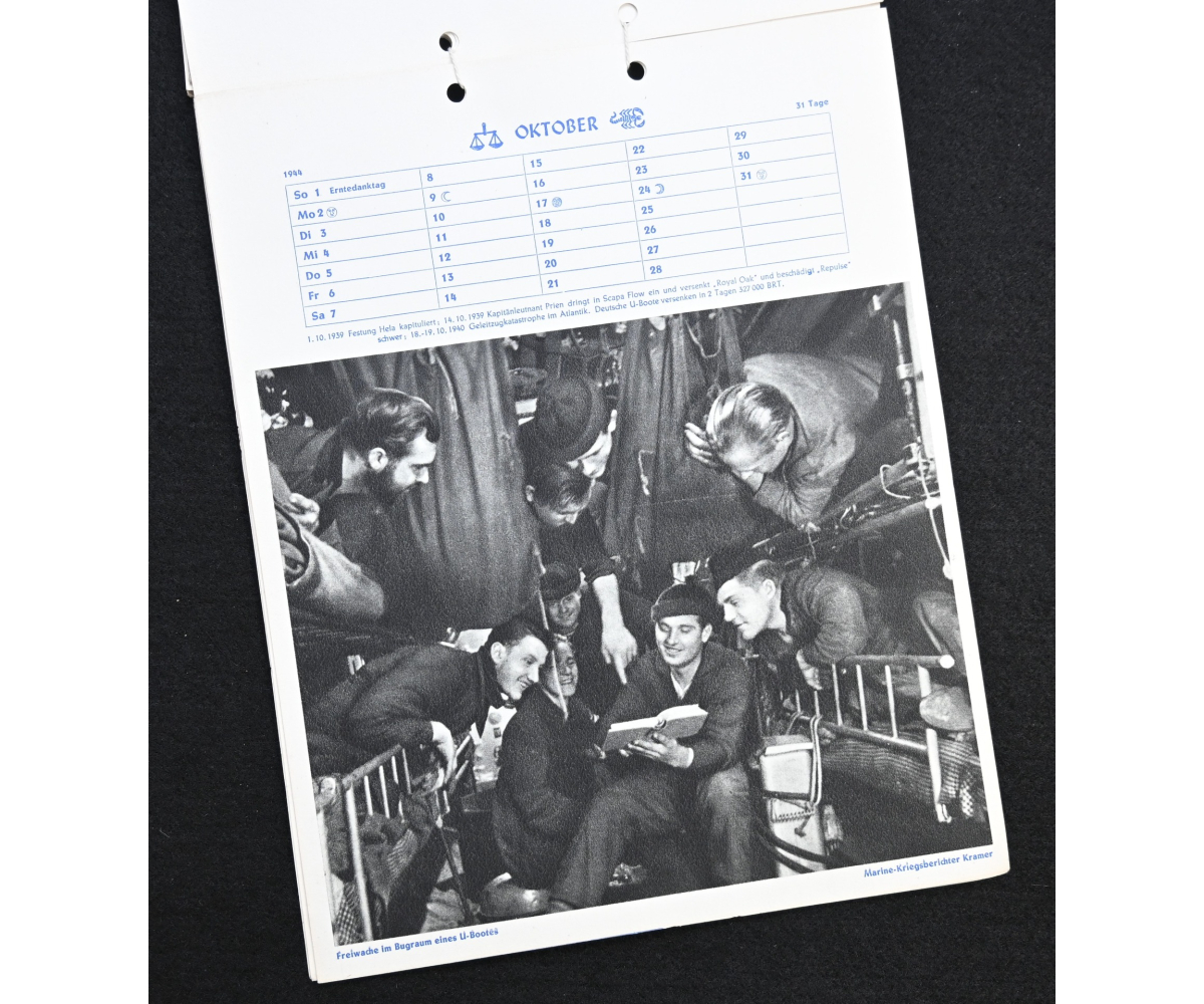 The kalender shows overall normal signs of wears. It's complete with all 13 pages. There is a awesome Kriegsmarine related photograph on each page. Issued in 1944.