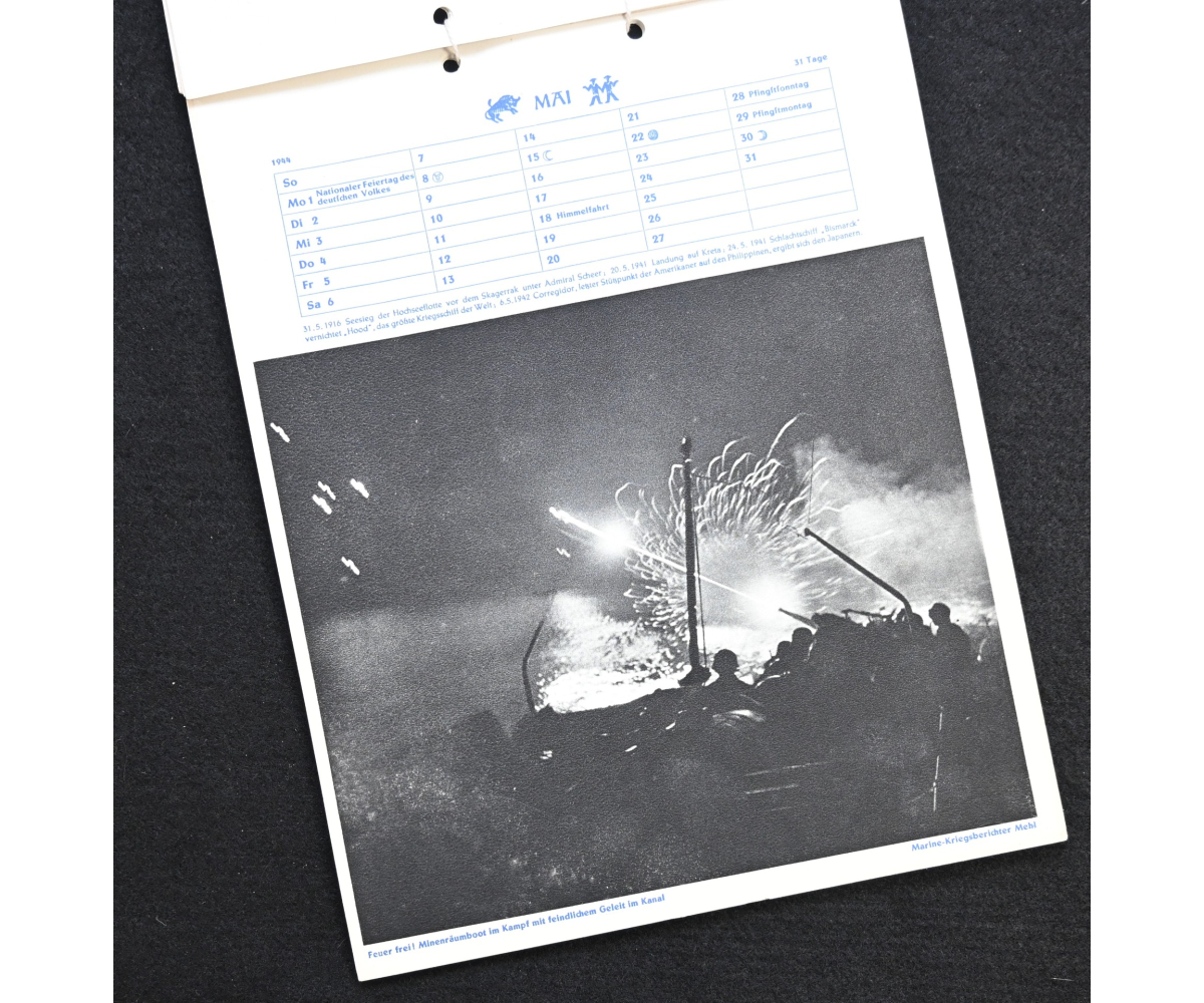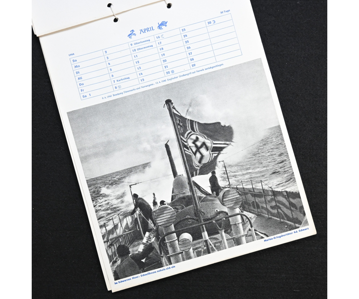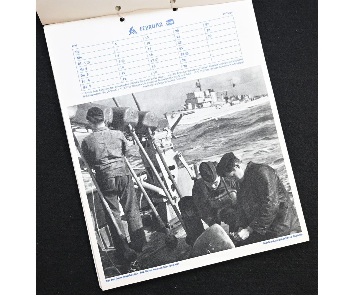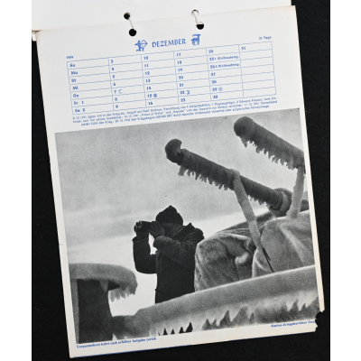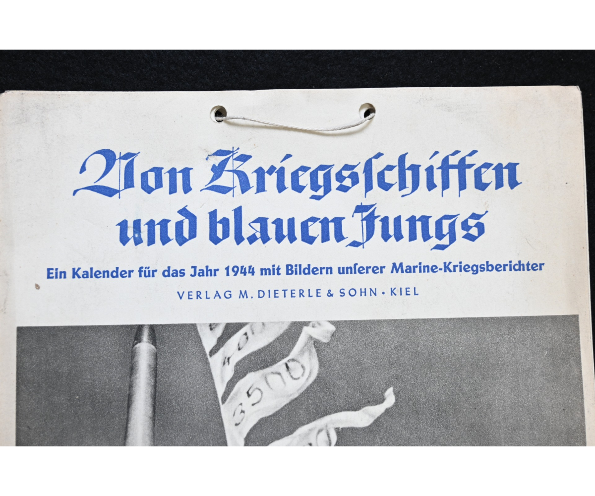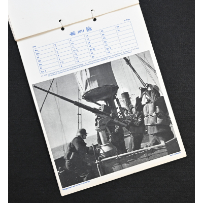 The kalender shows overall normal signs of wears. It's complete with all 13 pages. There is a awesome Kriegsmarine related photograph on each page. Issued in 1944.