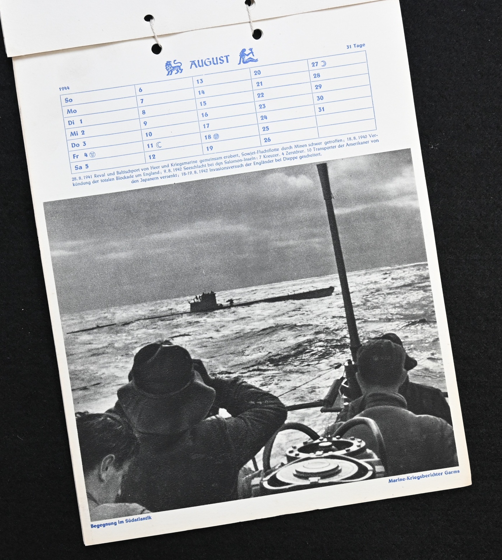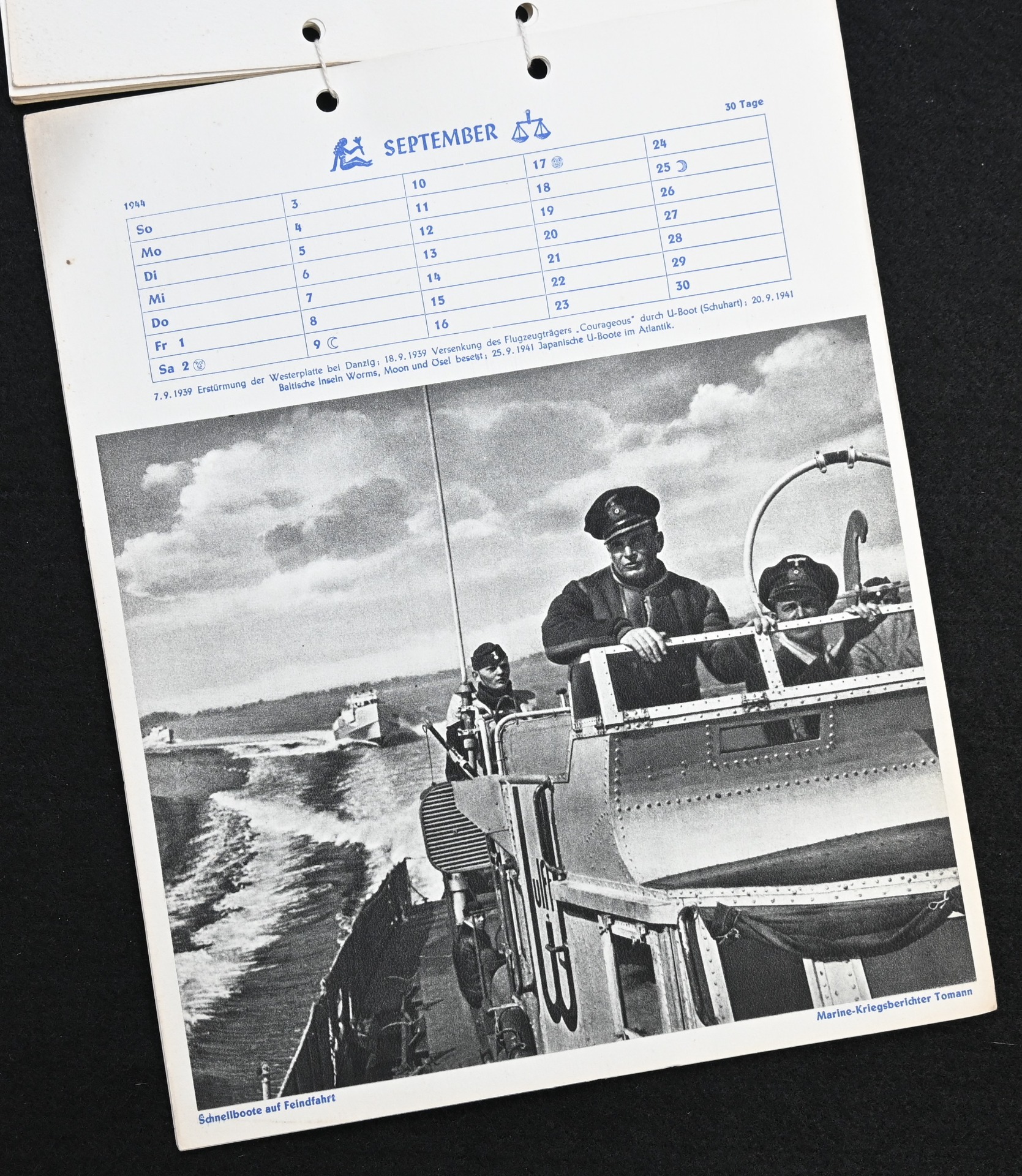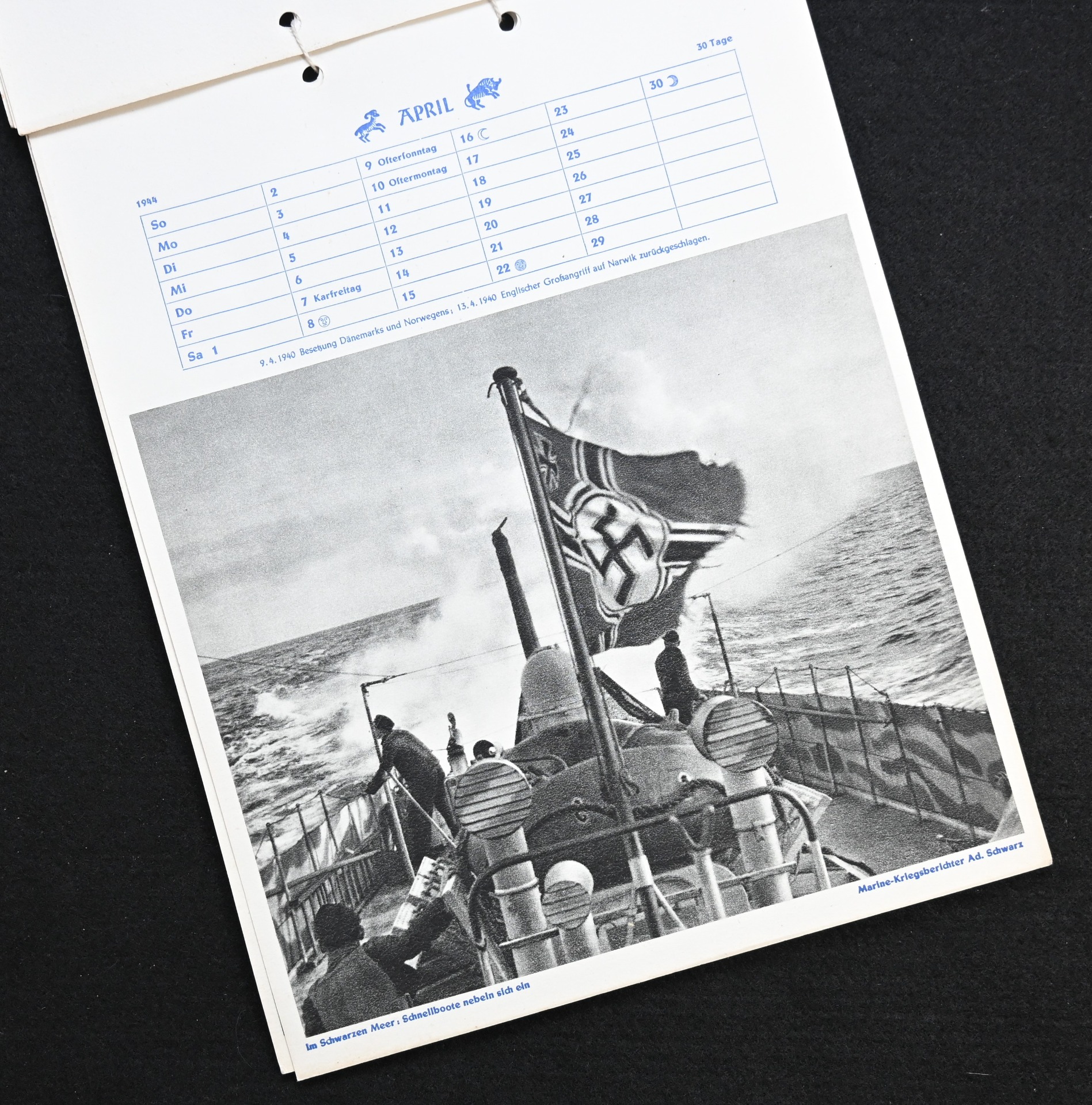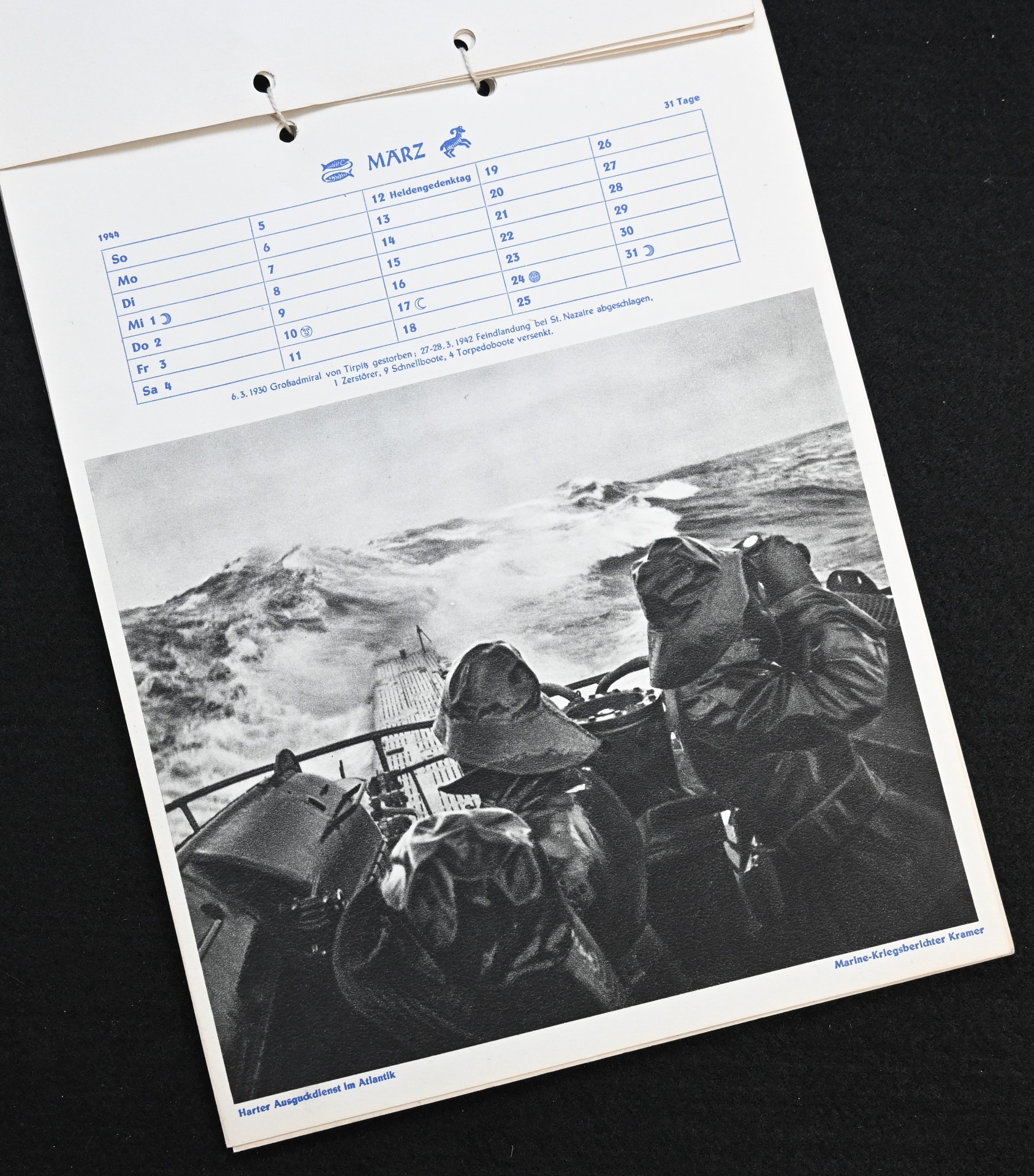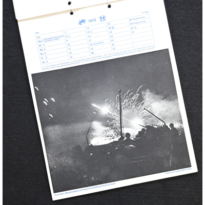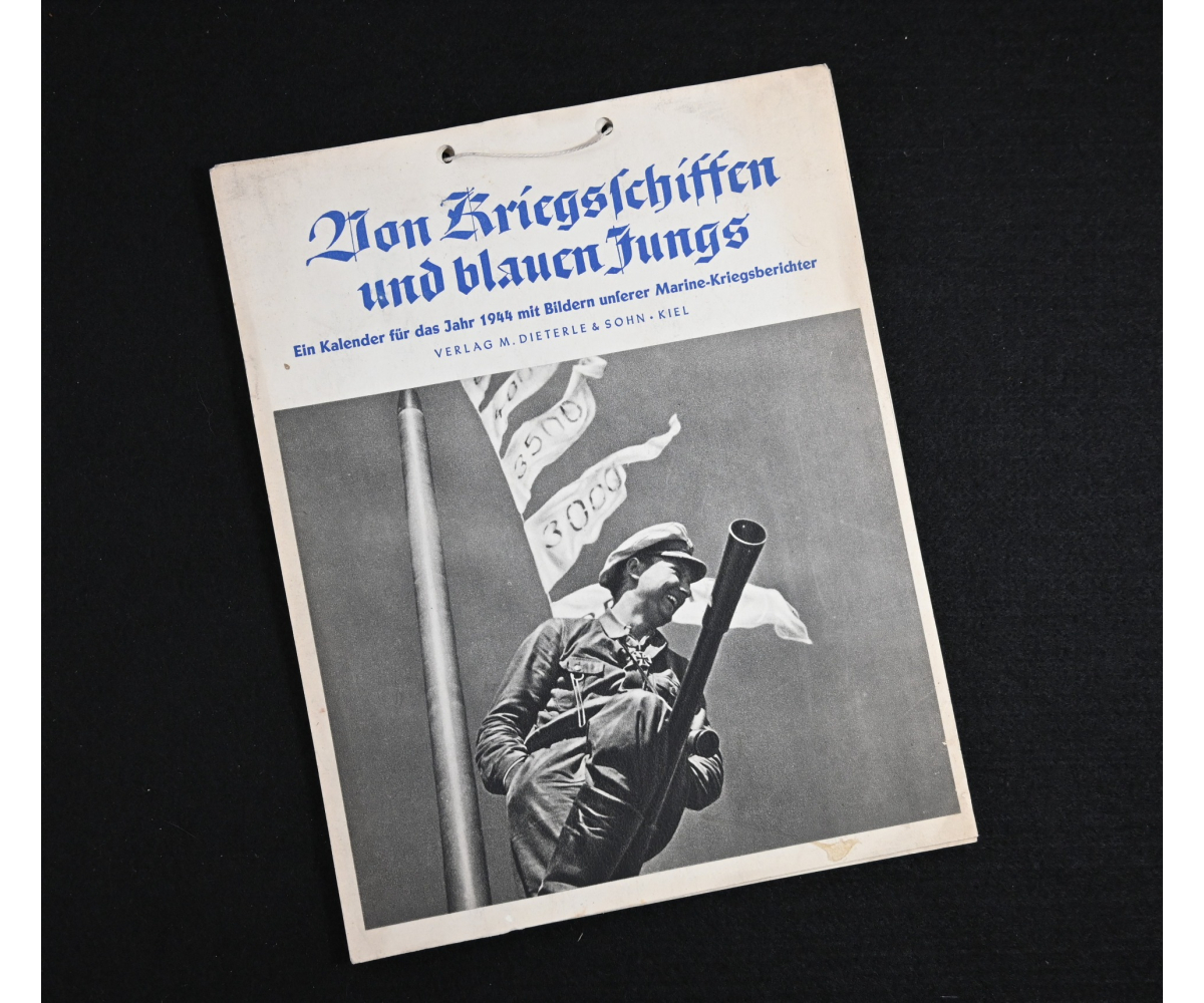 The kalender shows overall normal signs of wears. It's complete with all 13 pages. There is a awesome Kriegsmarine related photograph on each page. Issued in 1944.