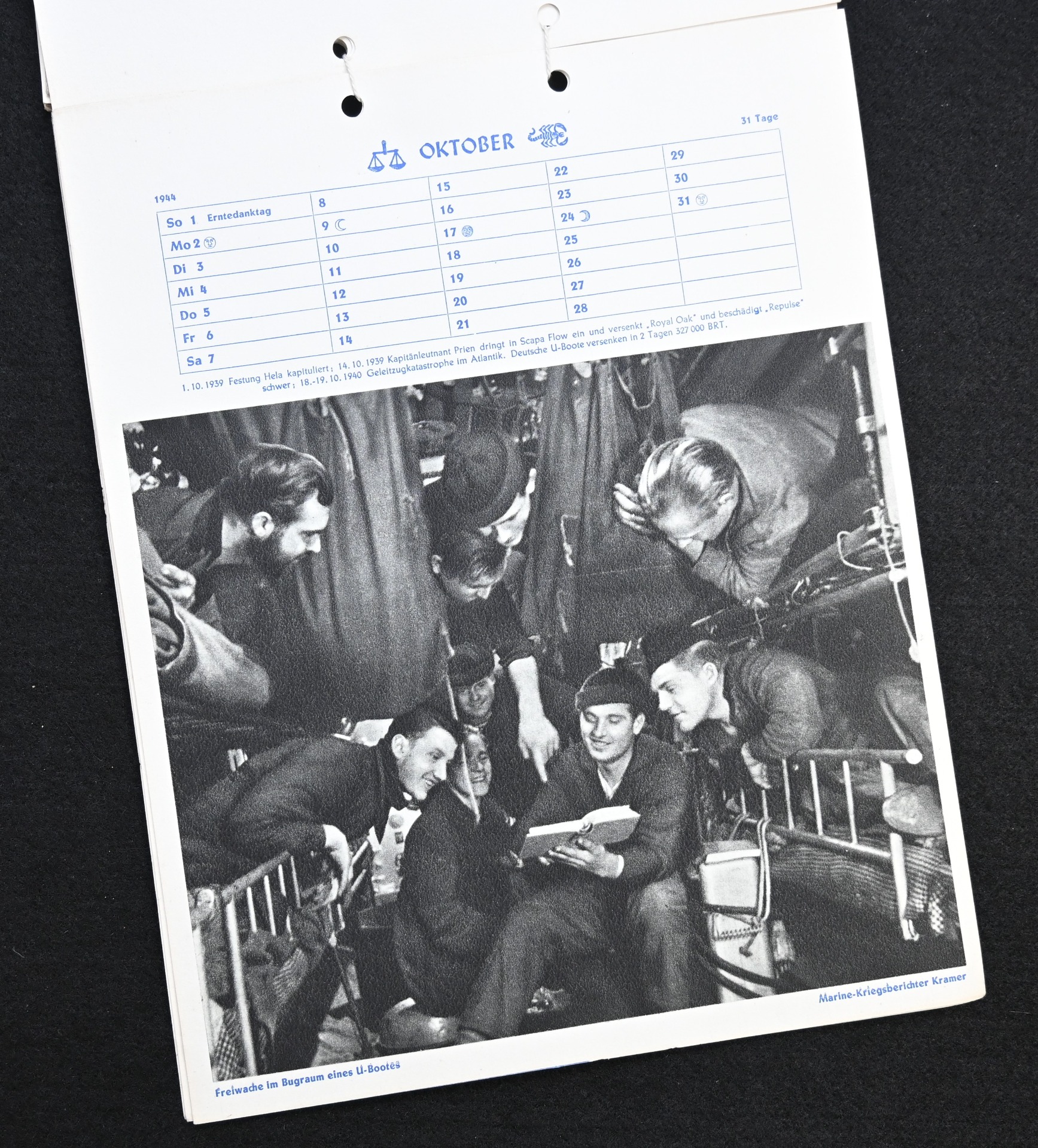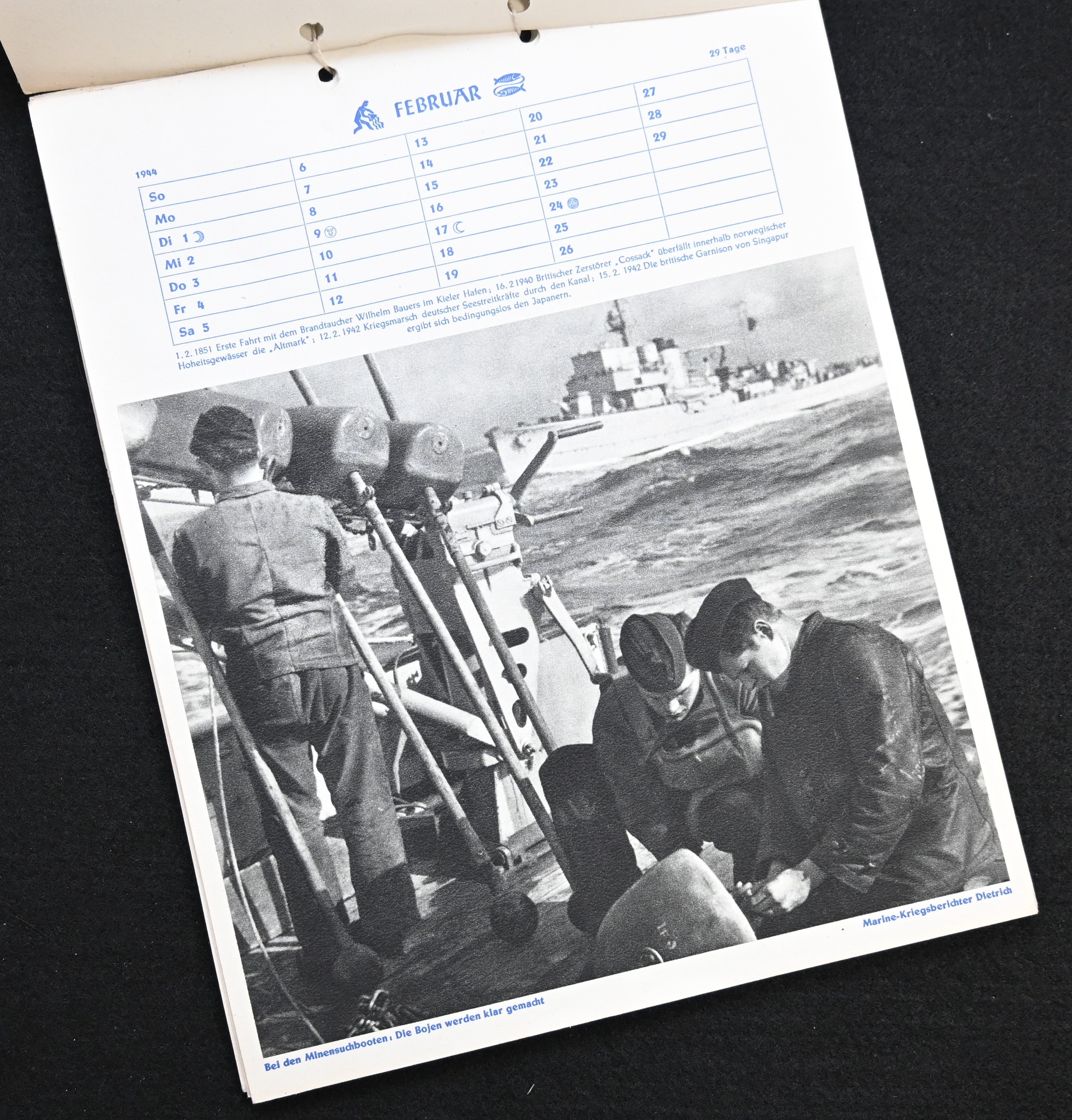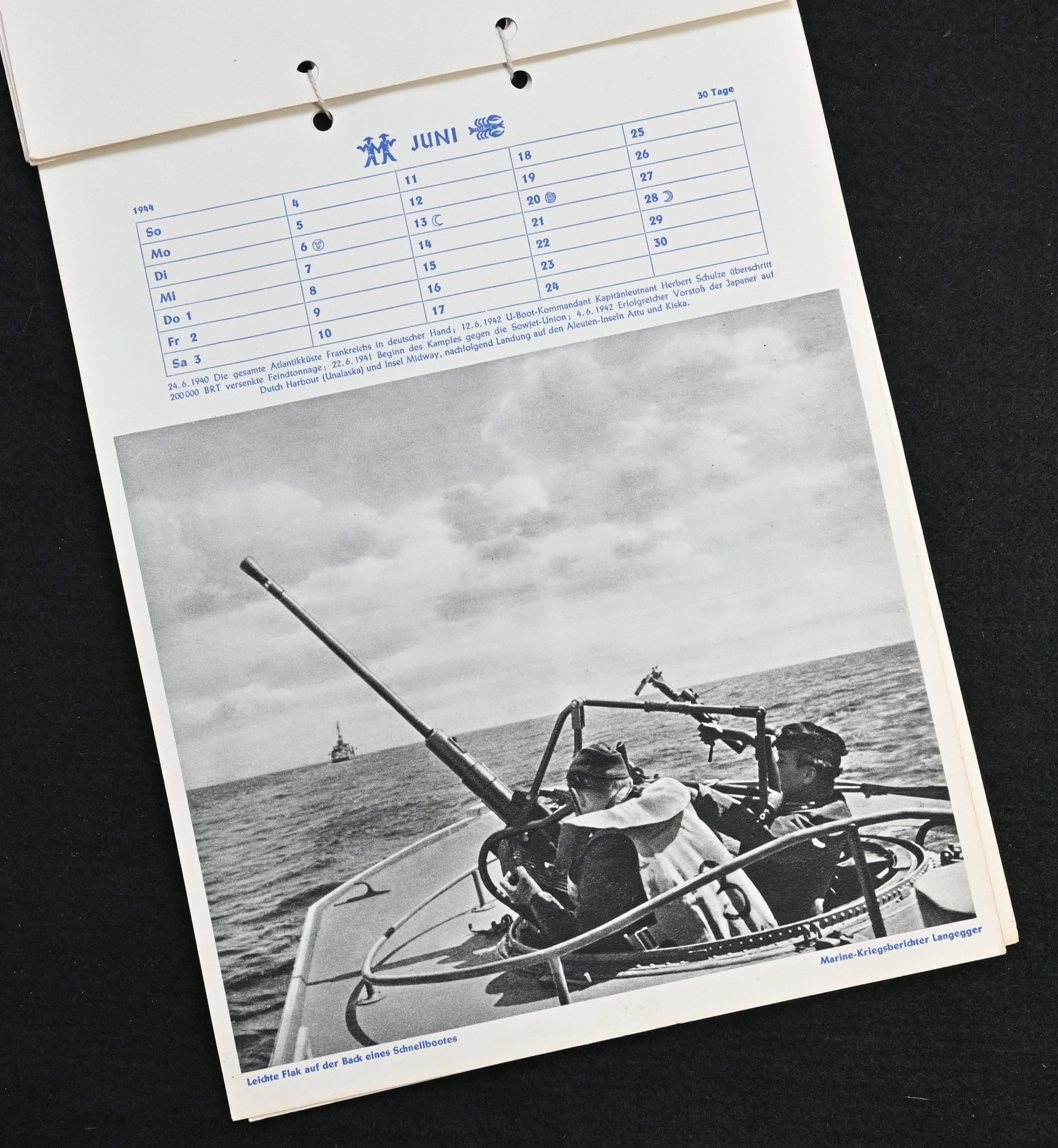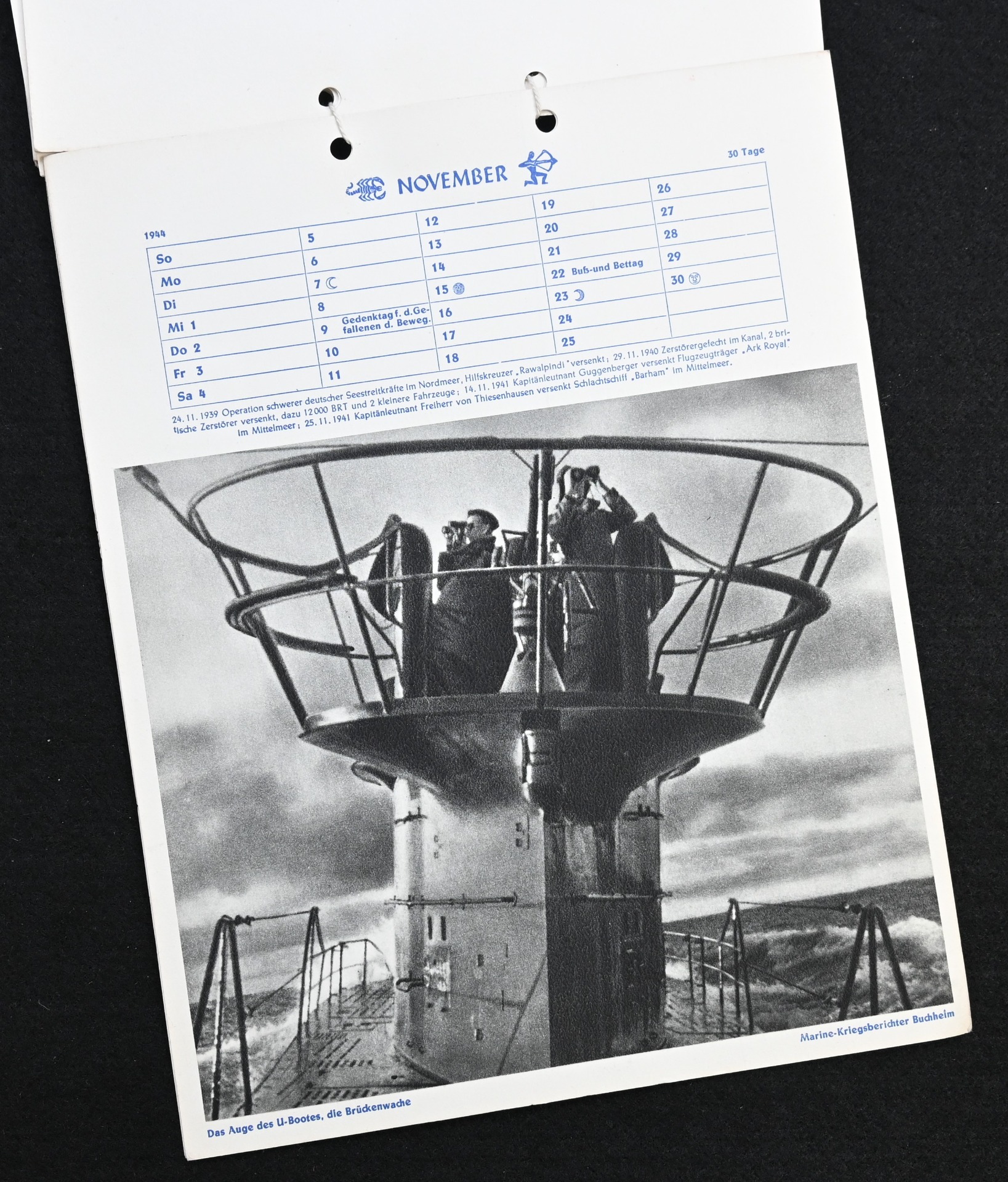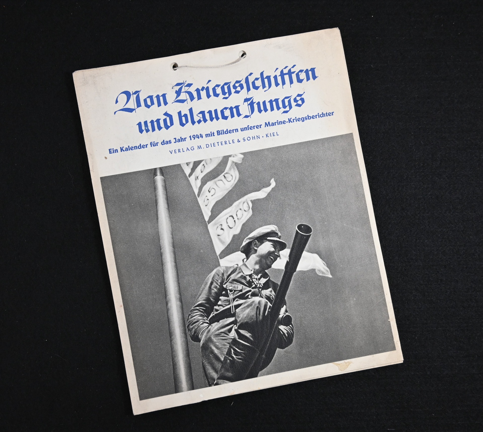The kalender shows overall normal signs of wears. It's complete with all 13 pages. There is a awesome Kriegsmarine related photograph on each page. Issued in 1944.