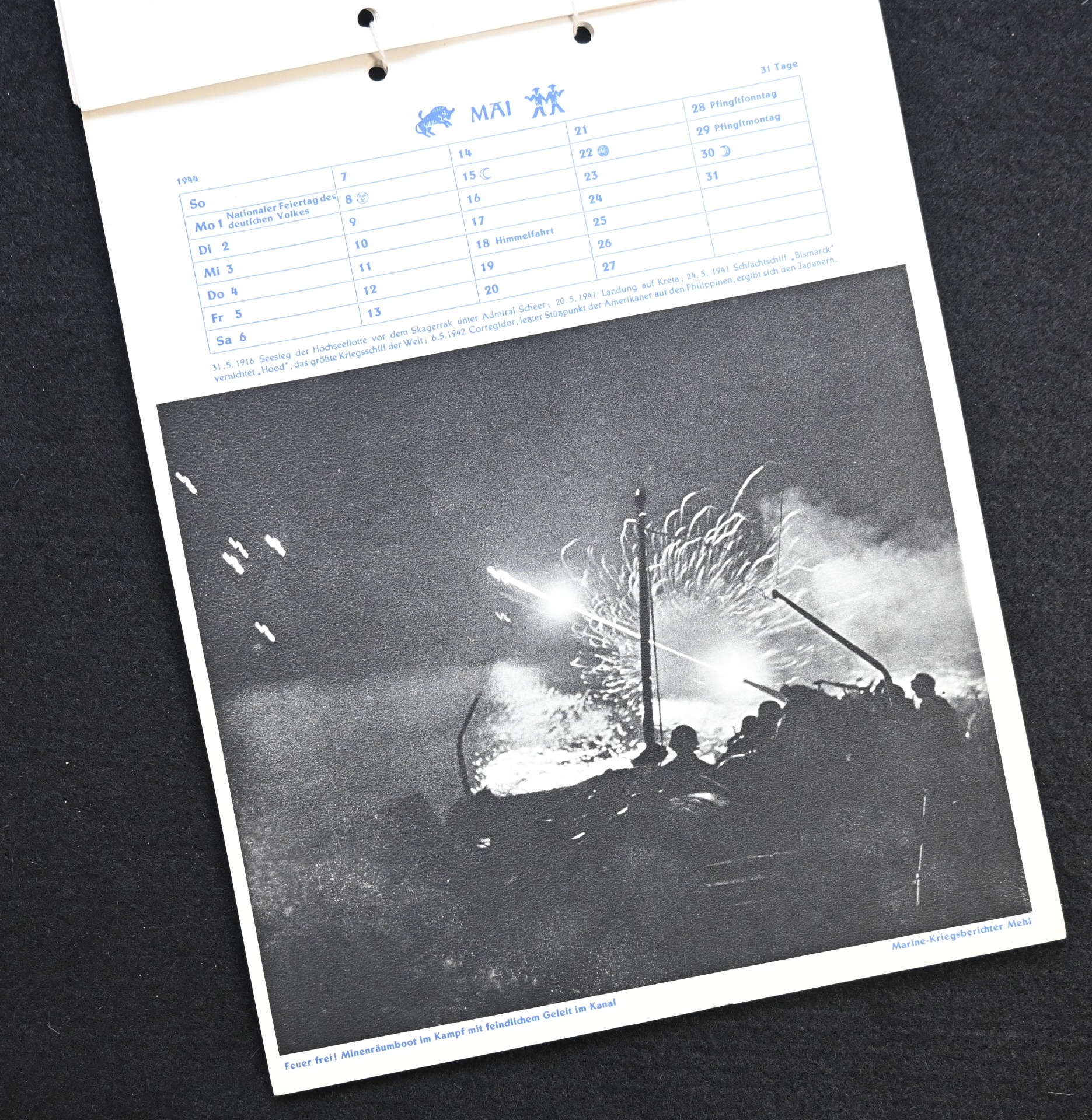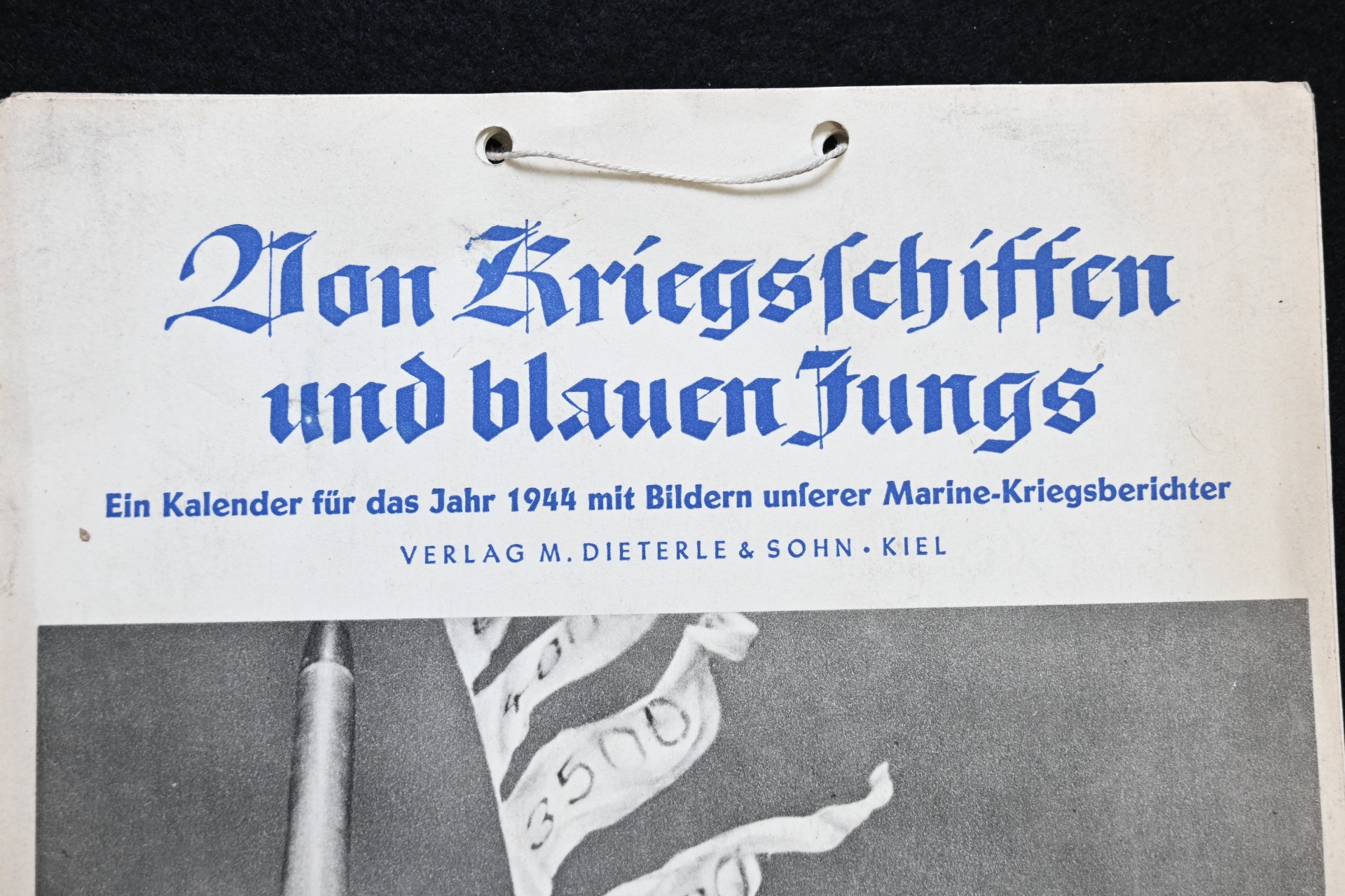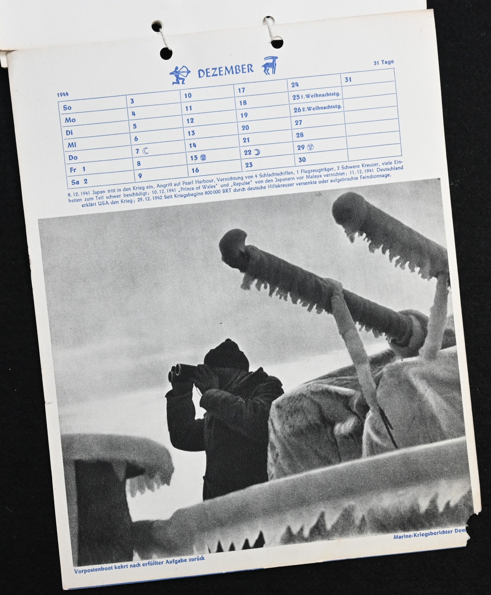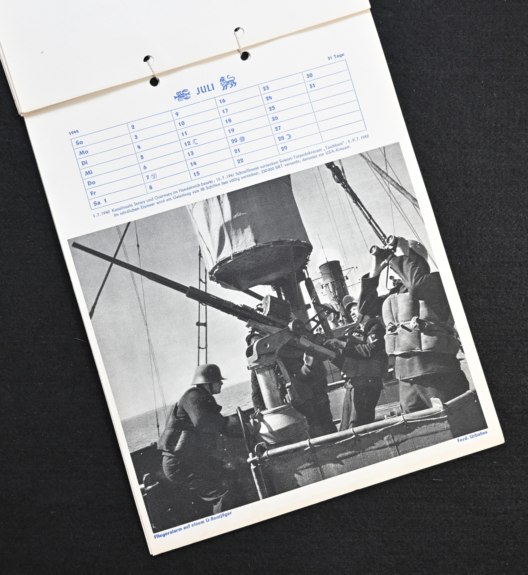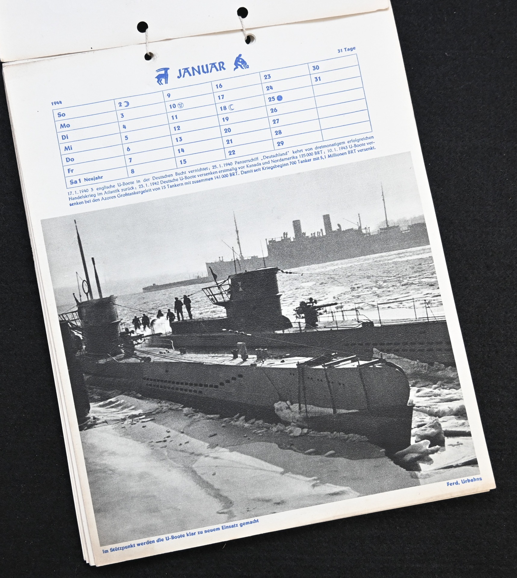 The kalender shows overall normal signs of wears. It's complete with all 13 pages. There is a awesome Kriegsmarine related photograph on each page. Issued in 1944.