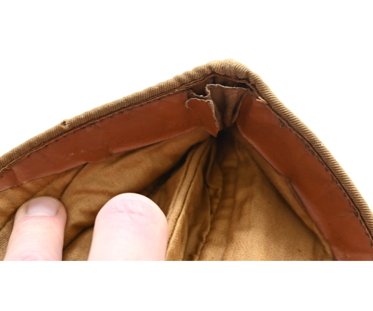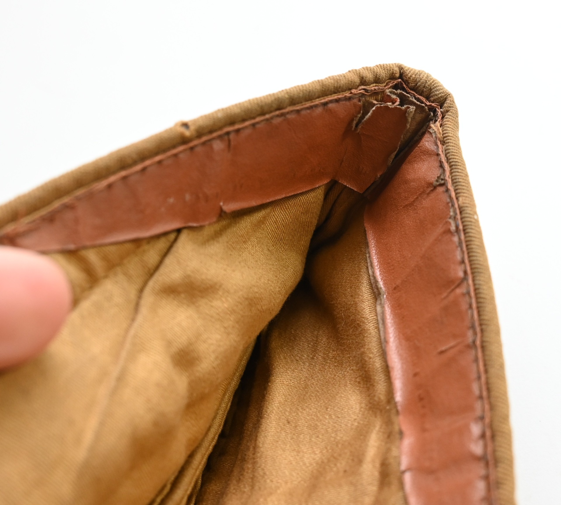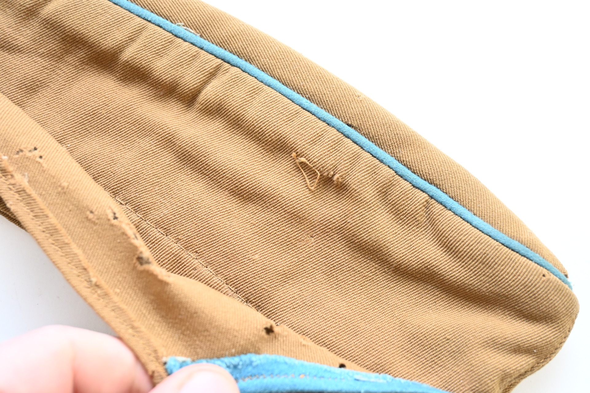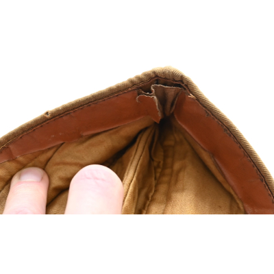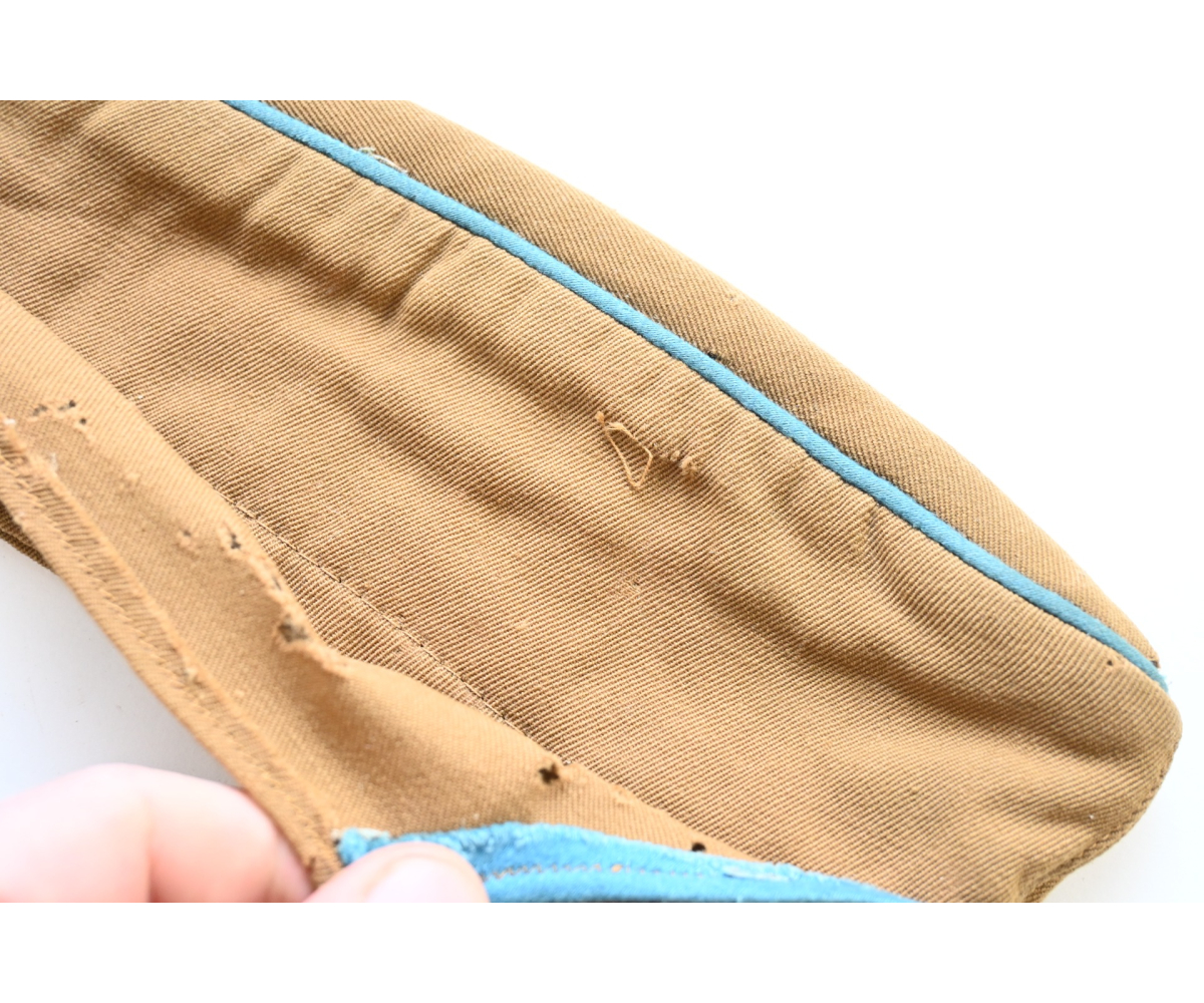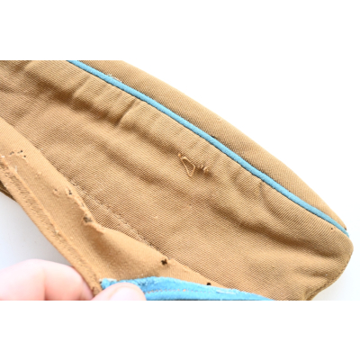 The cap shows overall signs fo wear. The left side has only 1 tiny moth hole. The right side has some more. However the blue (Ortsschule) piping is fully intact. The inside shows signs of wear, but no damages to the fabric. The artificial leather sweatband in the front is present and shows wear. It's size marked '56'.