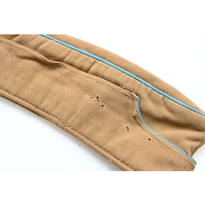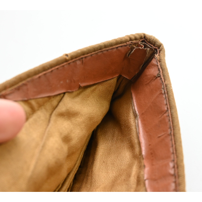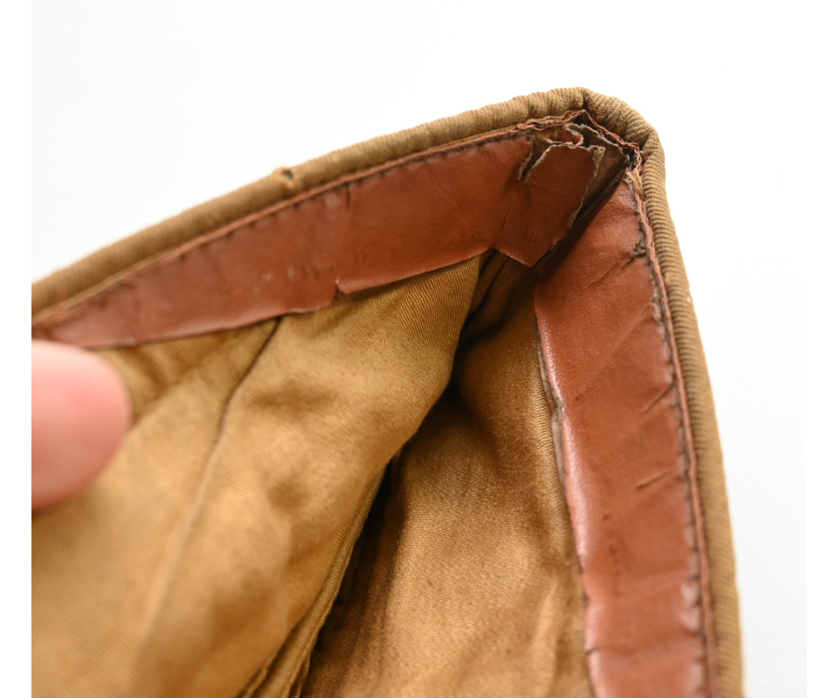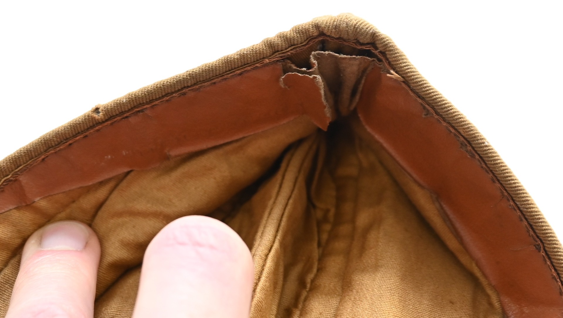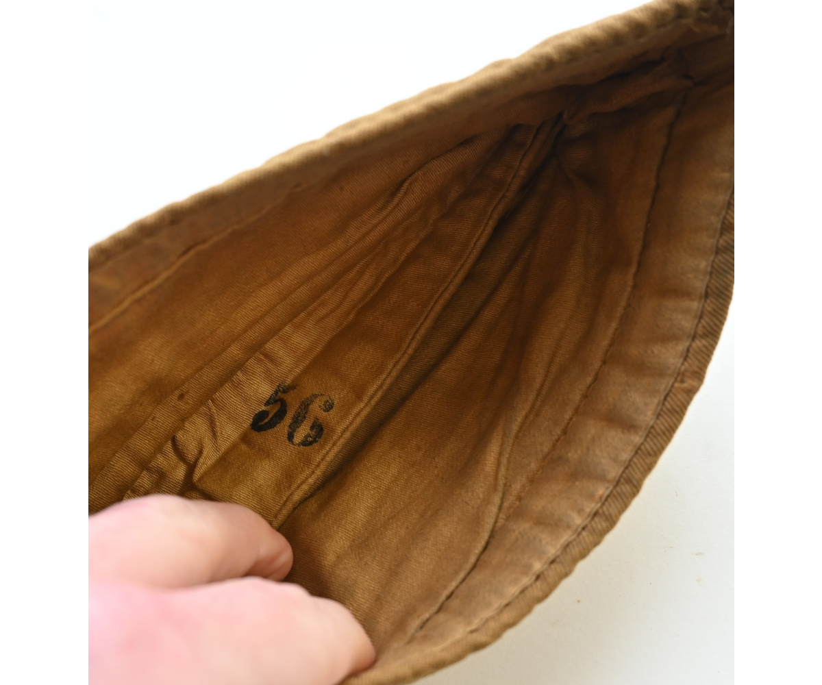 The cap shows overall signs fo wear. The left side has only 1 tiny moth hole. The right side has some more. However the blue (Ortsschule) piping is fully intact. The inside shows signs of wear, but no damages to the fabric. The artificial leather sweatband in the front is present and shows wear. It's size marked '56'.