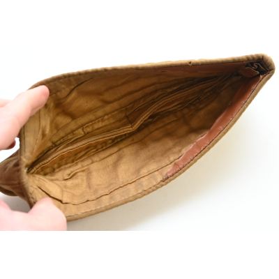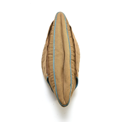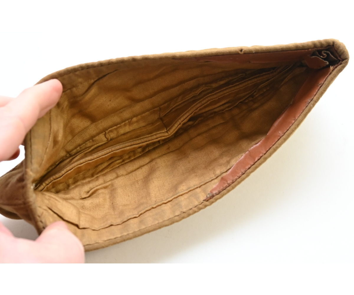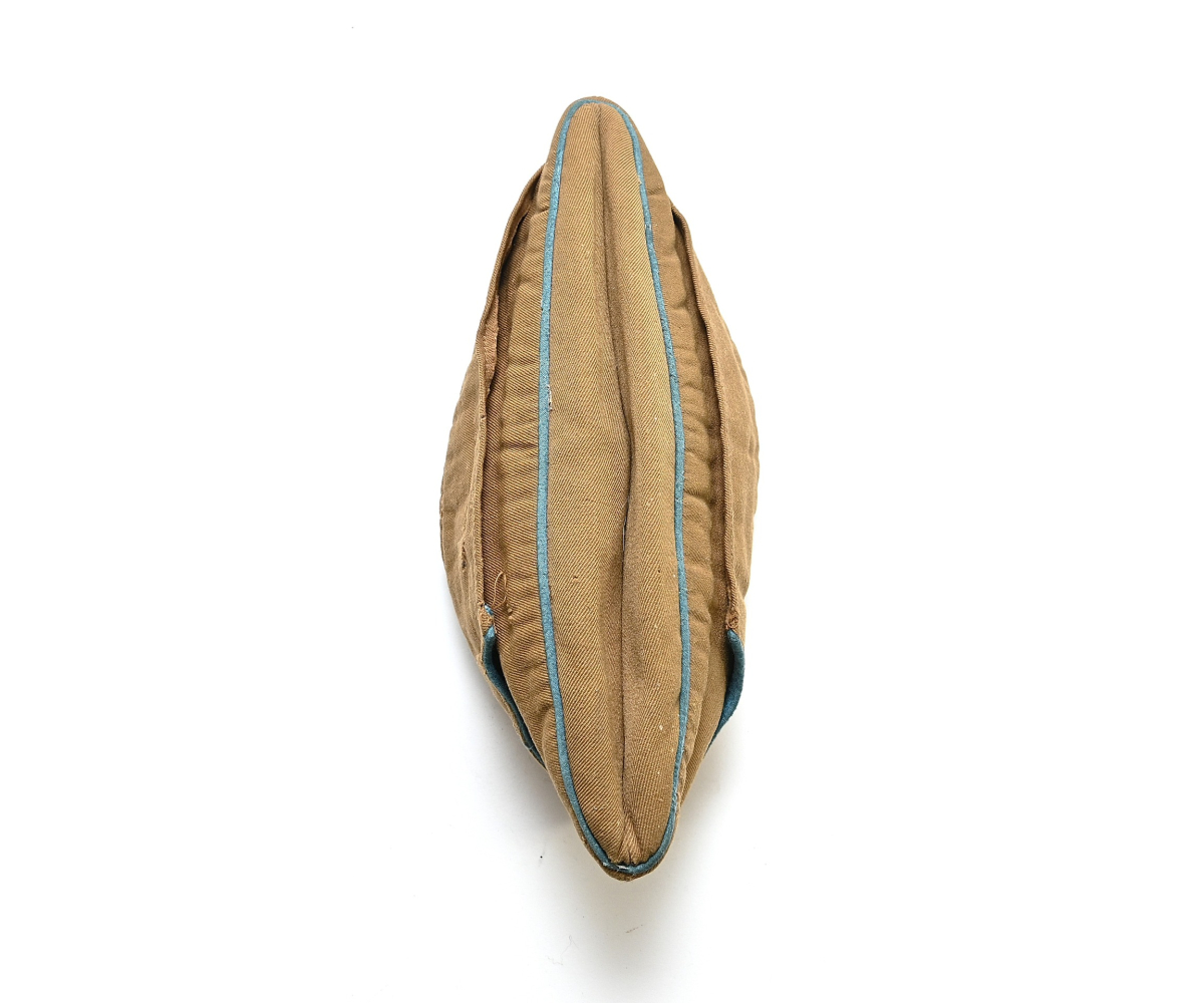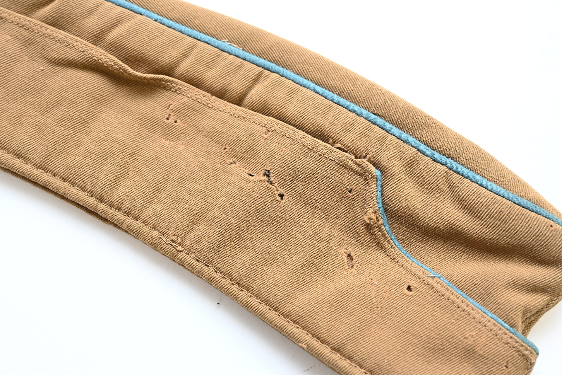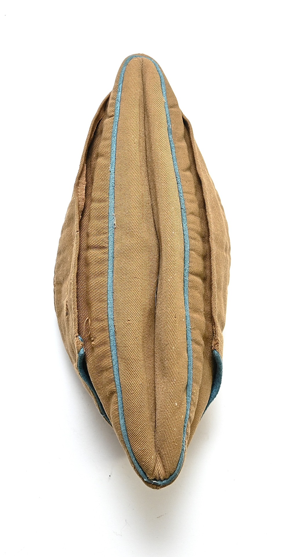 The cap shows overall signs fo wear. The left side has only 1 tiny moth hole. The right side has some more. However the blue (Ortsschule) piping is fully intact. The inside shows signs of wear, but no damages to the fabric. The artificial leather sweatband in the front is present and shows wear. It's size marked '56'.