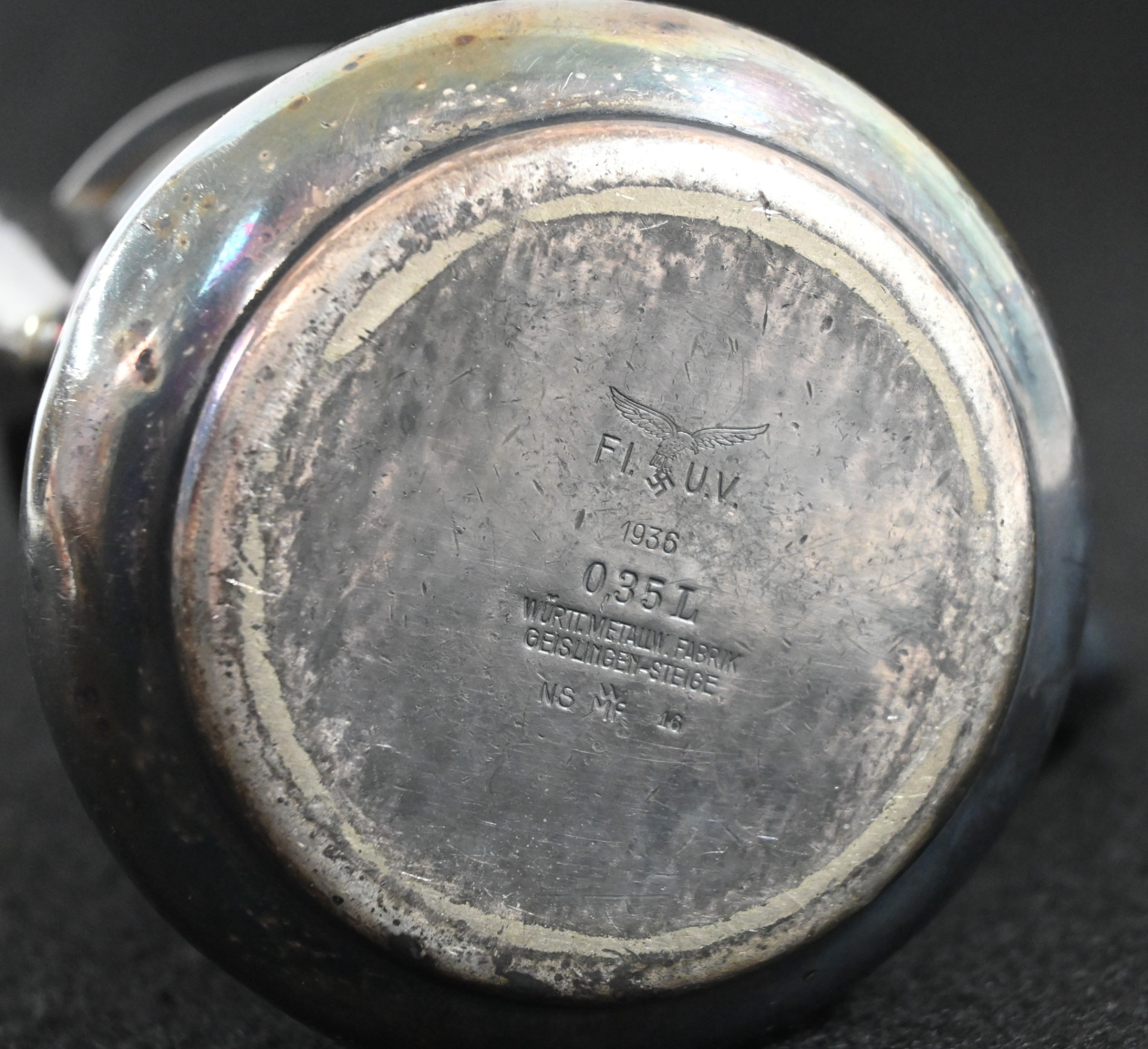 It is in excellent condition and shows only some normal signs of use. Marked on the bottom with the Luftwaffe eagle, the production date and marked by the maker 'Wurttembergische-Metallwarenfabrik' from 'Geislingen-Steige' on the bottom. It also has a silver marking and capacity mark '35cl'.