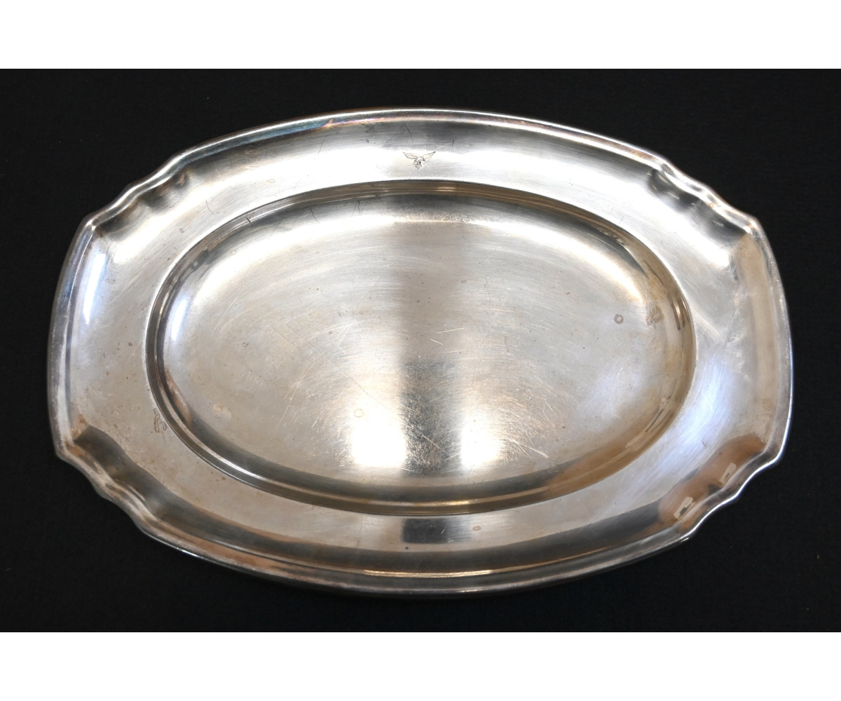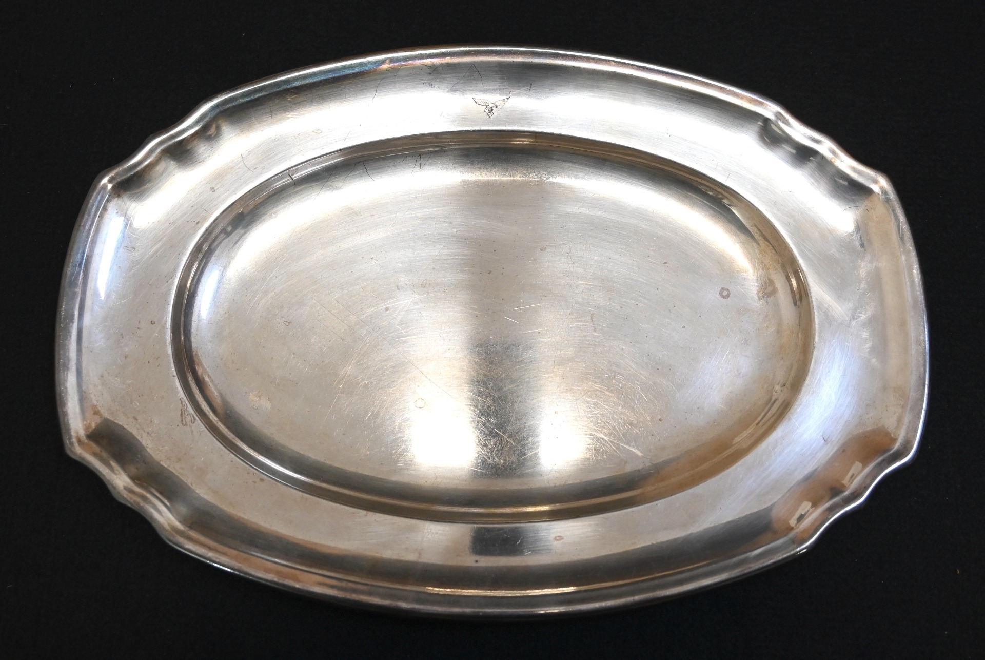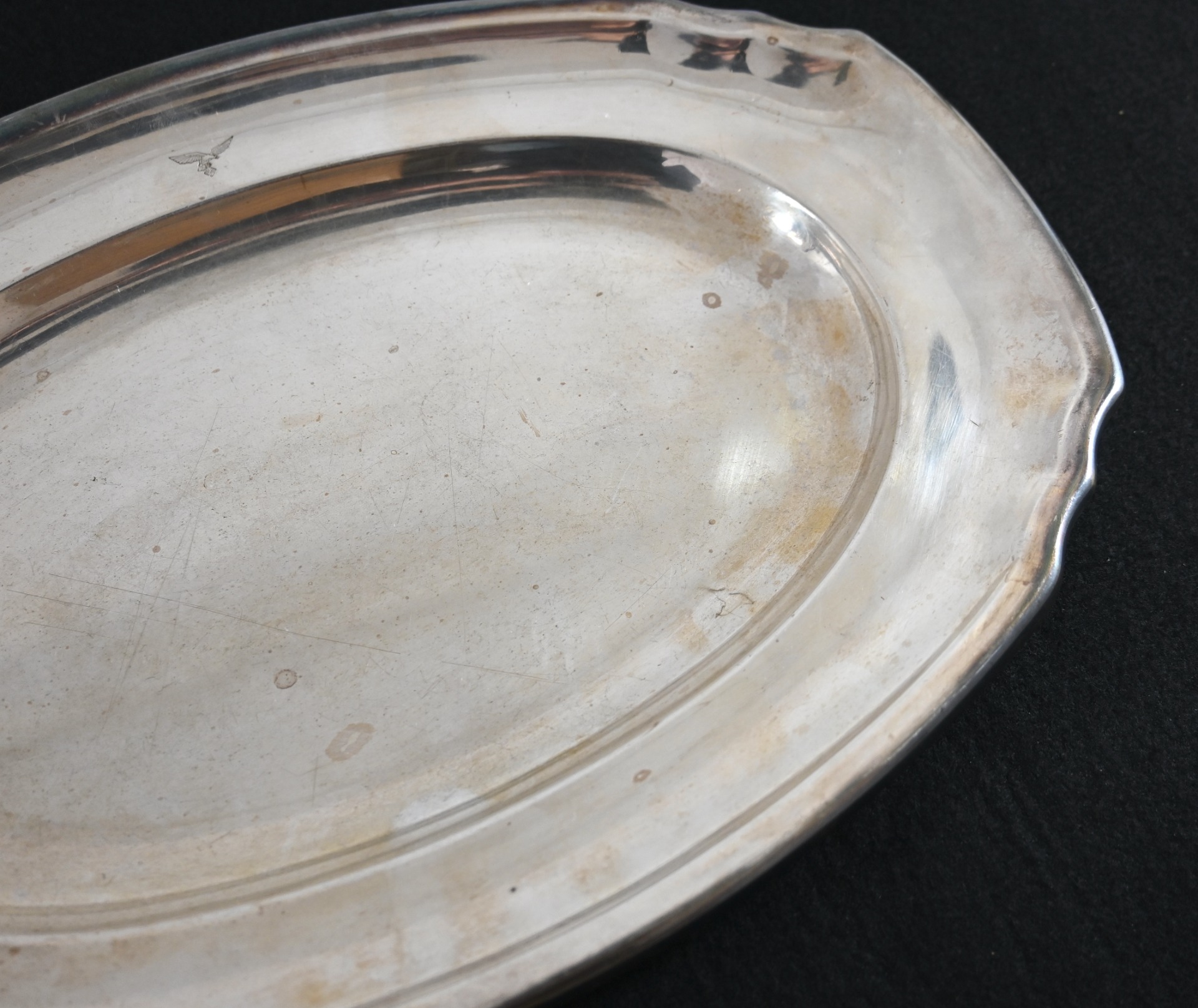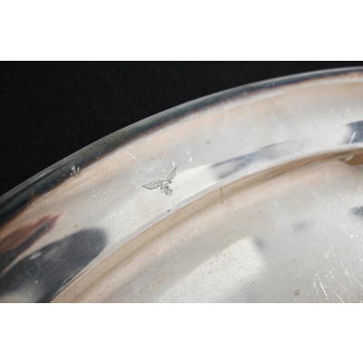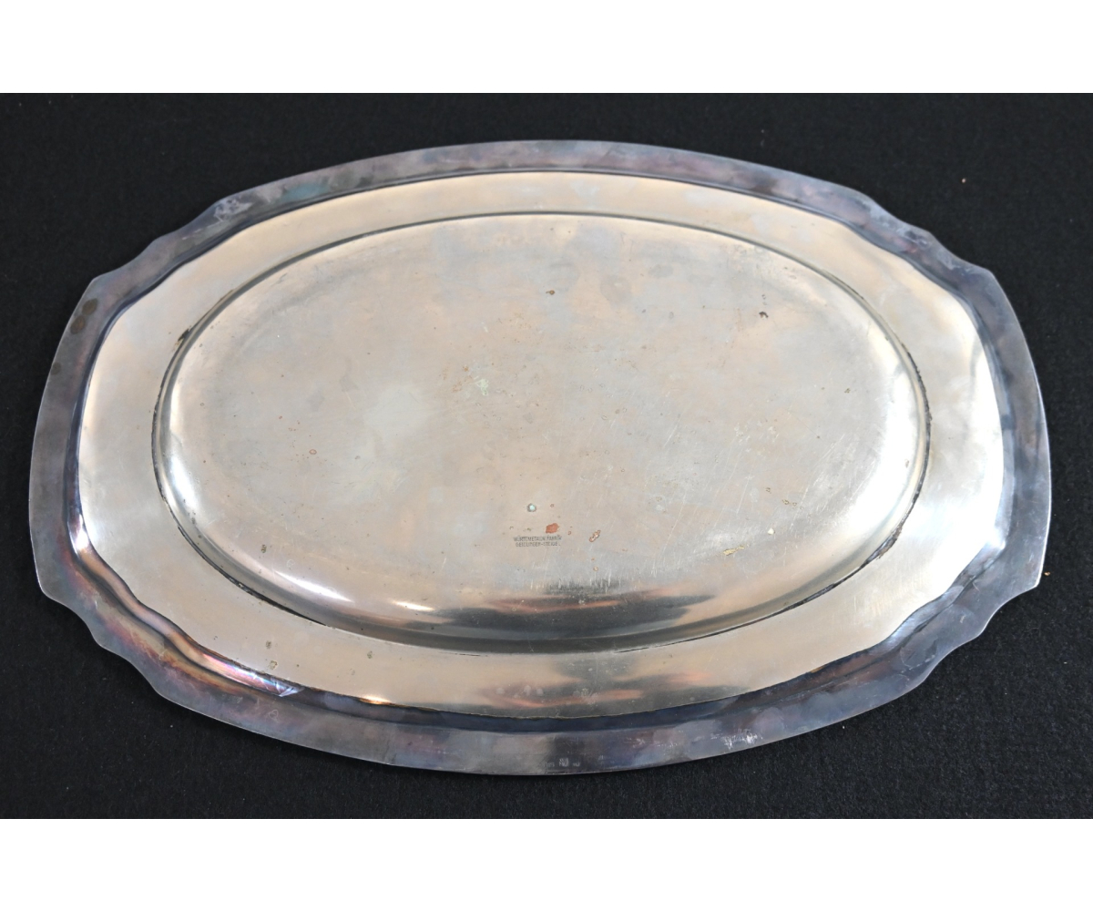 The silver-plated platter shows overall normal signs of wear. Marked on the front with the Luftwaffe eagle and marked by the maker 'Wurttembergische-Metallwarenfabrik' from 'Geislingen-Steige' on the back. The platter measures 37cm * 25cm.