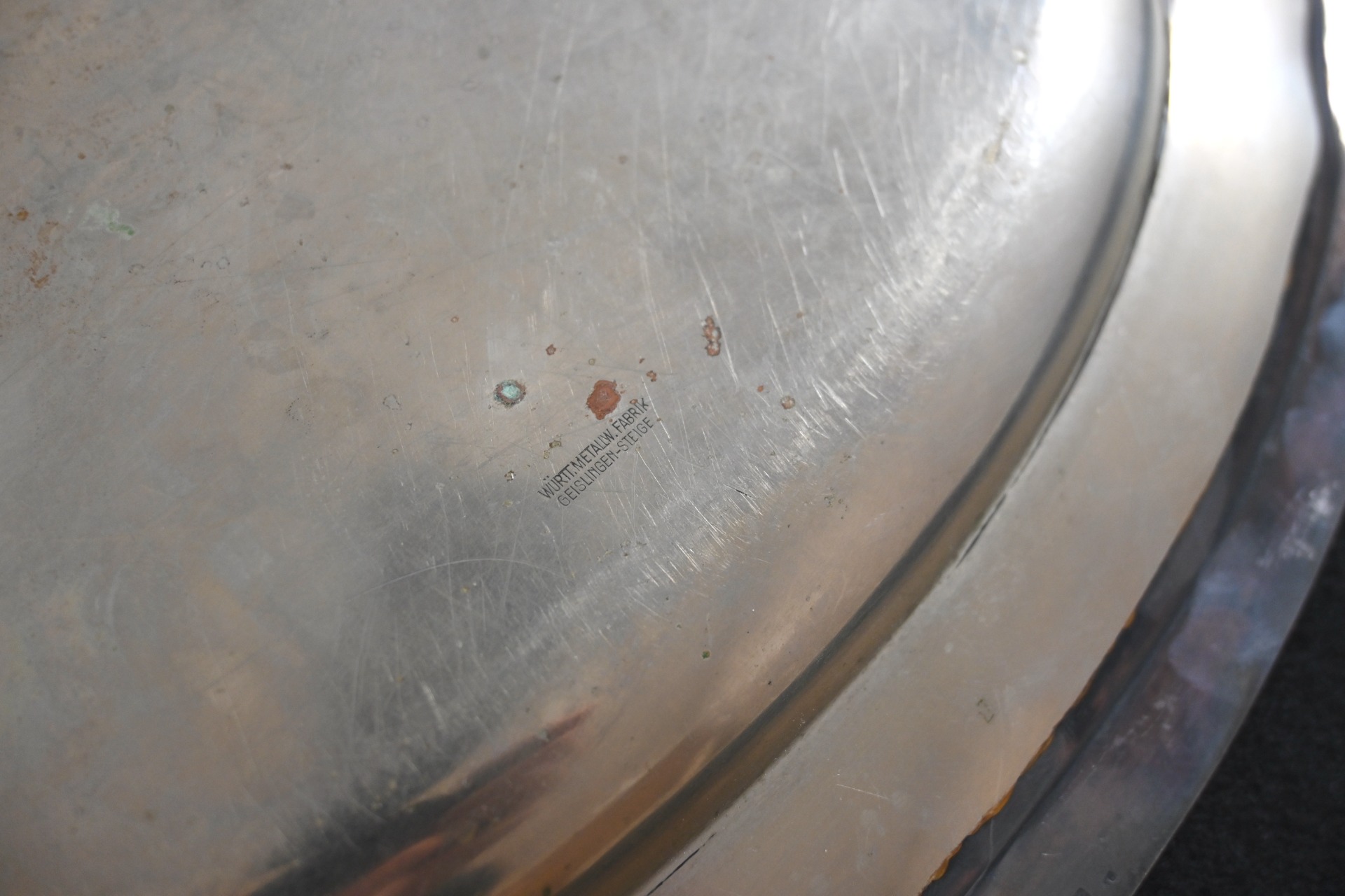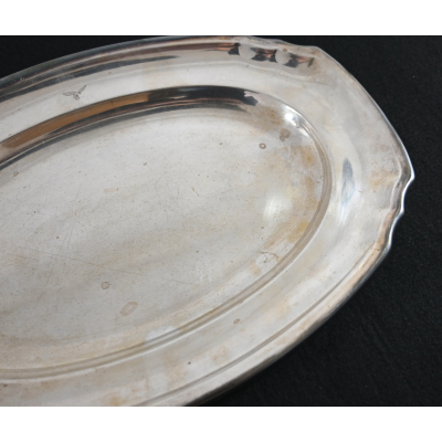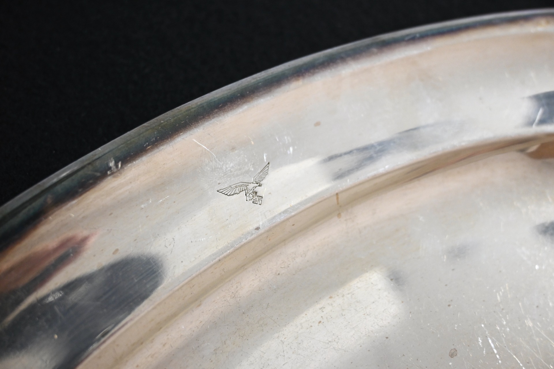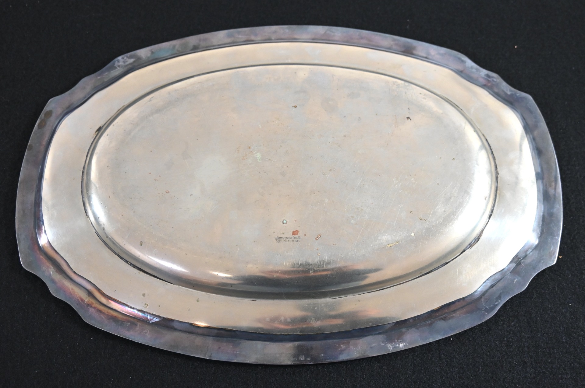 The silver-plated platter shows overall normal signs of wear. Marked on the front with the Luftwaffe eagle and marked by the maker 'Wurttembergische-Metallwarenfabrik' from 'Geislingen-Steige' on the back. The platter measures 37cm * 25cm.