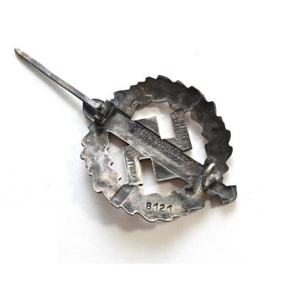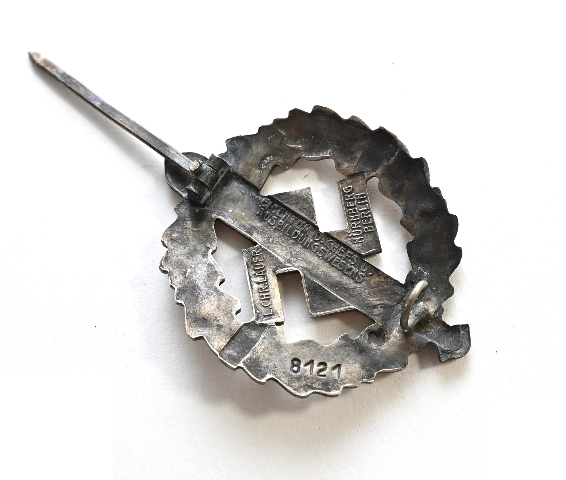 SA Sportabeichen in bronze were awarded to those who had successfully passed an educational and physical program. This particular example has an extremely low issue number '8121' which makes it very rare. Consider that by December 1936 one million SA Sportabzeichen had been issued and by the end of 1943 (now called the SA Wehrabzeichen) more than 2.5 million had been issued.