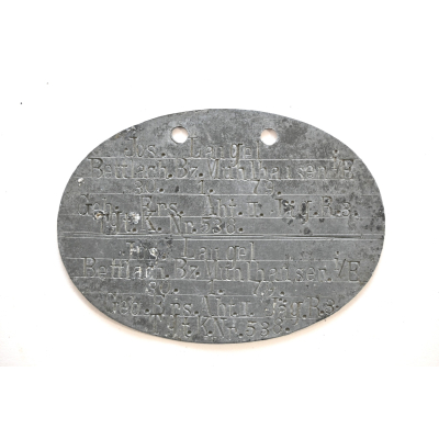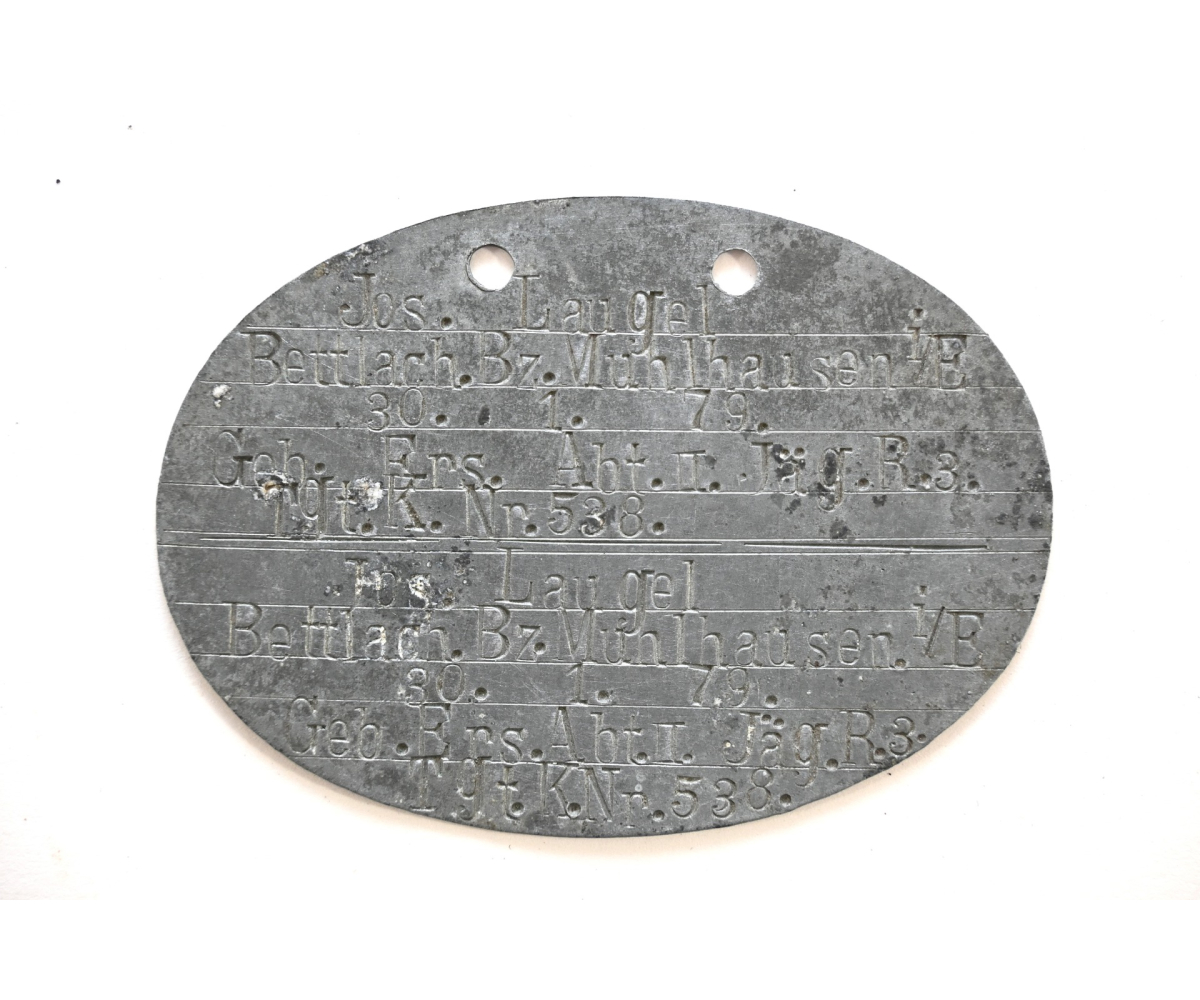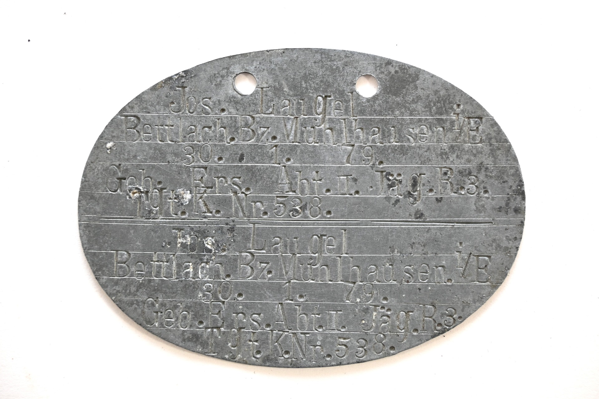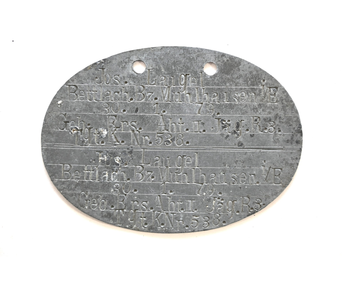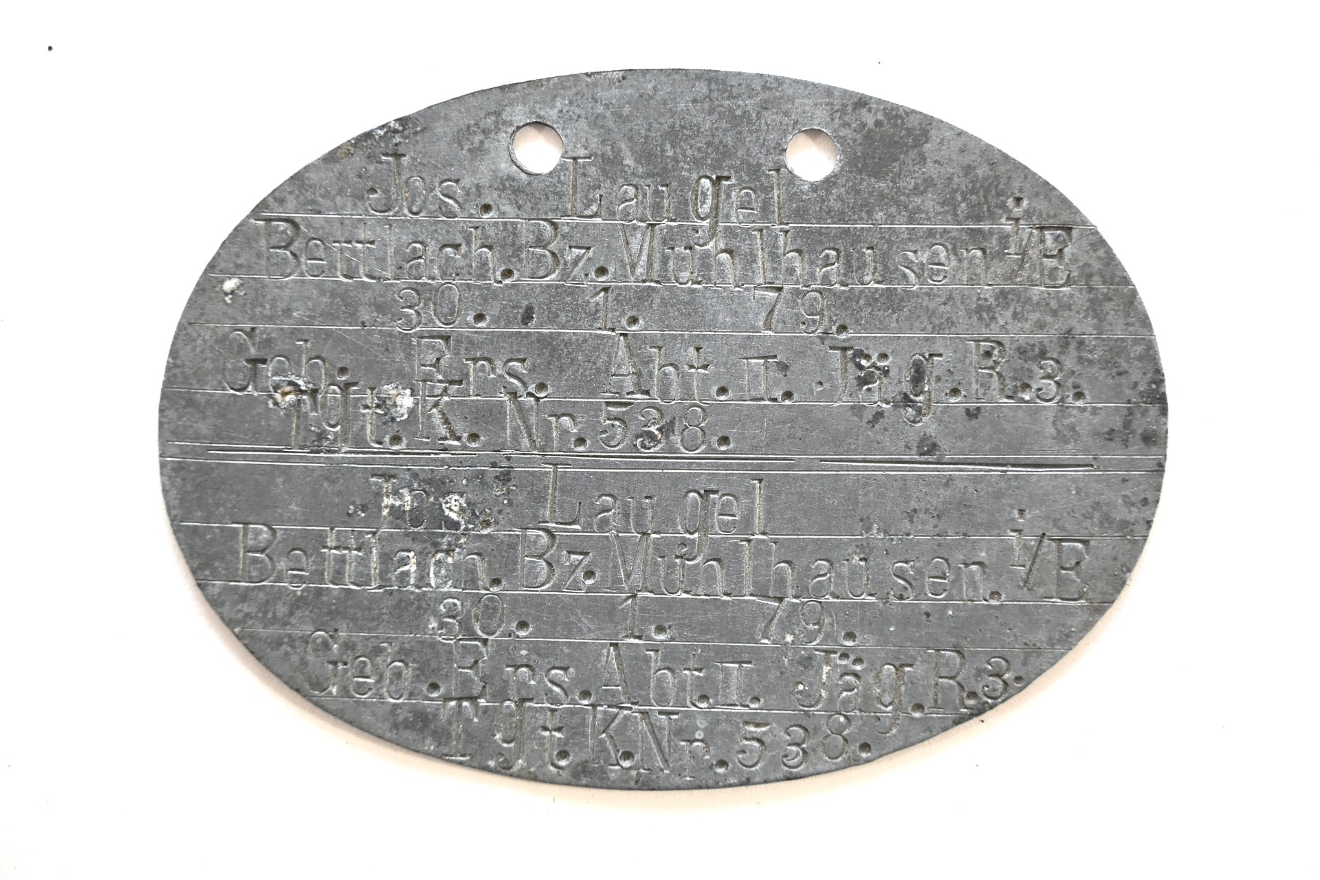 The tag shows overall normal signs of wear. It belonged to Joseph Laugel who served in the Gebirgs Ersatz Abteilung II.Bataillon Jäger Regiment 3 Tragtier Kompanie. This unit was formed in 1915 for the Alpenkorps. This korps operated in Tiorl, Serbia, Greece and from March 1916 onwards on the western front in Verdun, Fleury and Thiaumont. It then moved back to the east were it operated in Rothen-Turm-Paß, Arges, Rimnicul-Sarat and Rumania. In September 1917 it operated in Italy in areas like Isonzo, Alpen and Udine. In Janaury 1918 it moved back to France Vogesen, then Flandersin Belgium and then France again.
